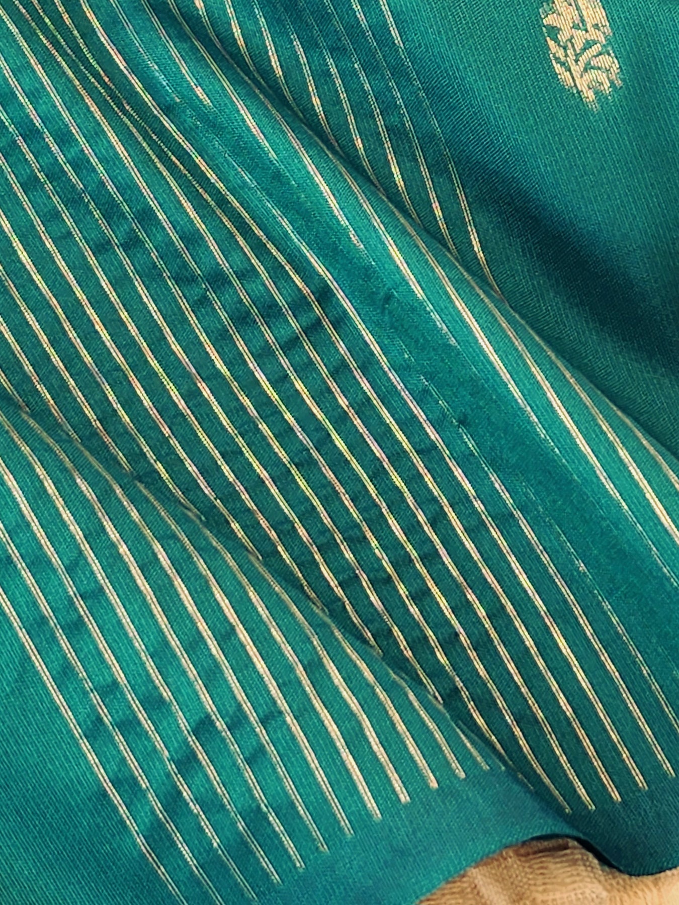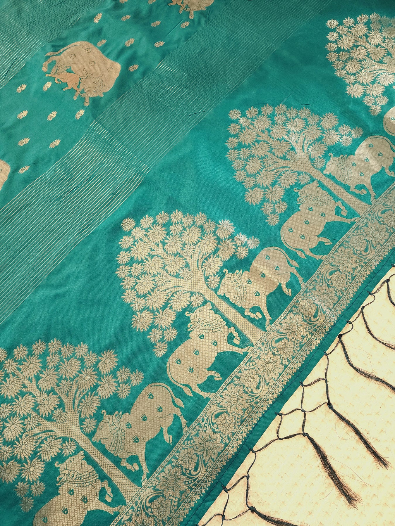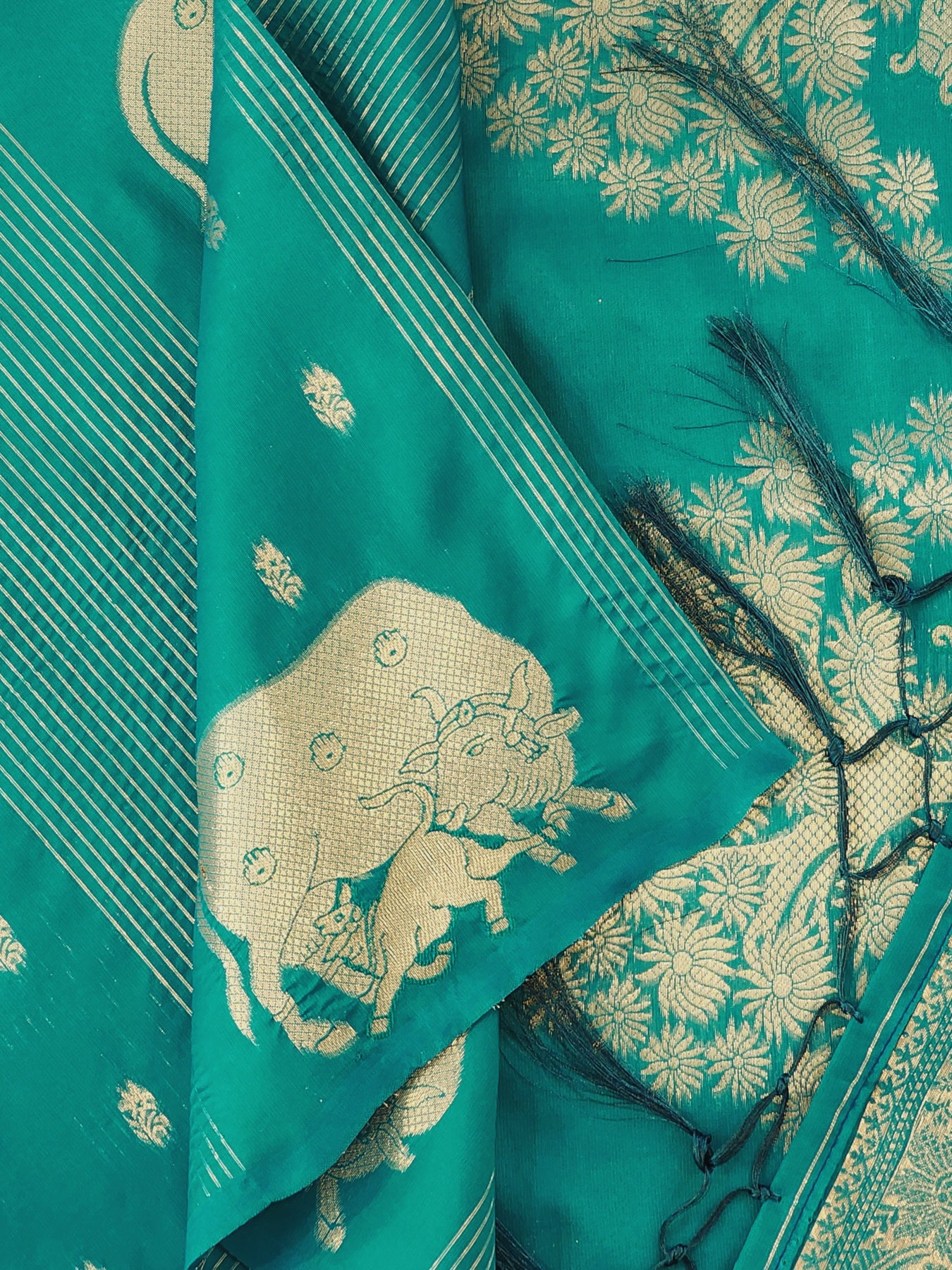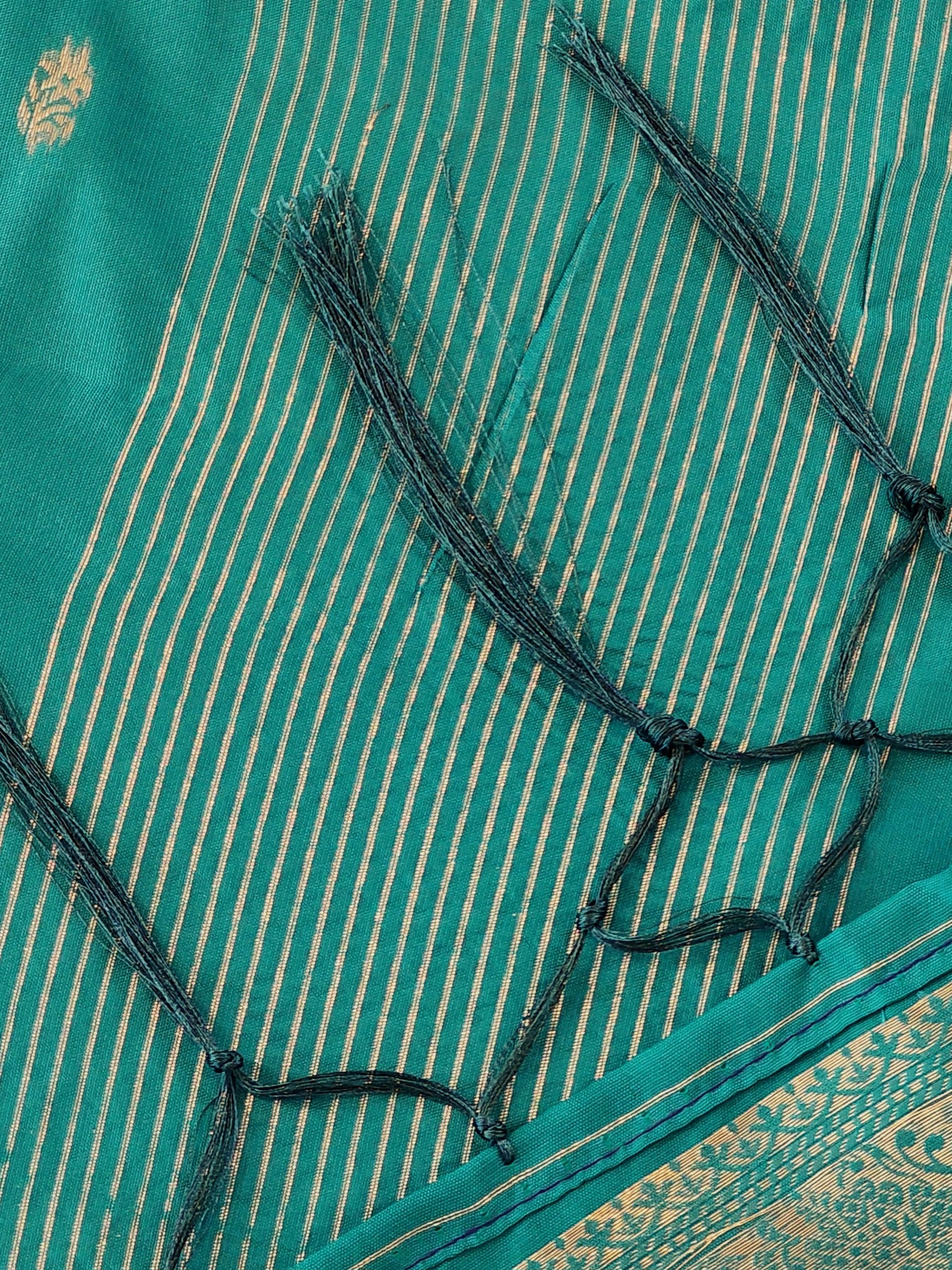 Teal Semi-Silk Saree with intricately woven motifs on the body and a contrast blouse, beautifully finished with tassels