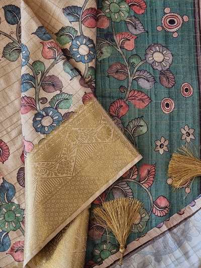 Tussar Silk Saree with Digital Floral Prints and Gold Detailing