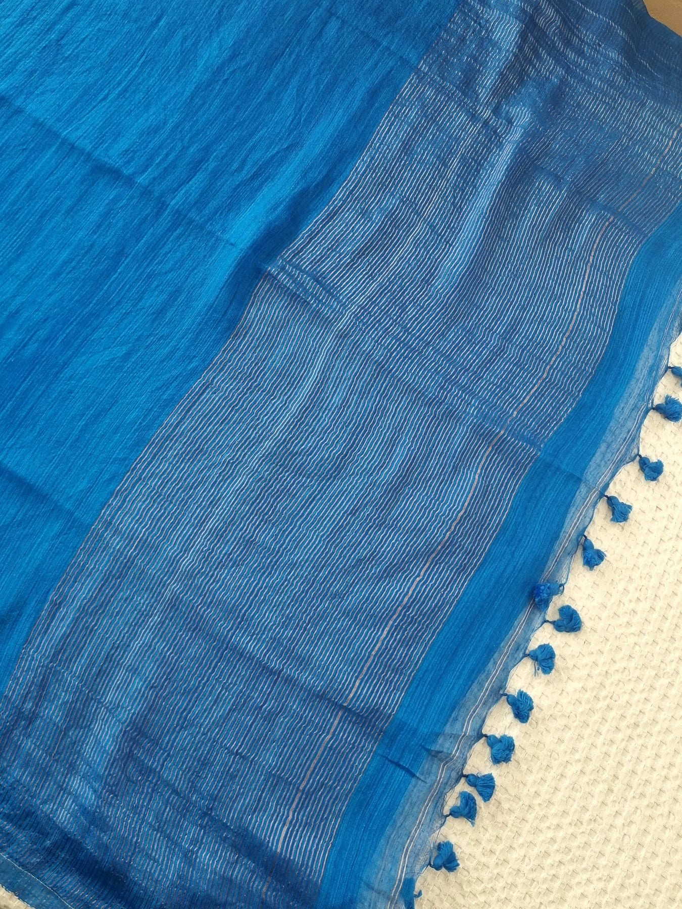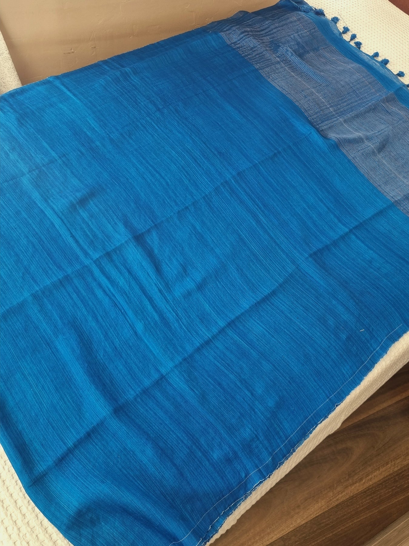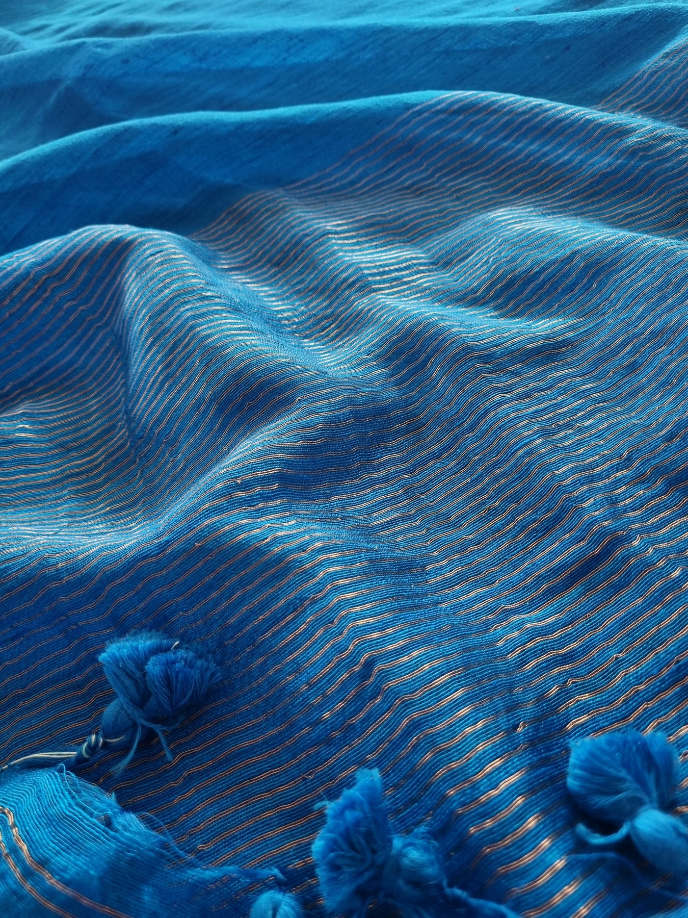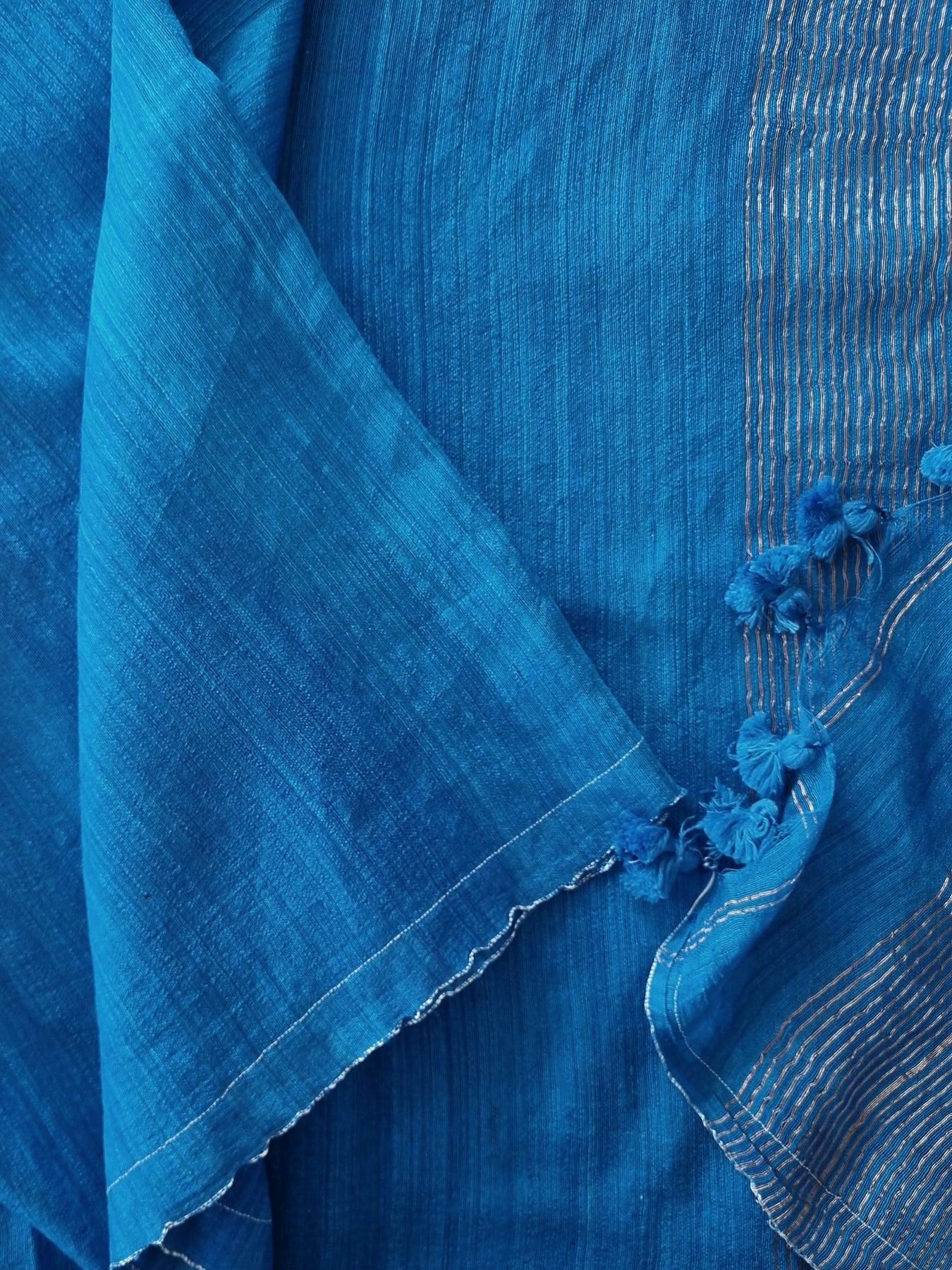 An elegant Blue Pure Matka Silk Saree with a striped pallu, beautifully finished with tassels