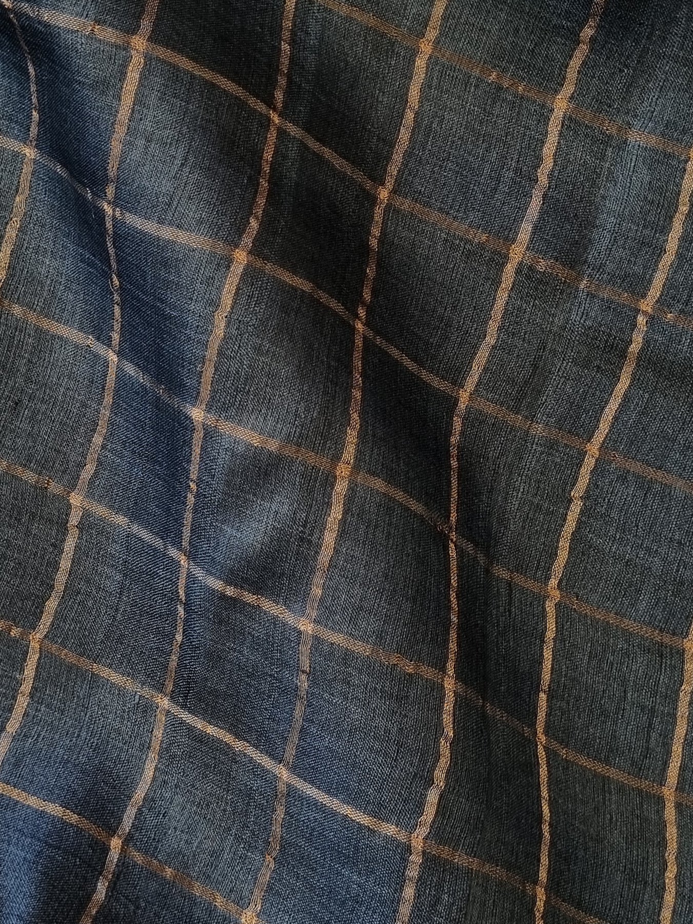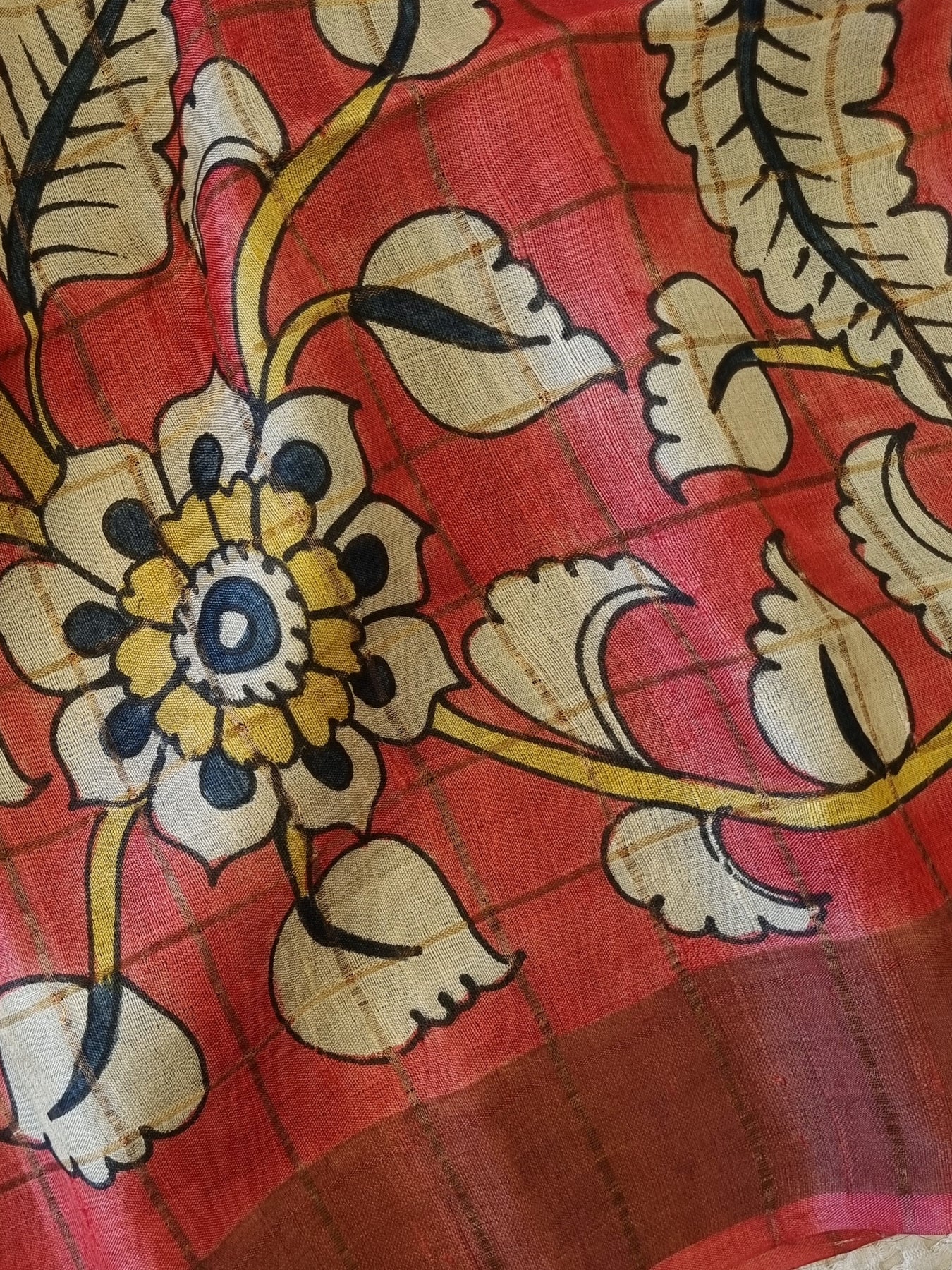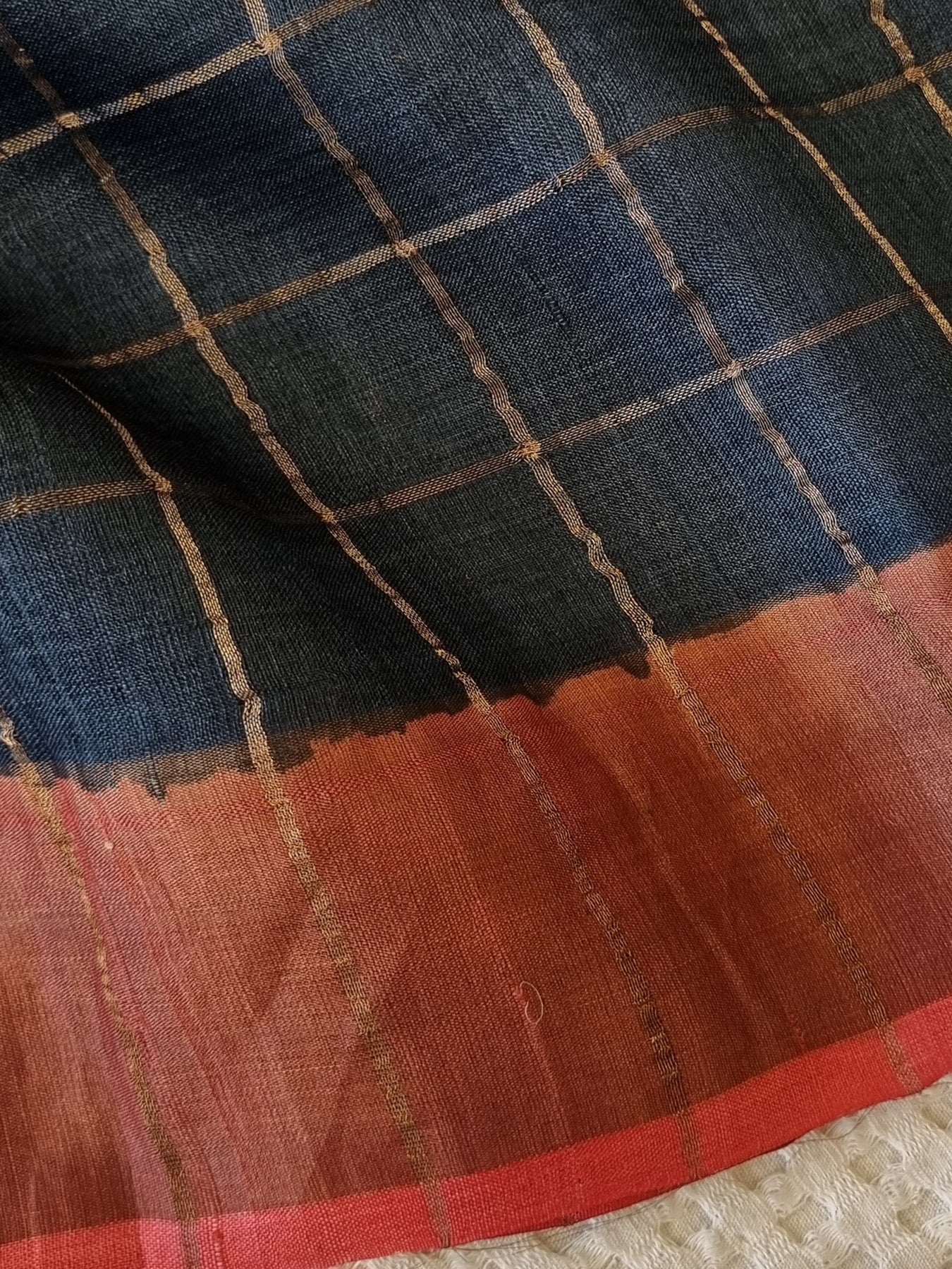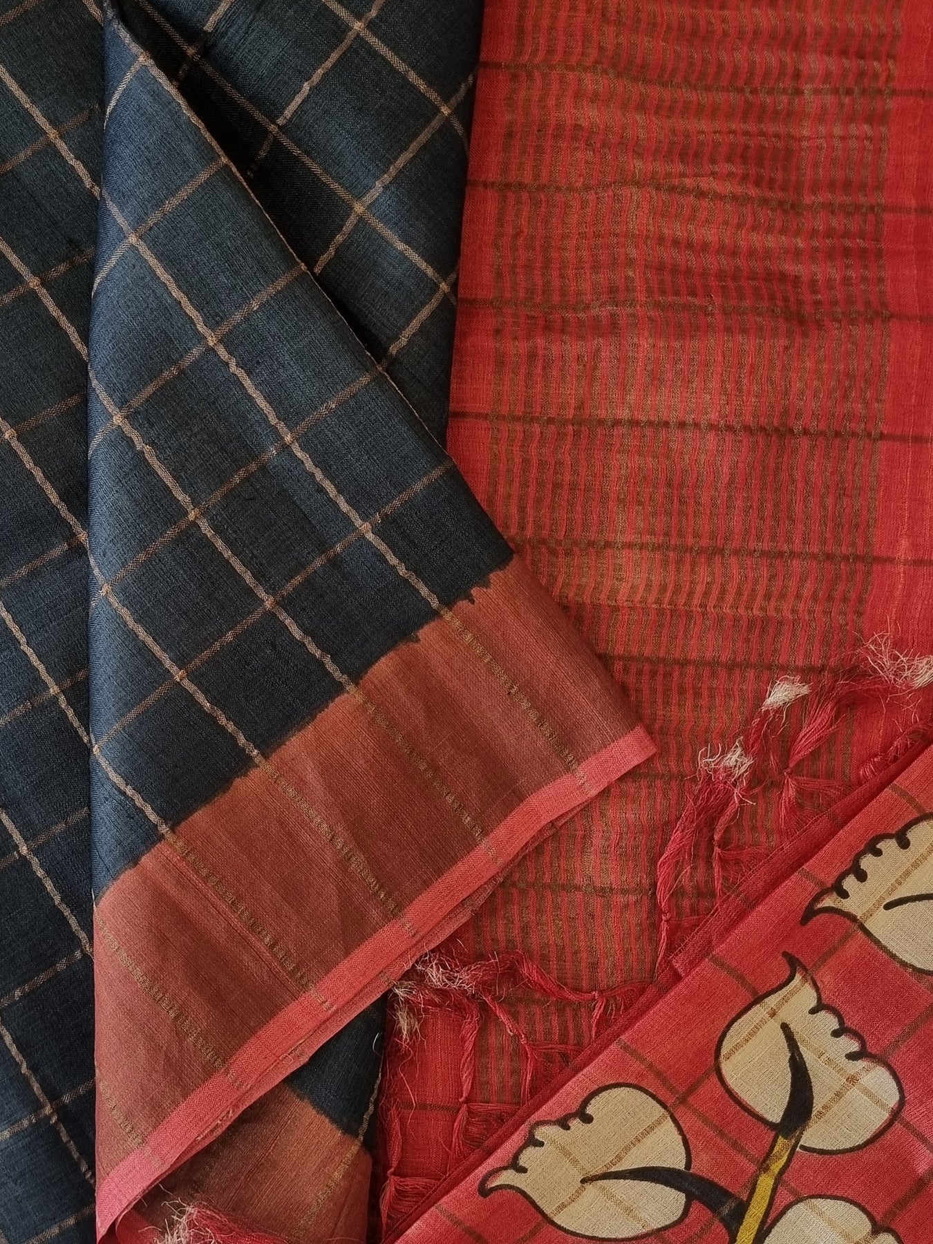 A Grey Checked Handloom Tussar Silk Saree with Handpainted Pichwai prints