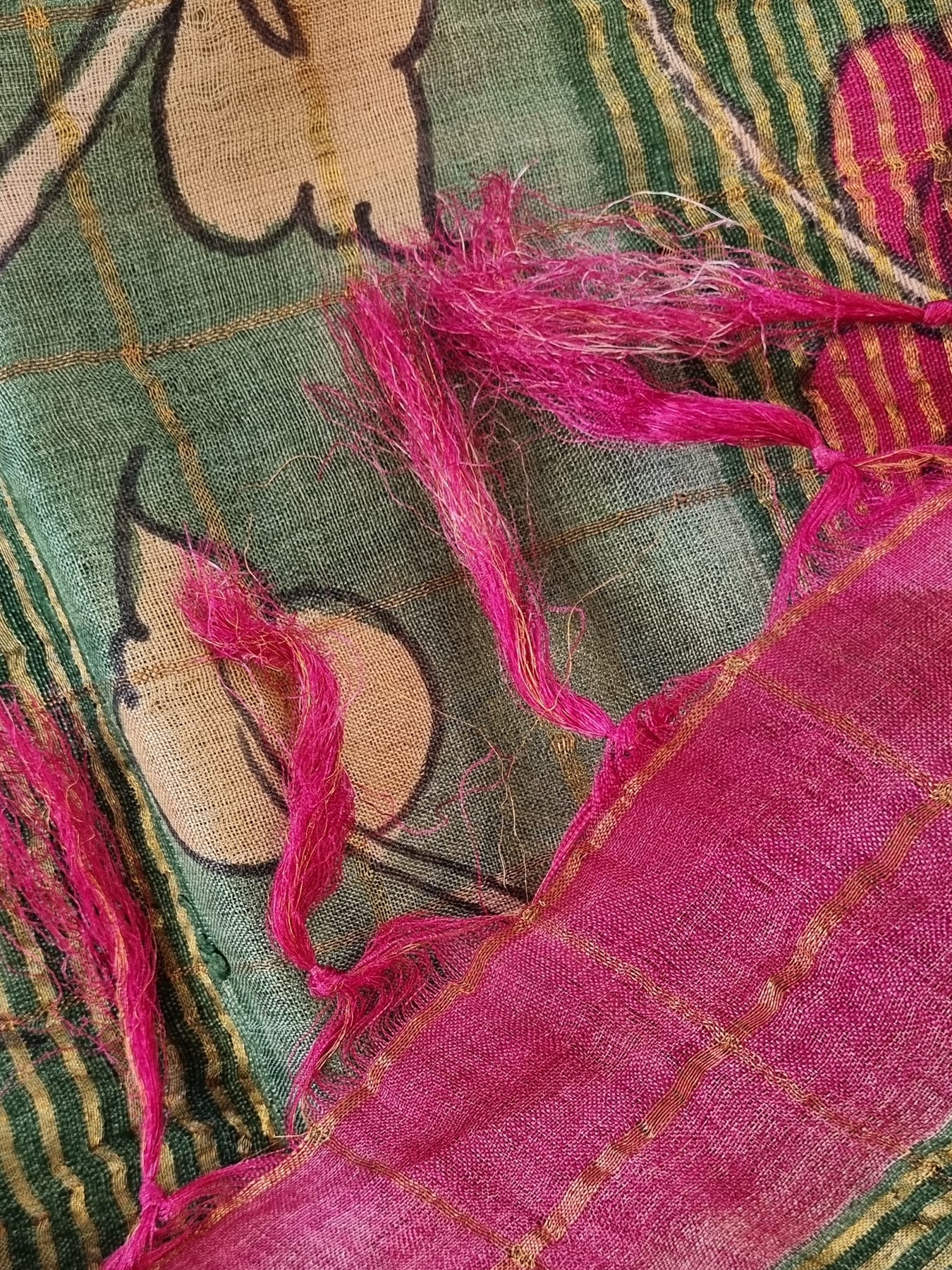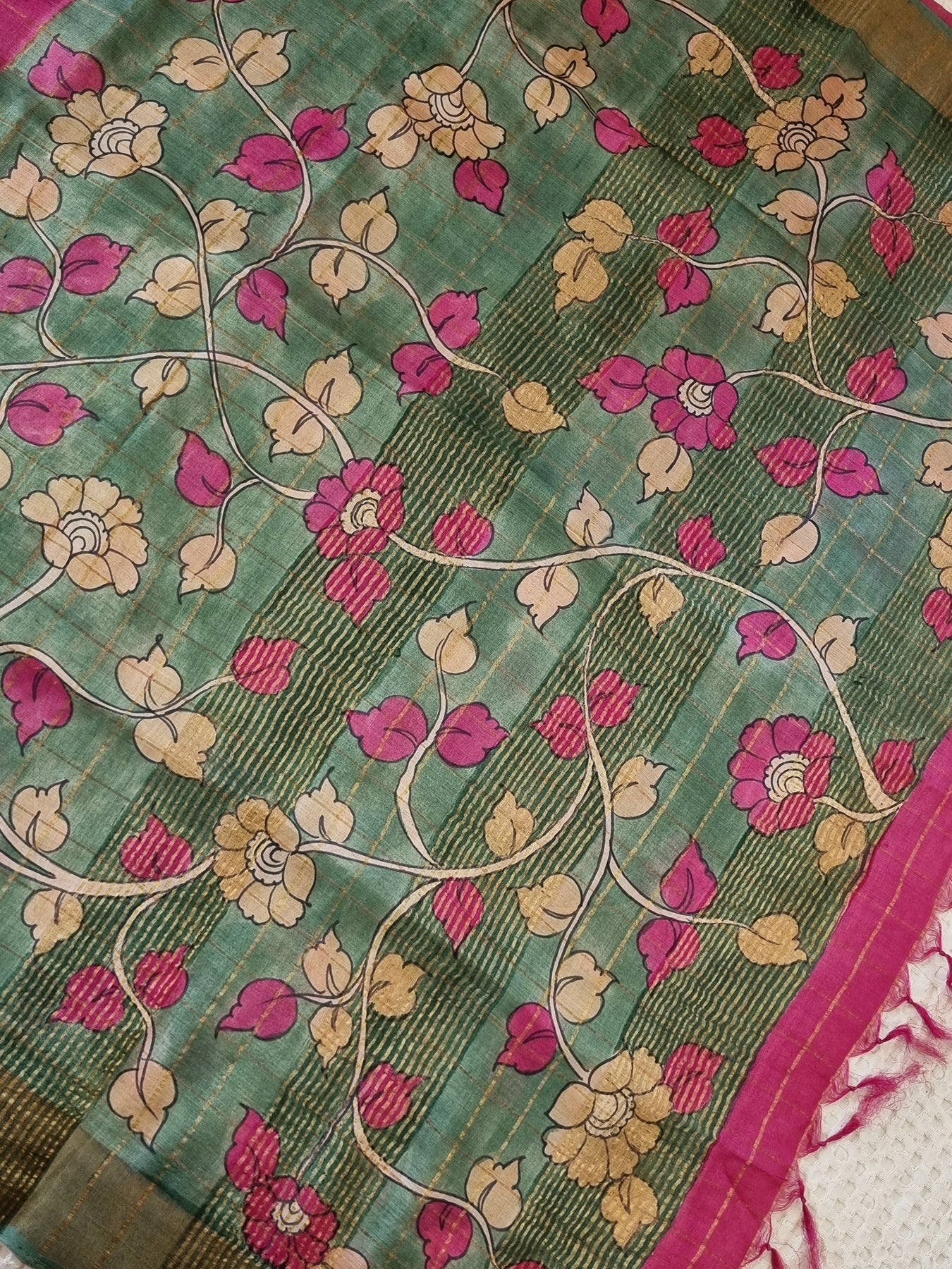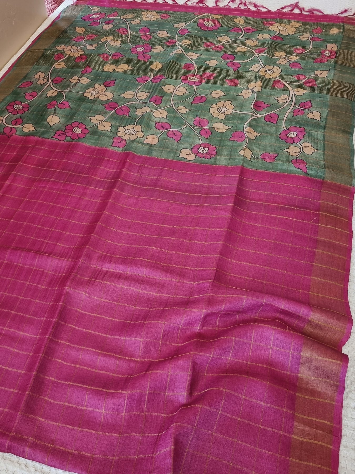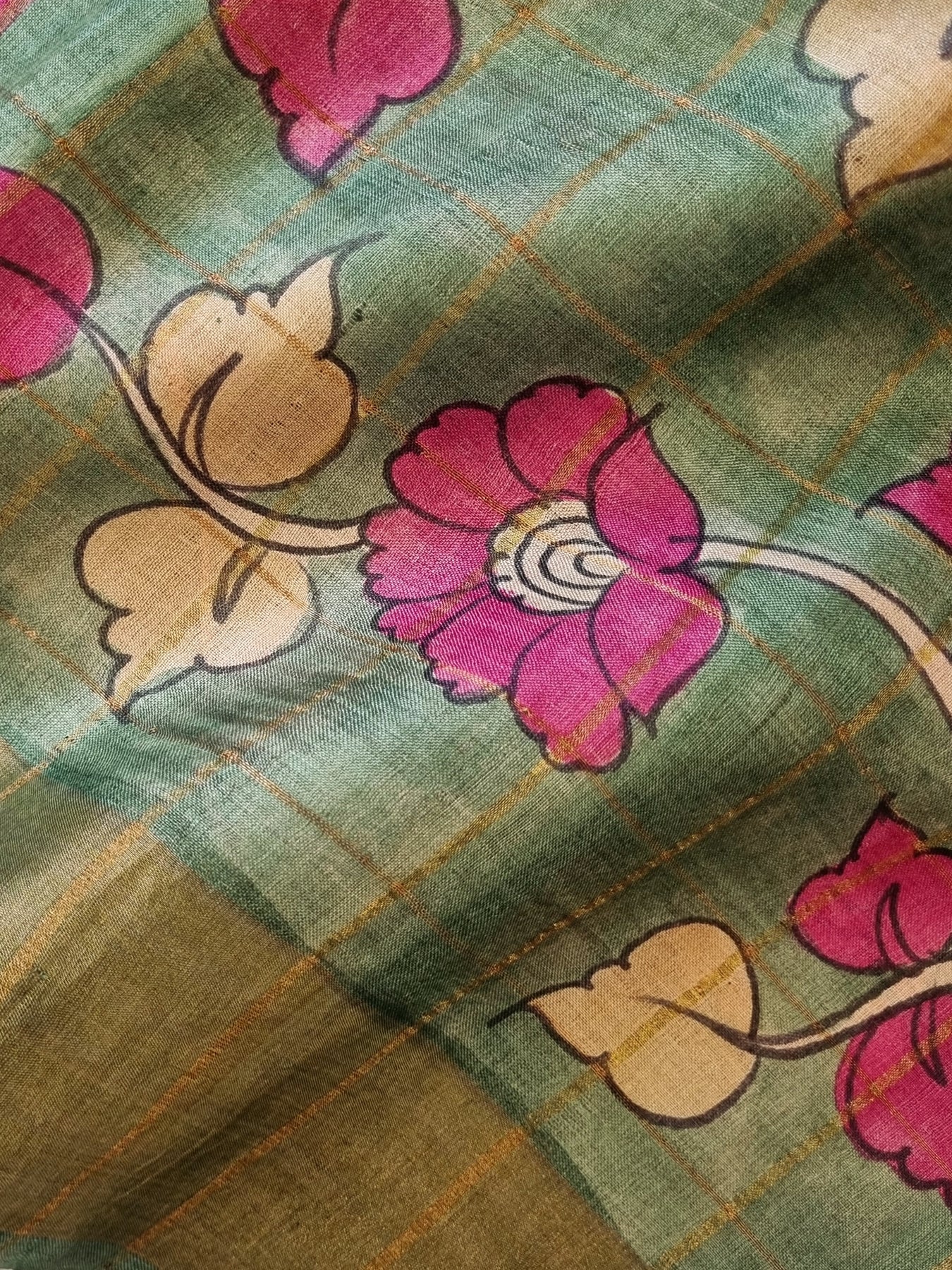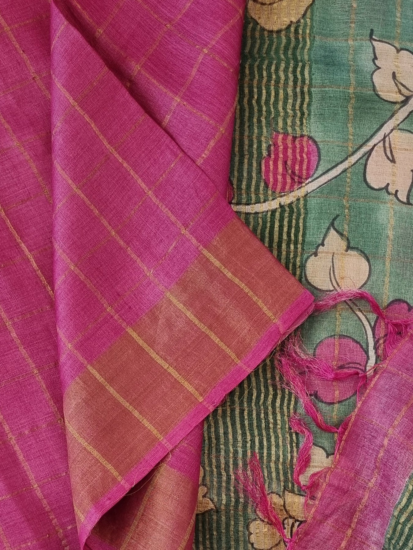 Checked Handloom Pure Tussar Silk with Contrast Kalamkari Pallu