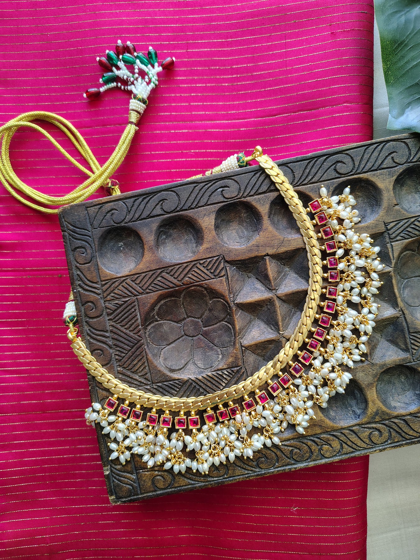 An elegant Guttapusalu necklace set, ornated with pink stones, paired with matching Studs