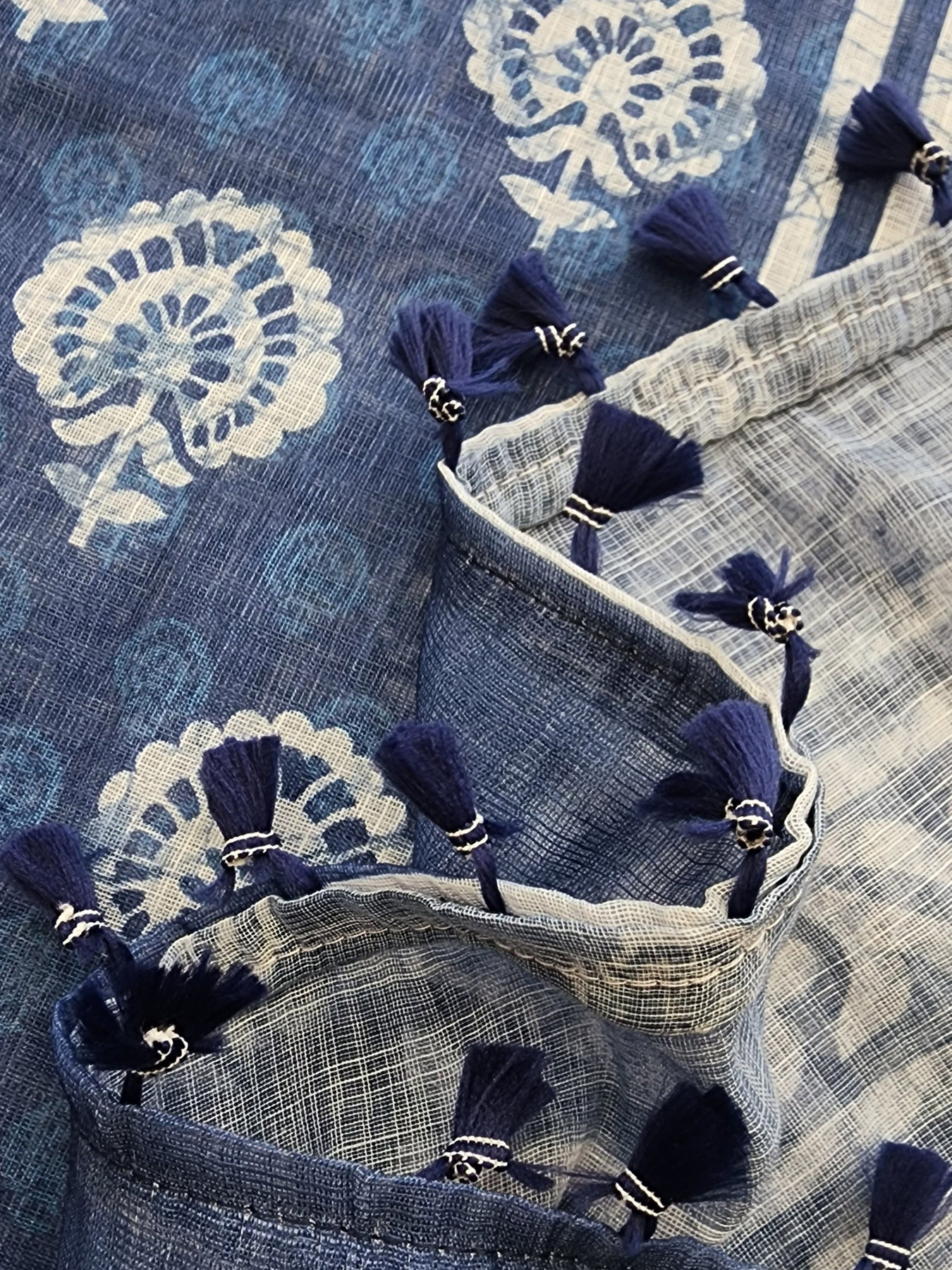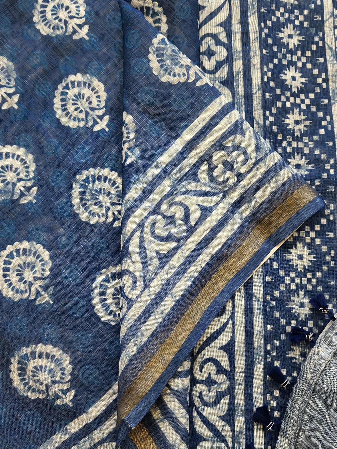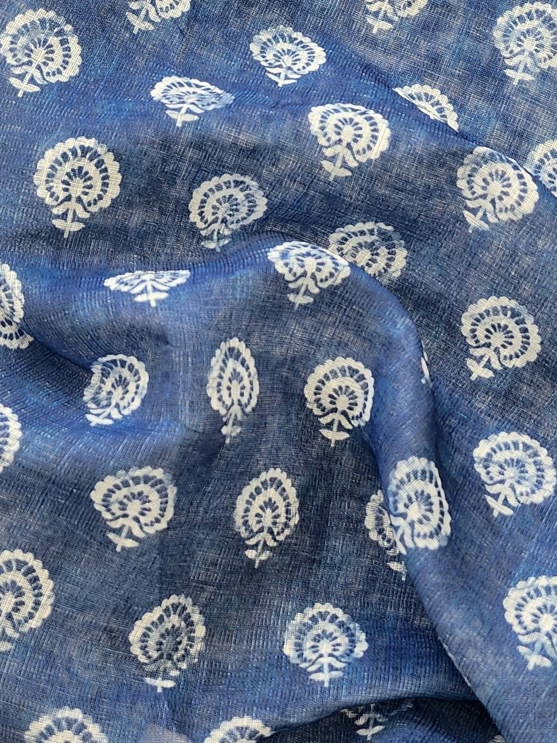 An elegant Blue Linen Cotton Saree with contrast Borders and Pallu