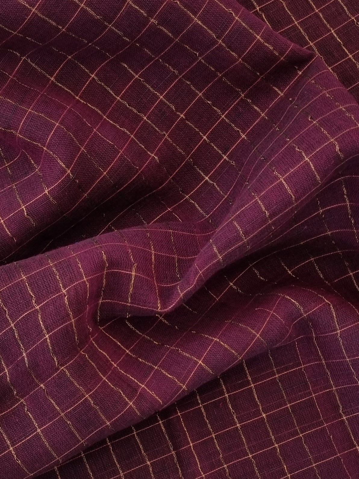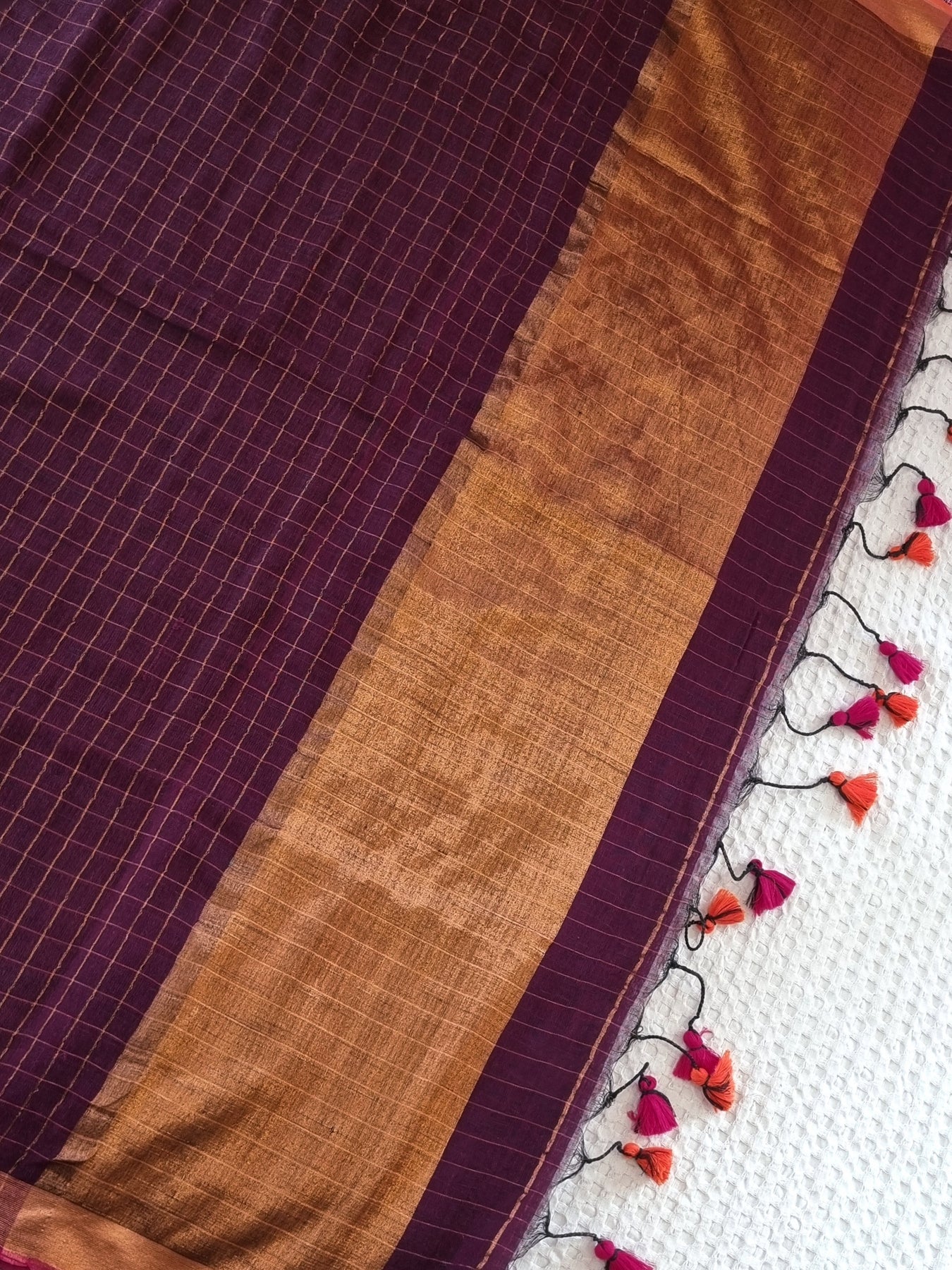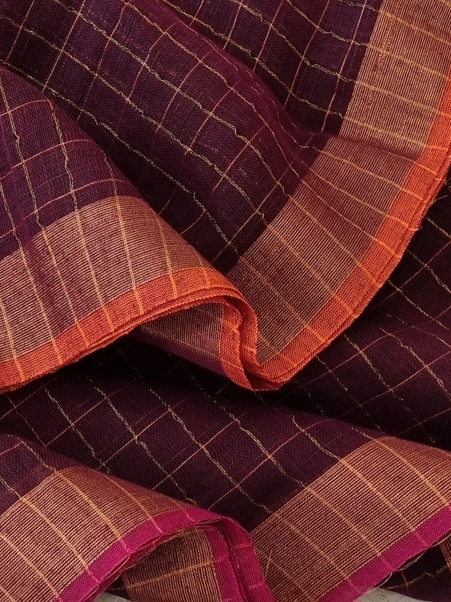 Dark purple checked body with gold pallu and dual toned contrast edging