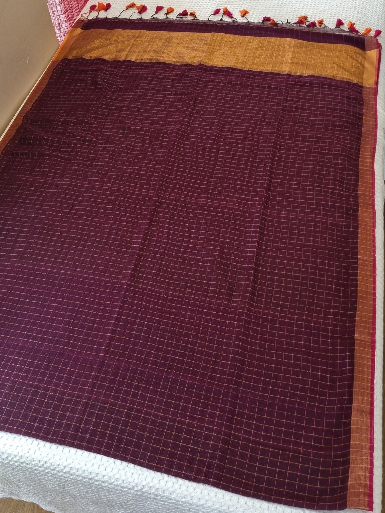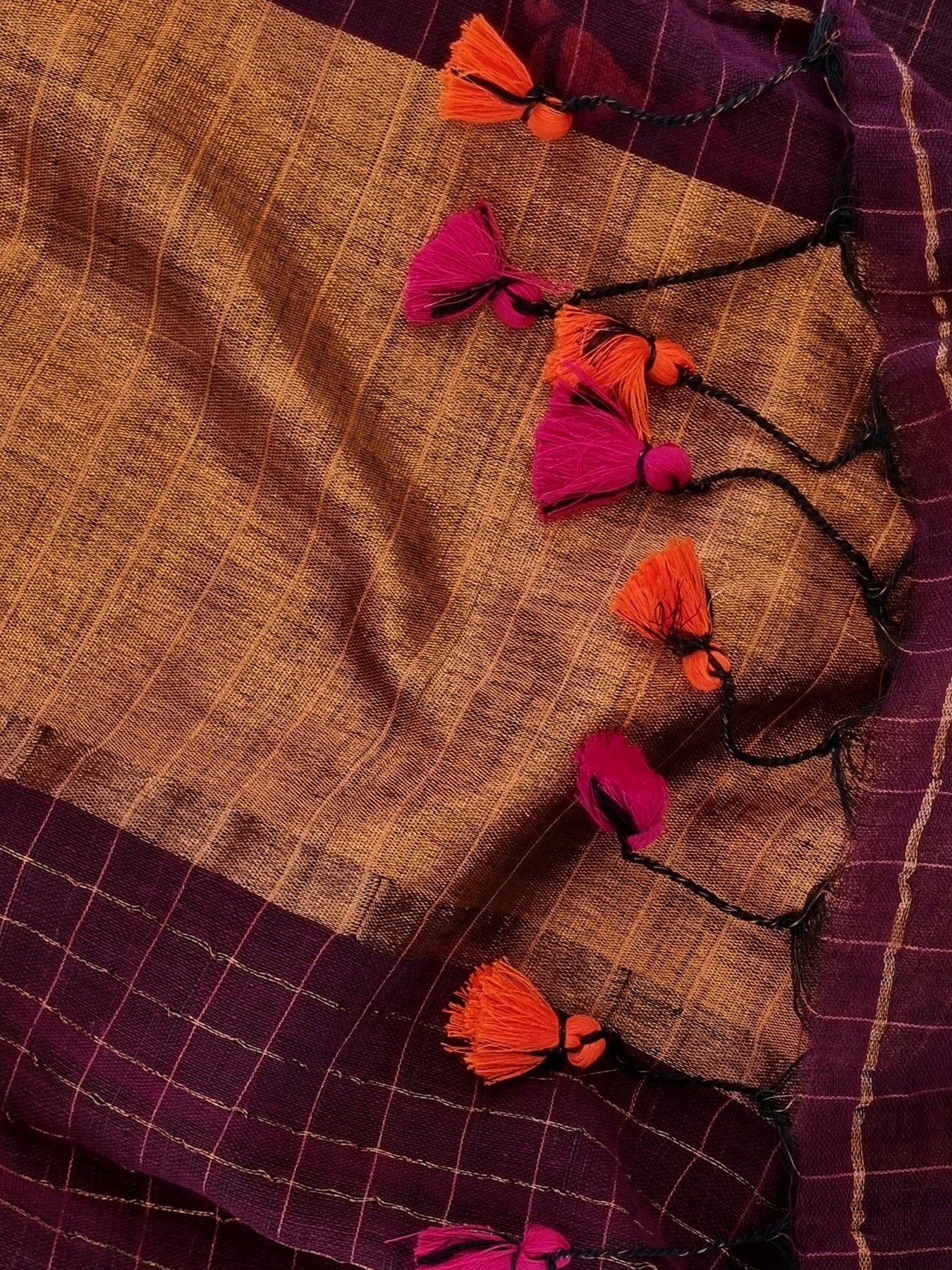 Woven from pure linen and adorned with Borders, a checked body, and tassels, this handloom linen saree showcases ethnic elegance