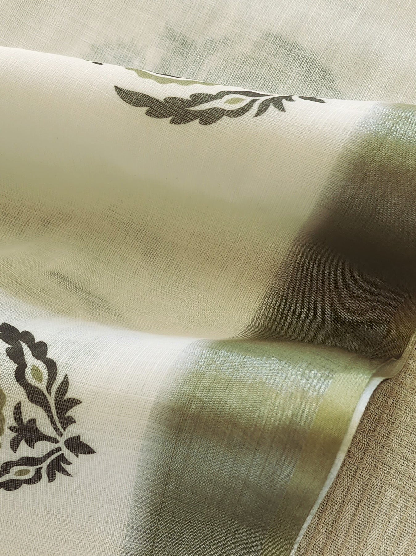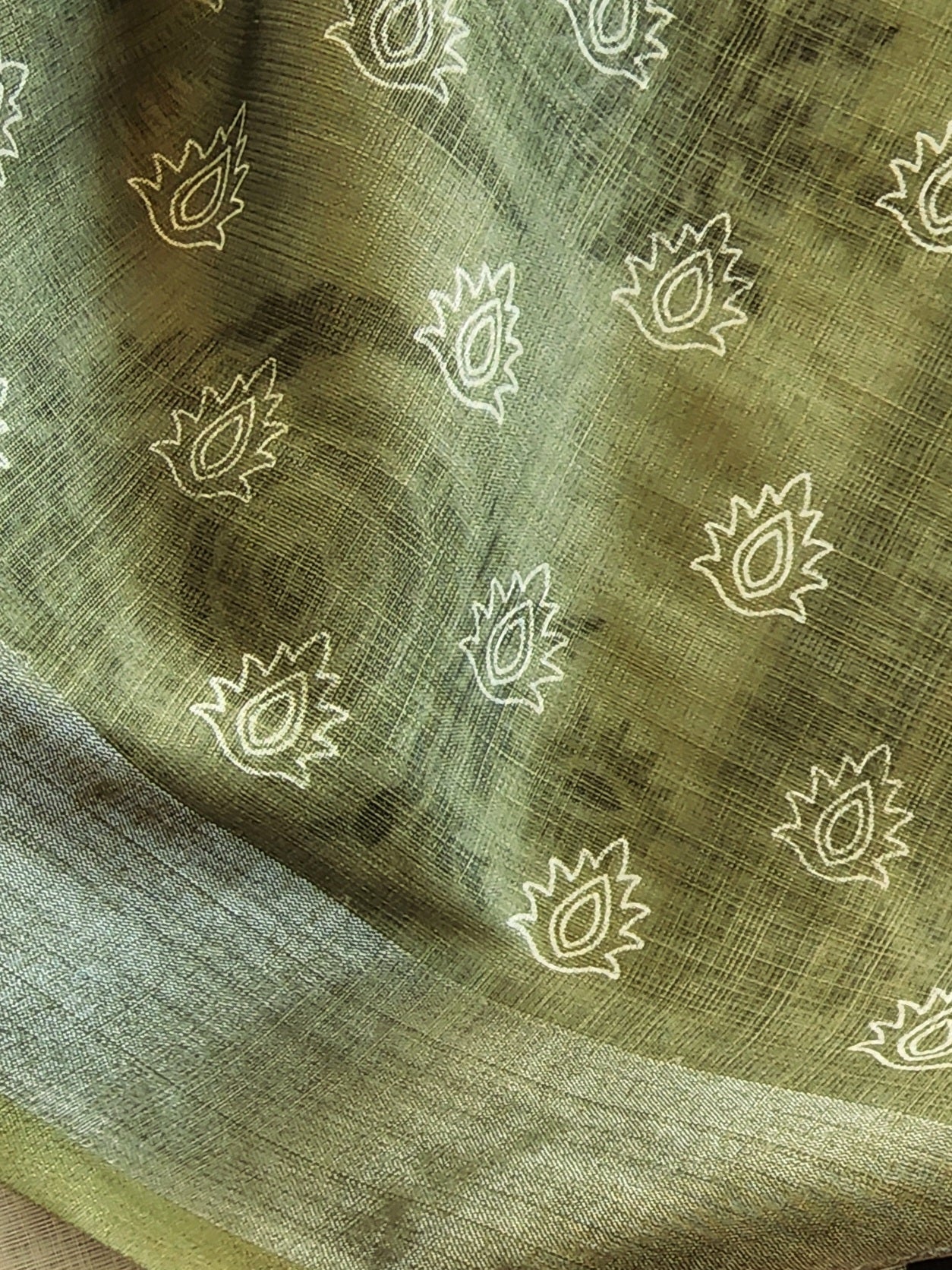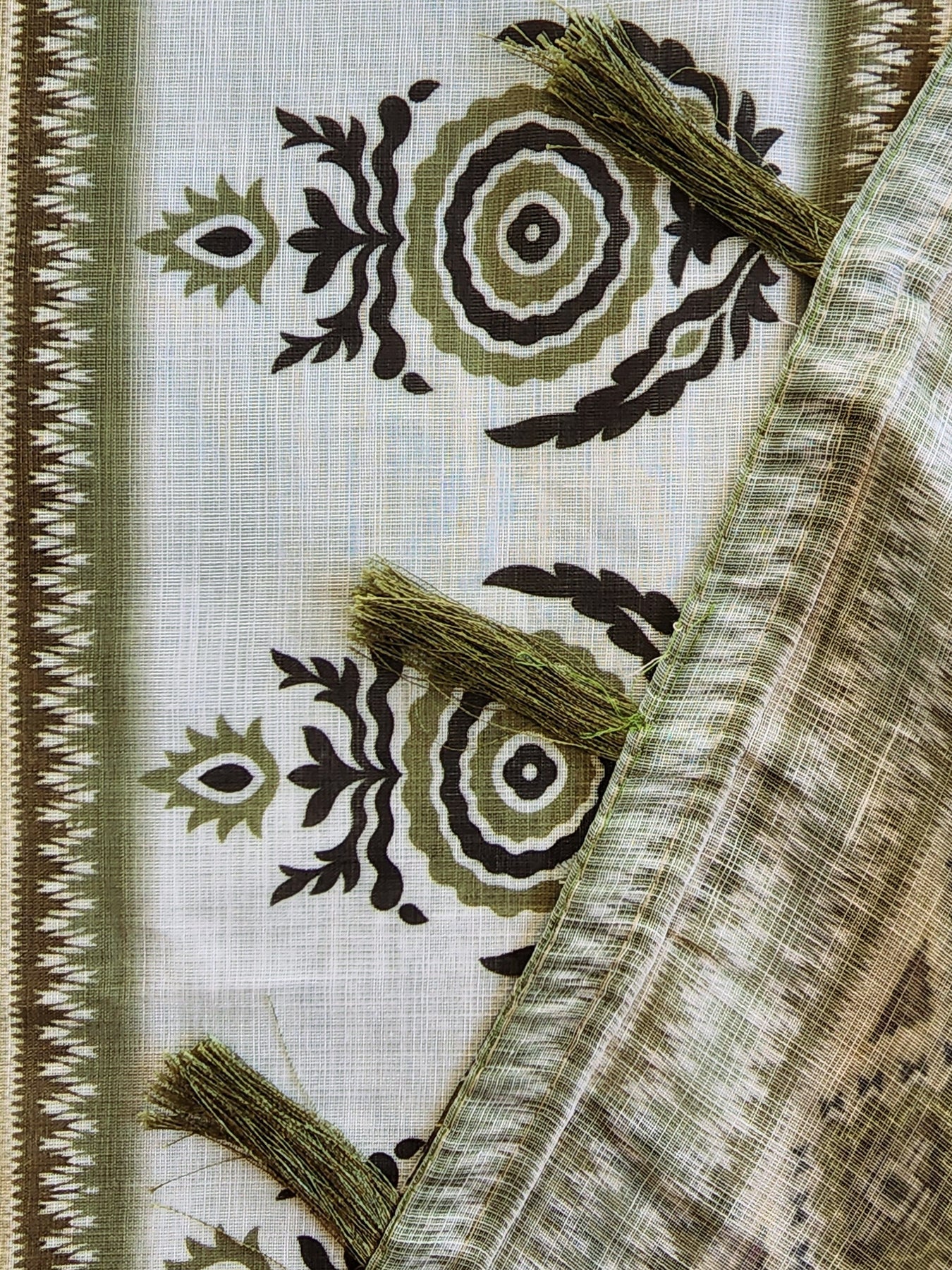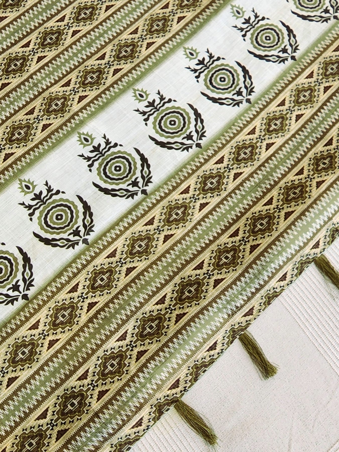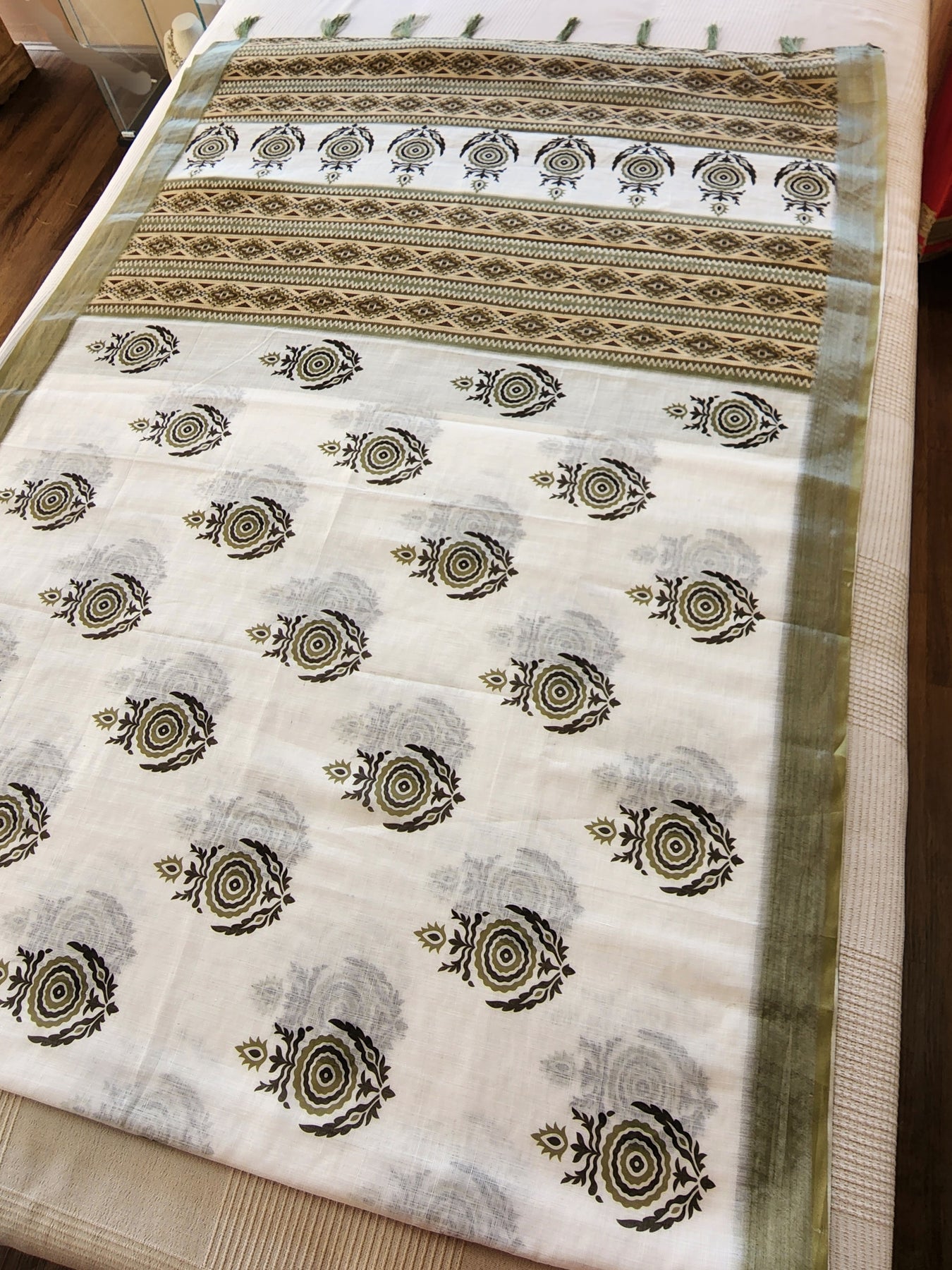 An elegant Silk Cotton Saree with Block Prints on the body and pallu, beautifully finished with tassels