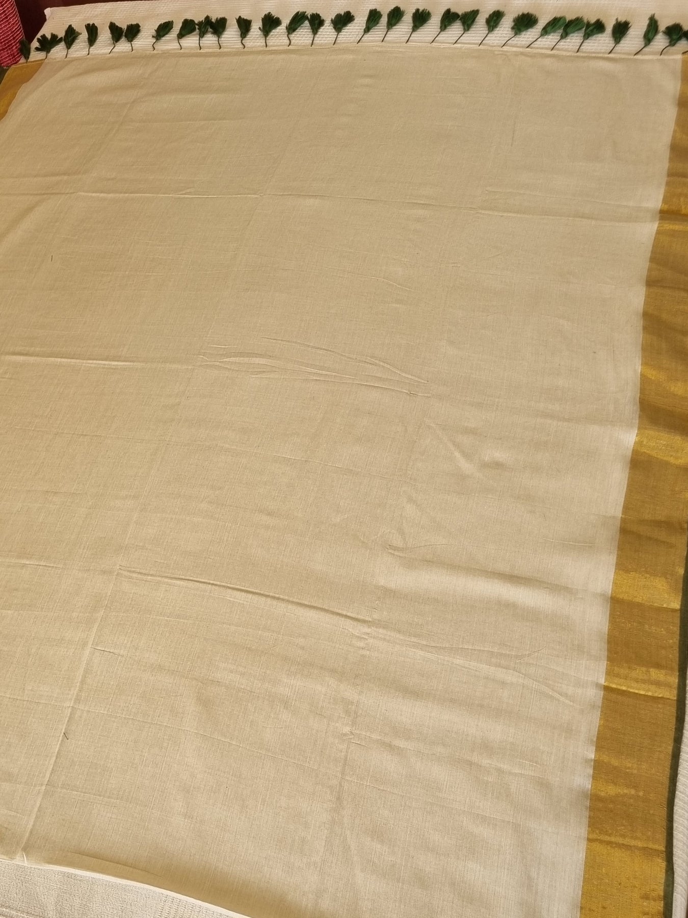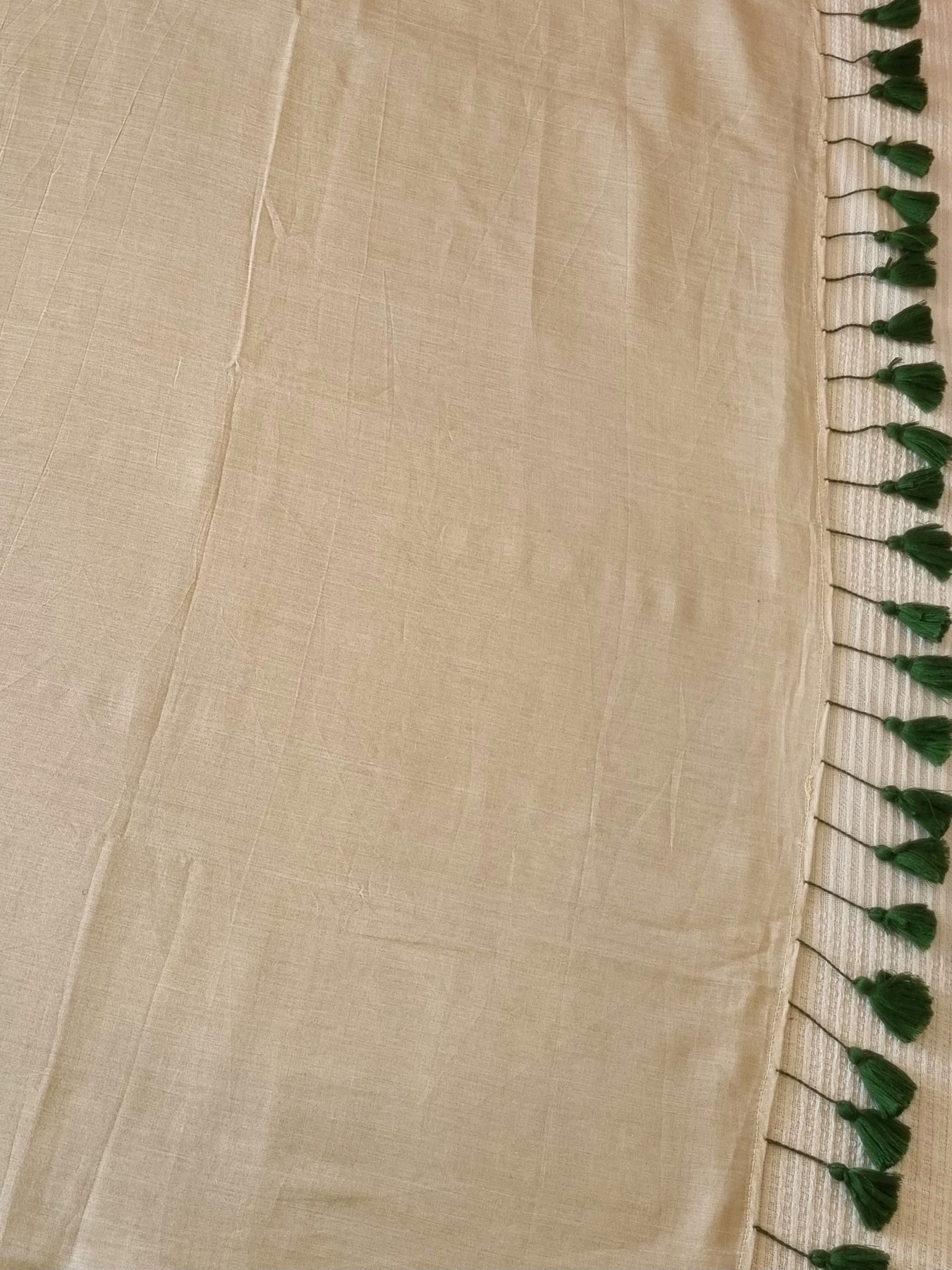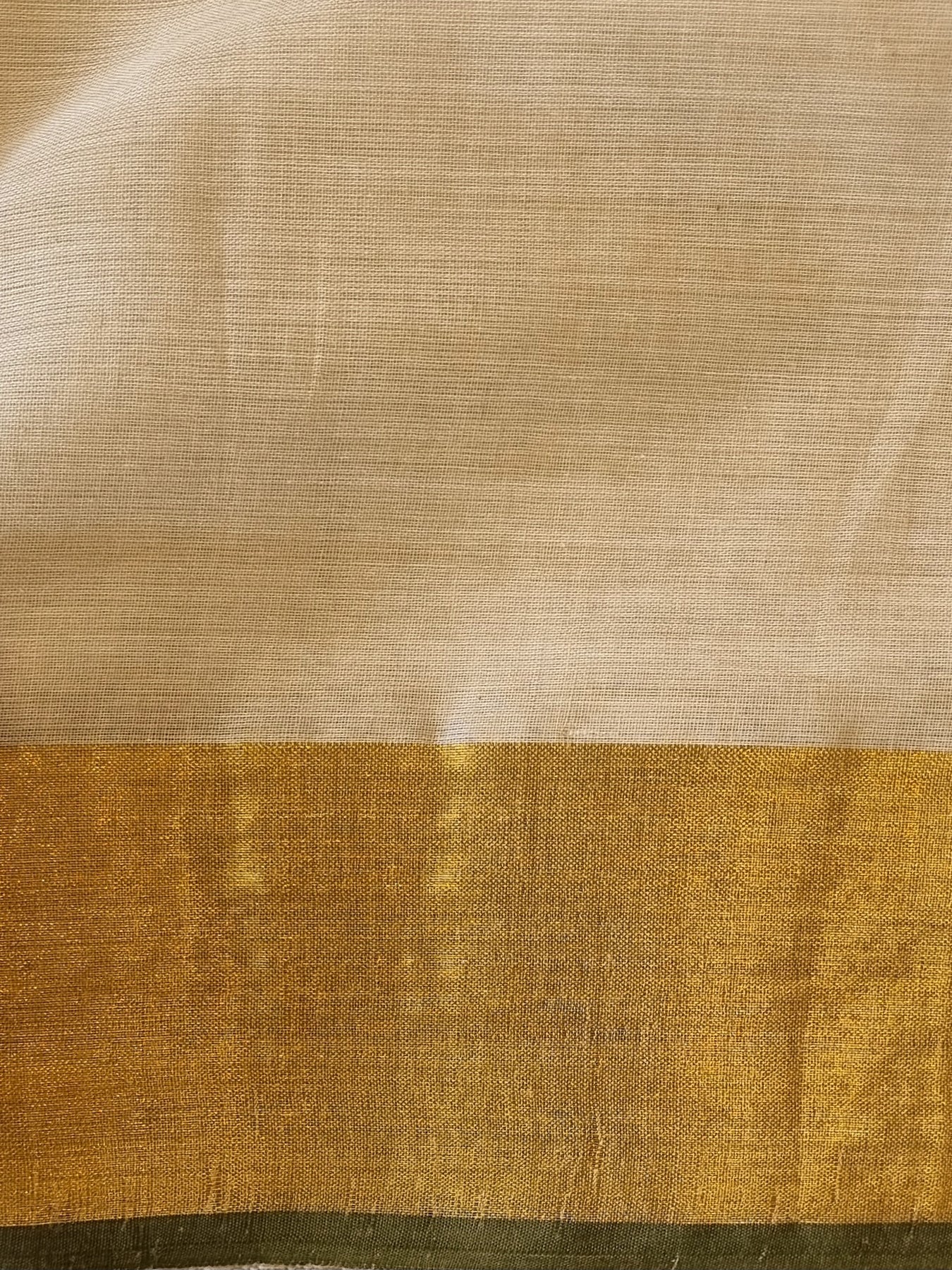 An elegant Mul Cotton Saree with Gold Zari Borders & Green edging