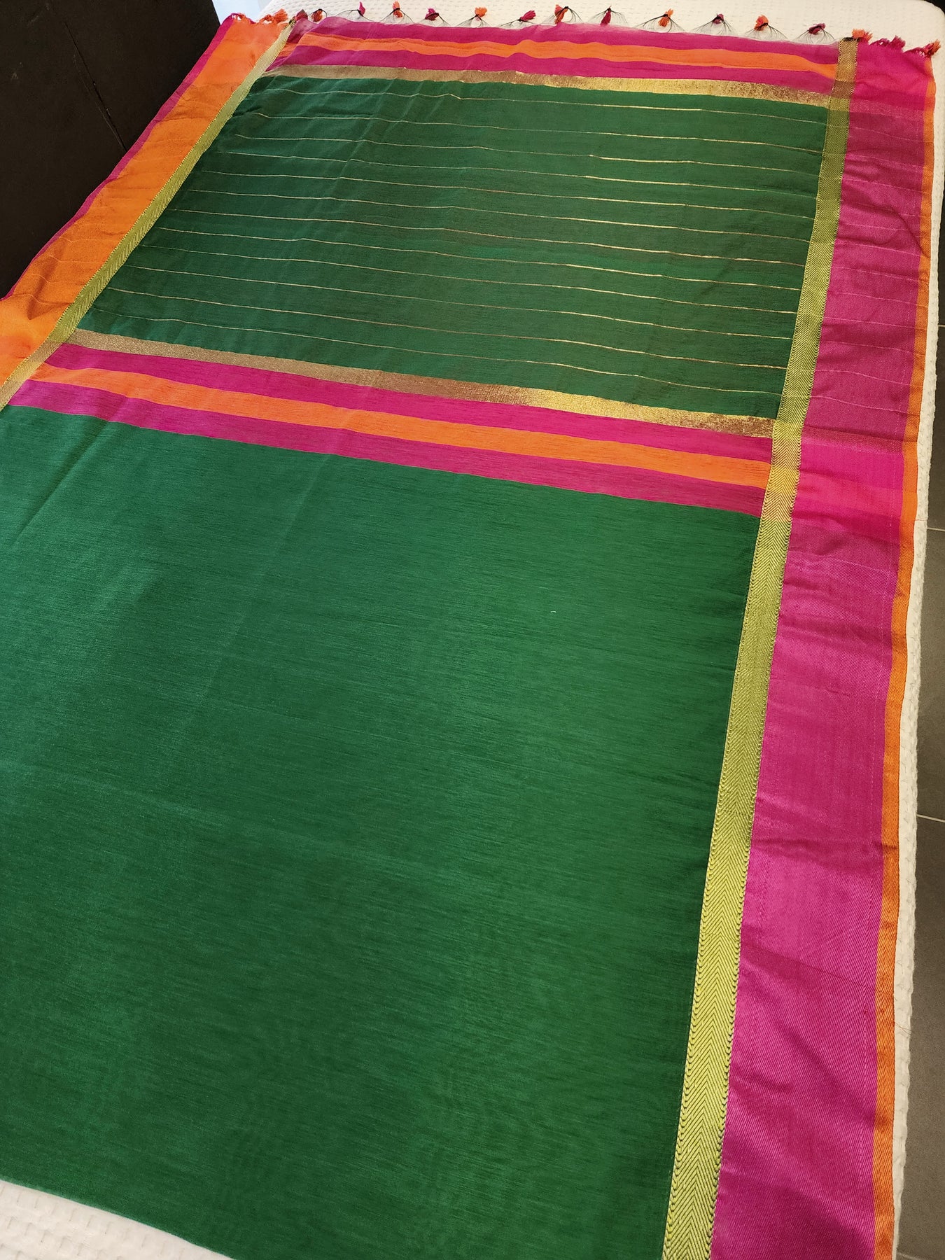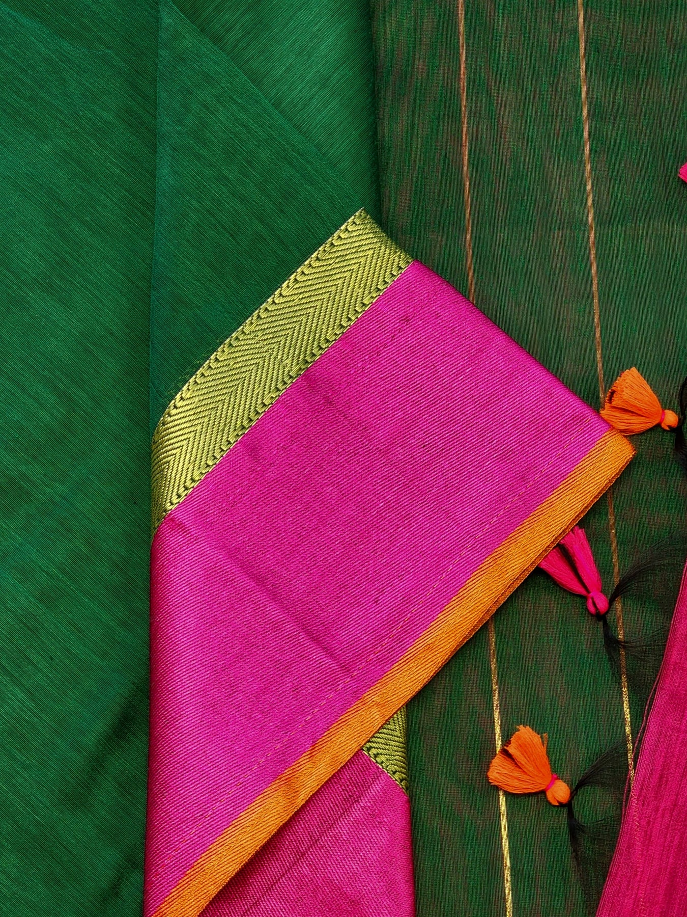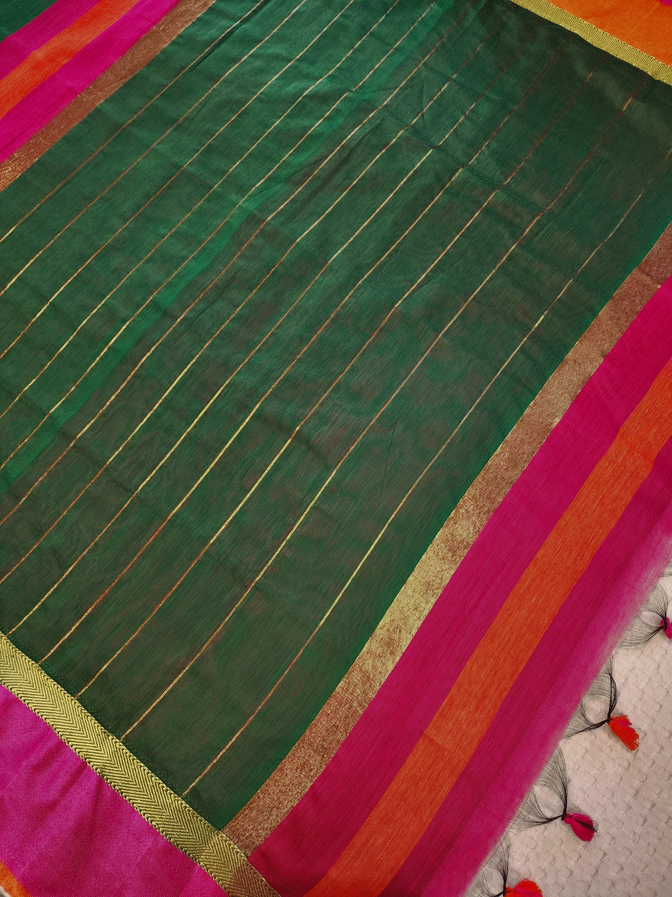 • A beautiful Semi Silk Cotton saree adorned with Ganga Jamuna borders a striped pallu, and tassels.