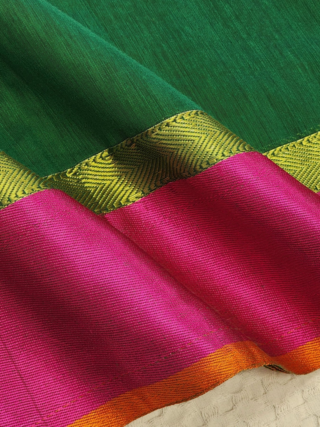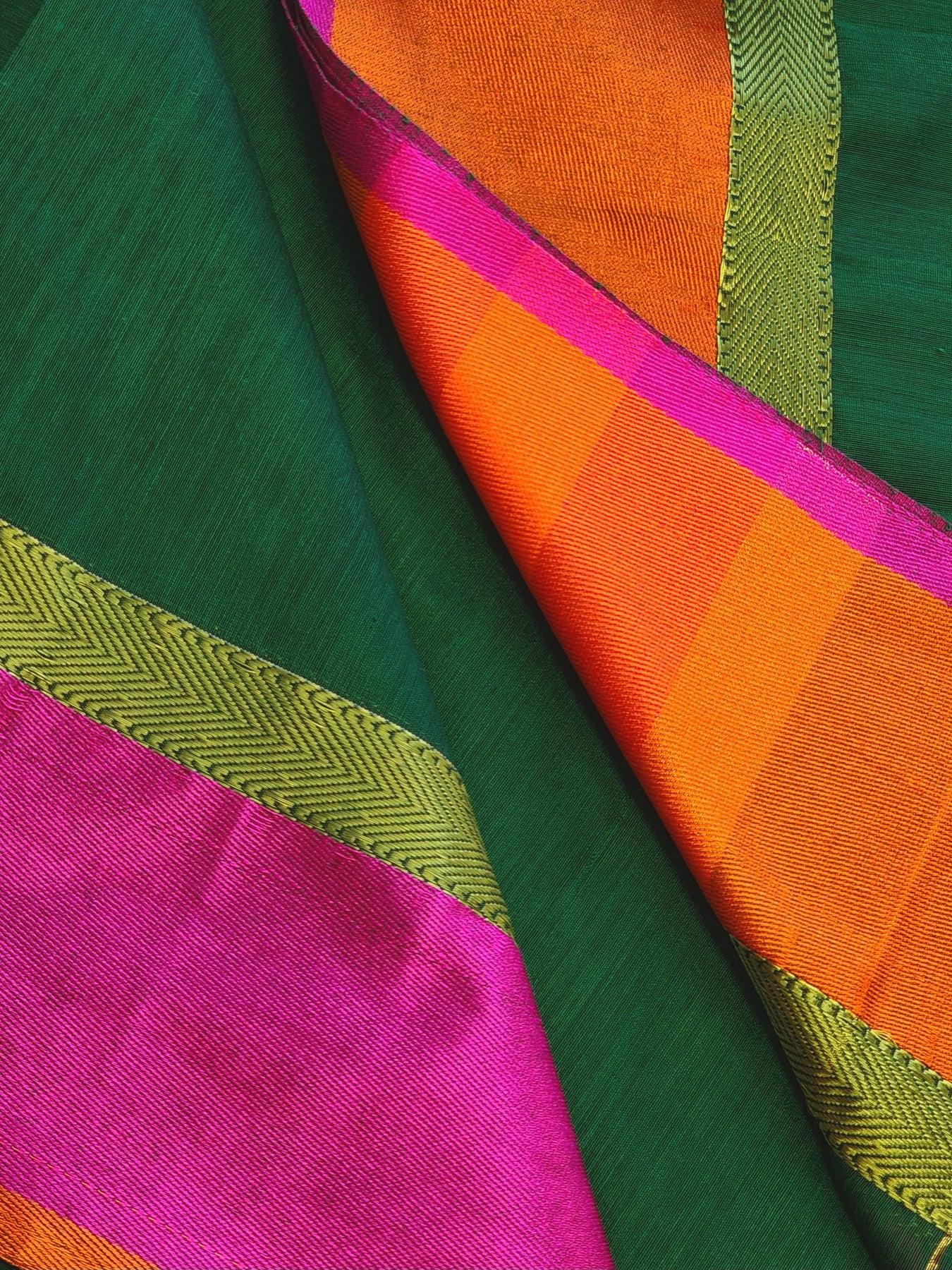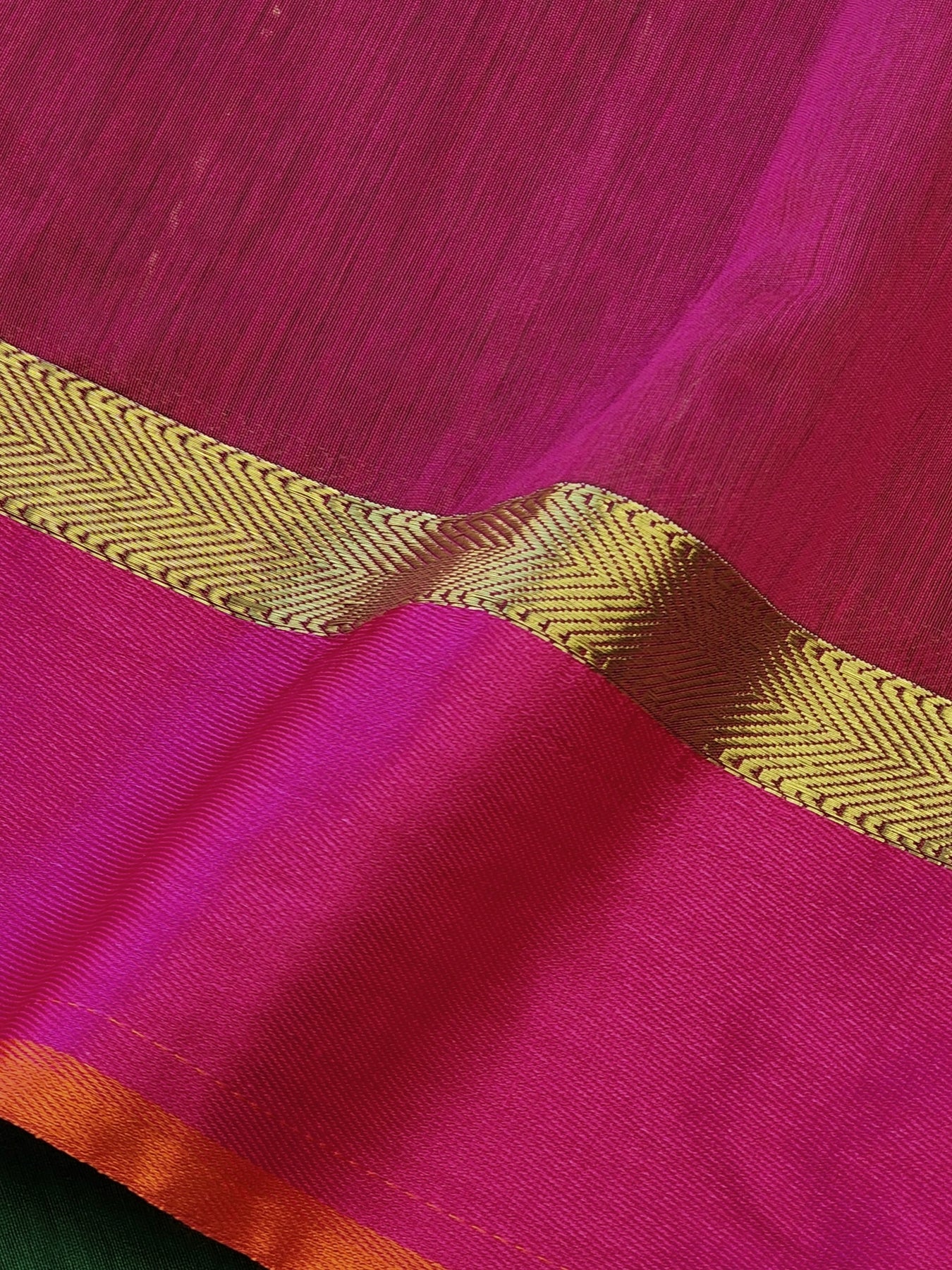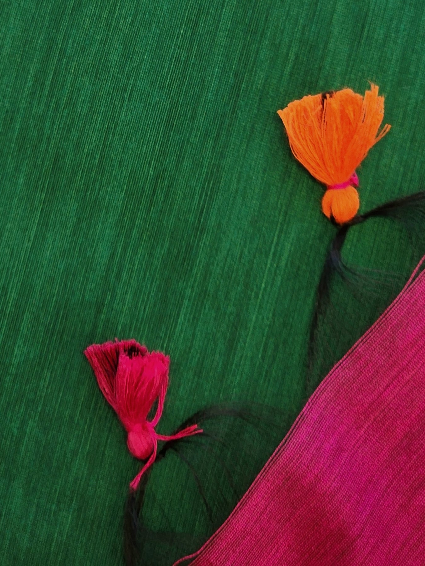 • A beautiful Semi Silk Cotton saree adorned with Ganga Jamuna borders a striped pallu, and tassels.