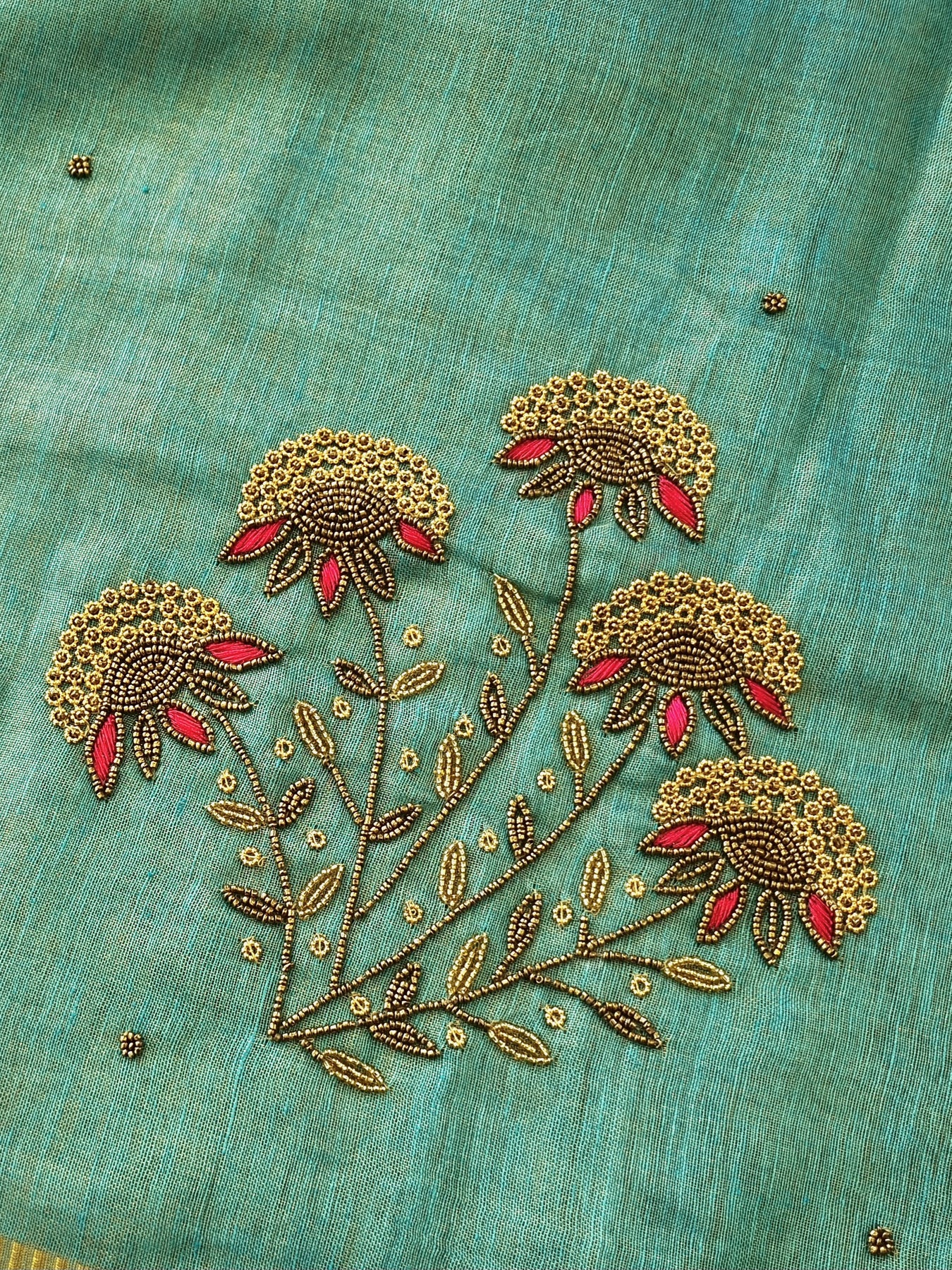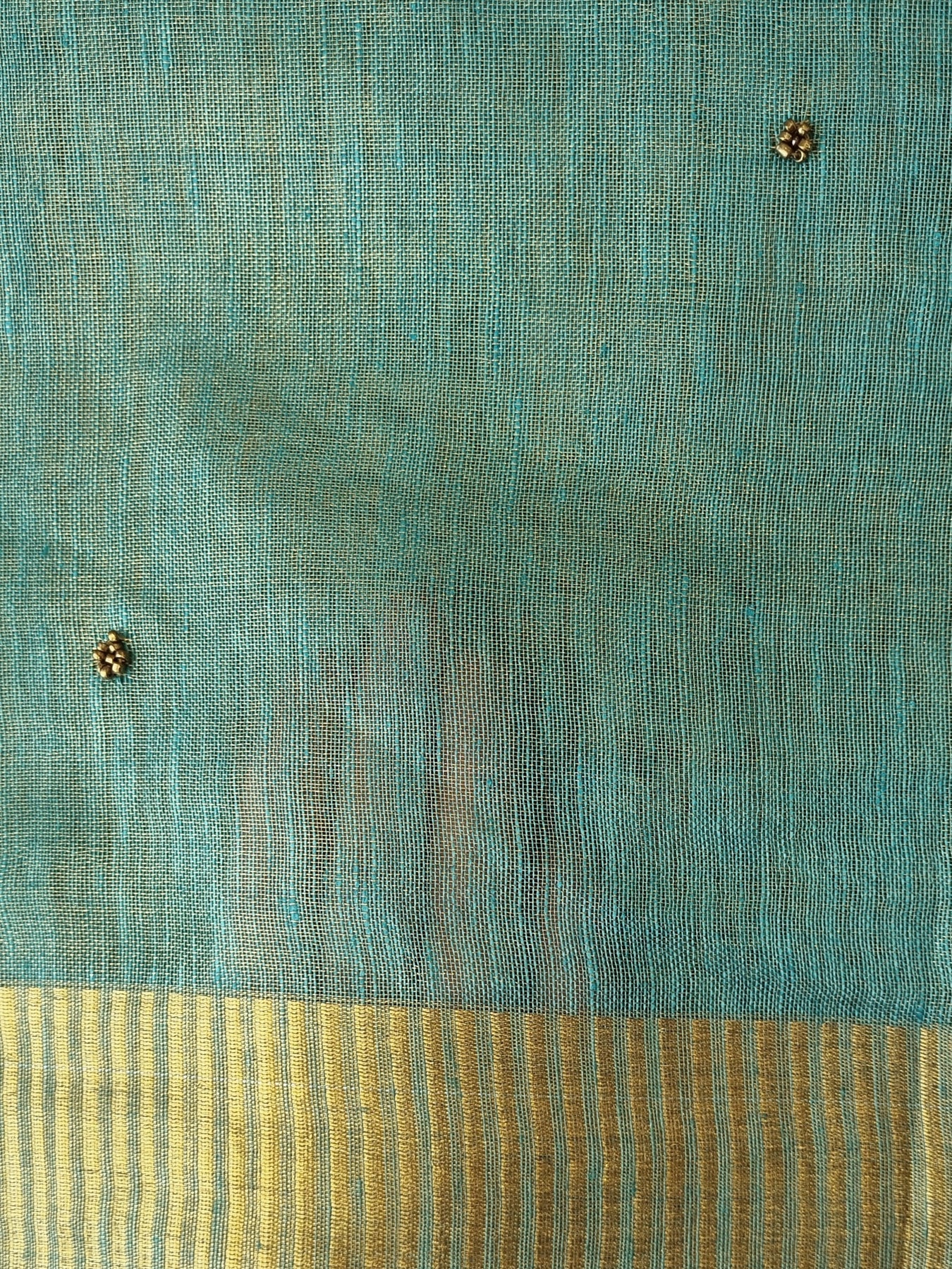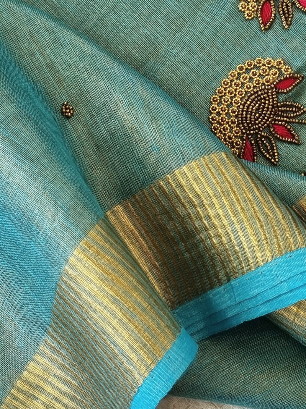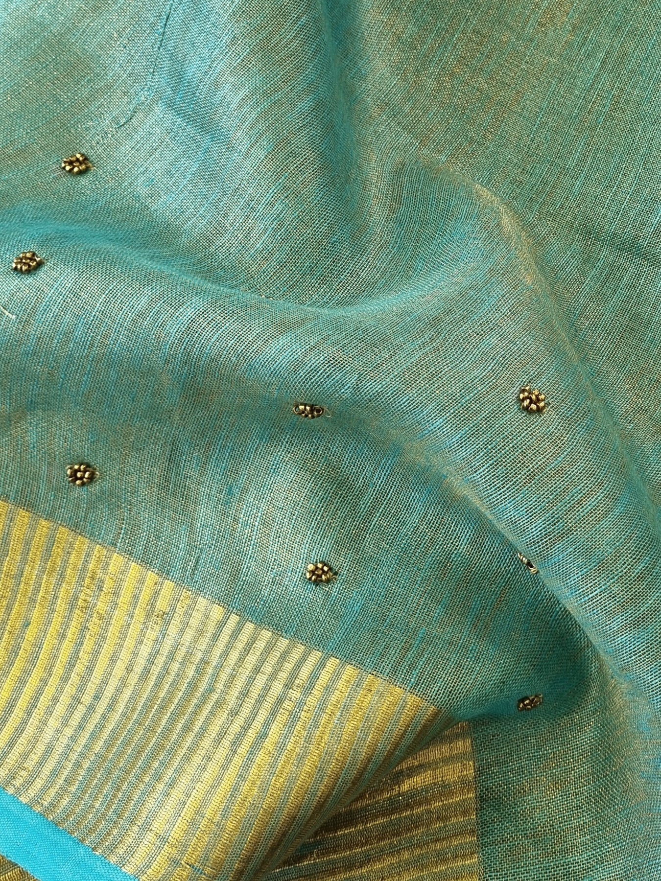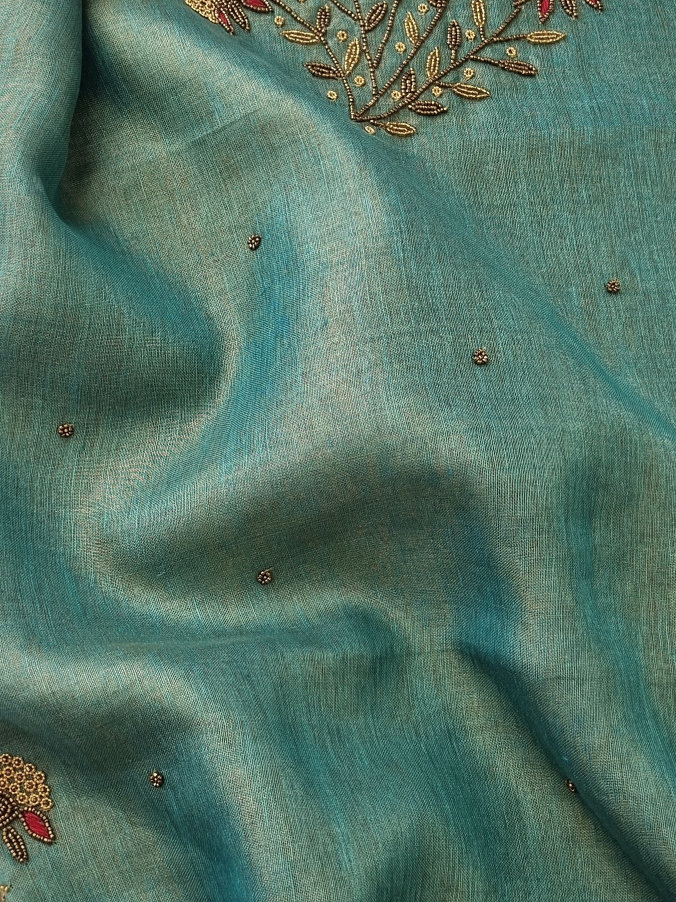 • Masterly crafted with pearls and embellishments, this tissue linen Saree has a modern aappeal
