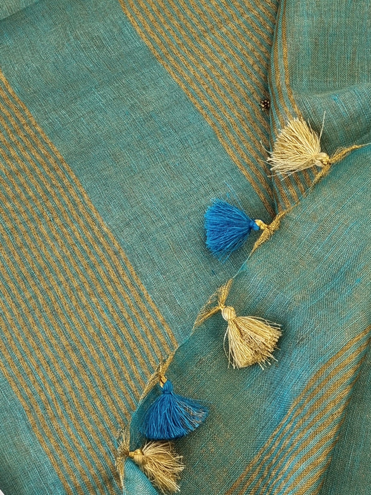 • Dual toned body with Gold Borders and an embellished Pallu, beautifully finished with tassels