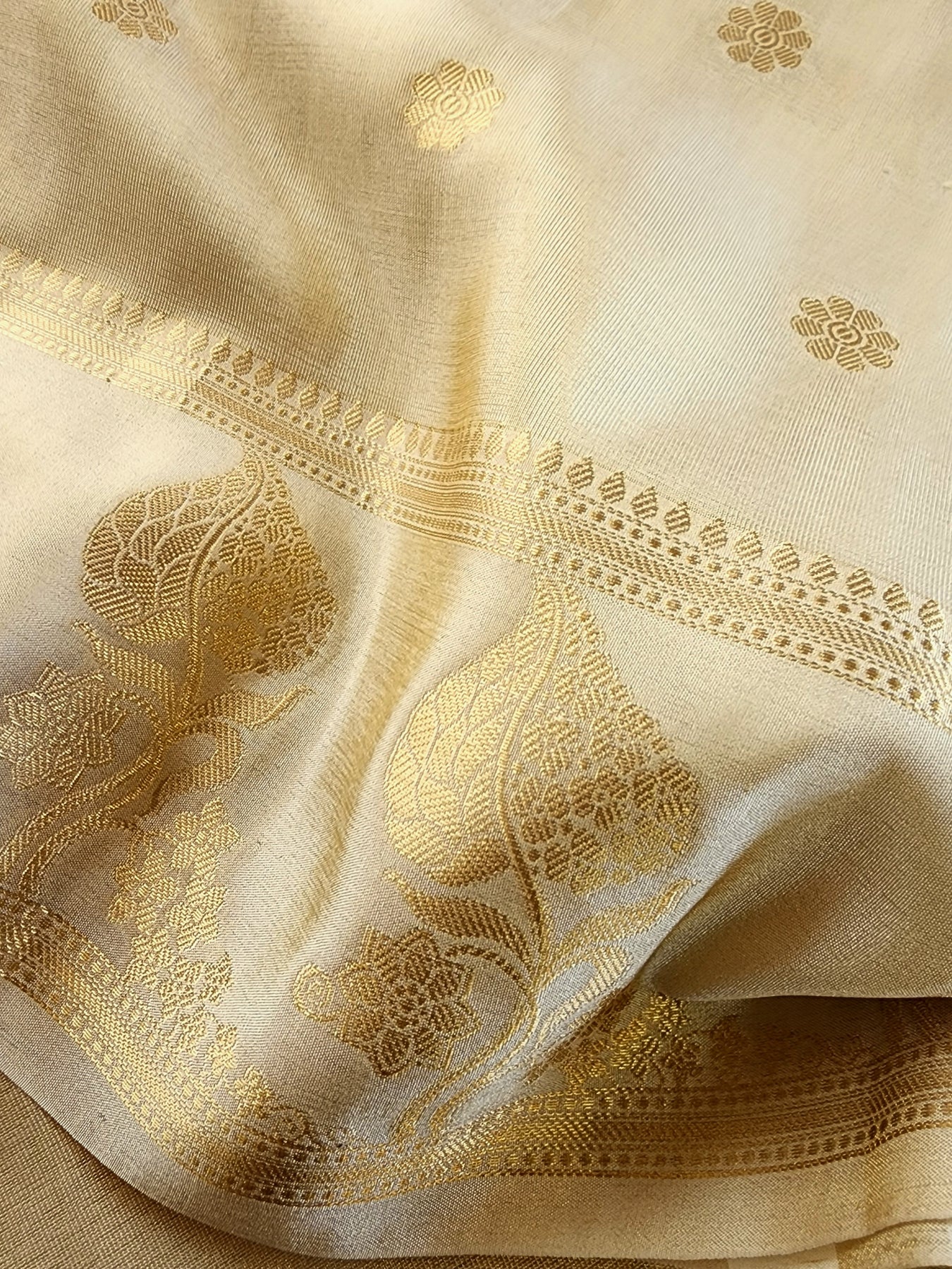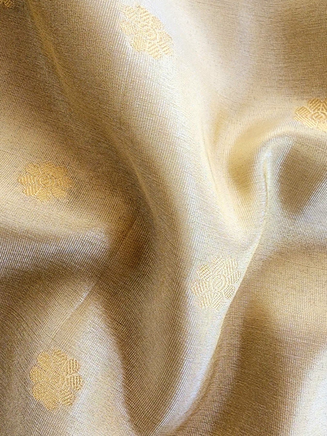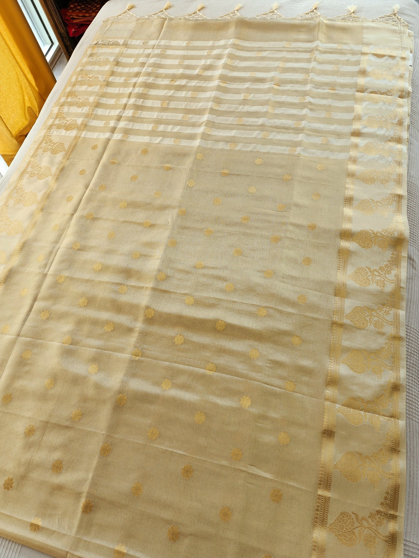 An elegant Tissue Crepe Silk Saree with Gold motifs and borders