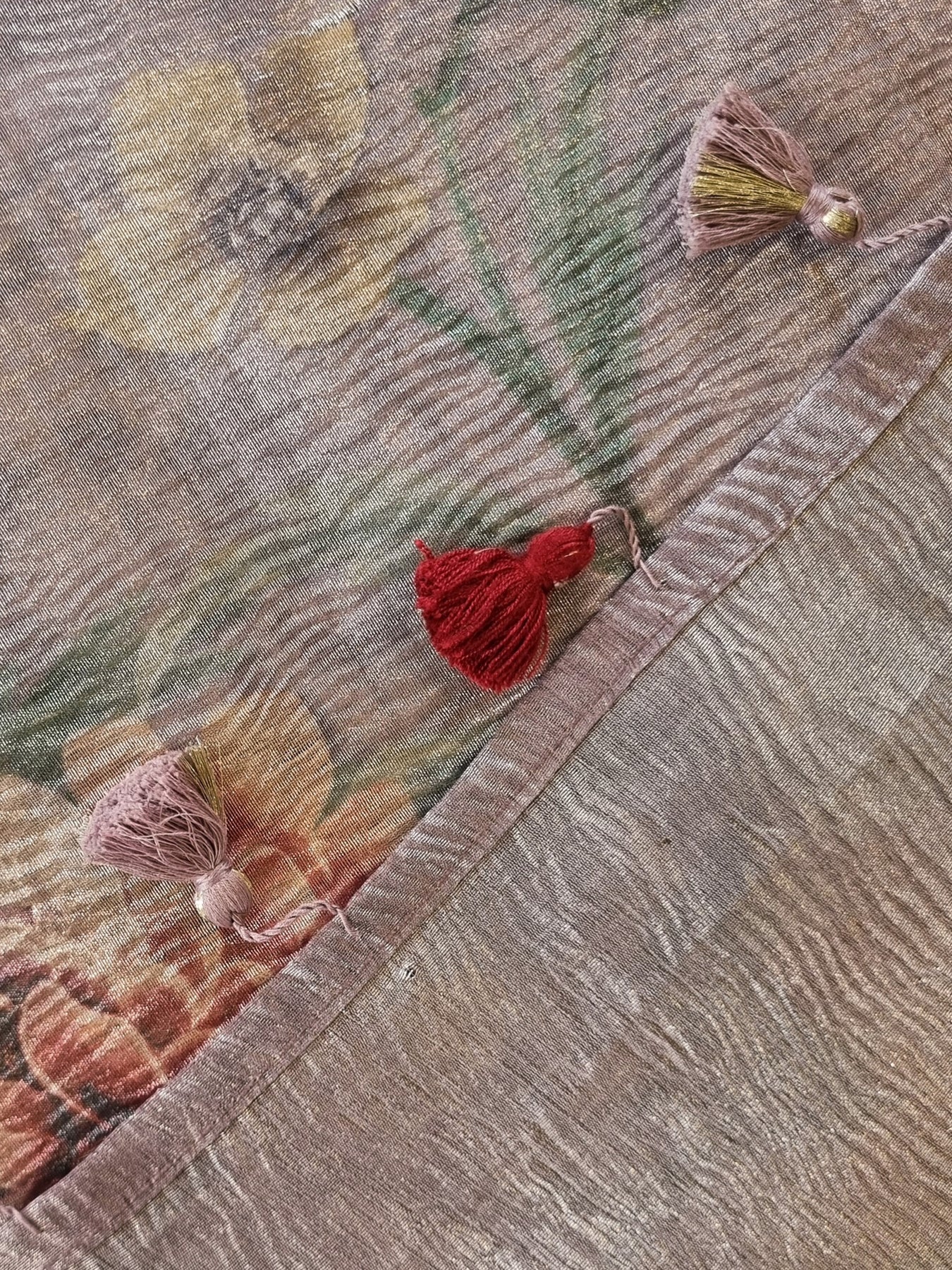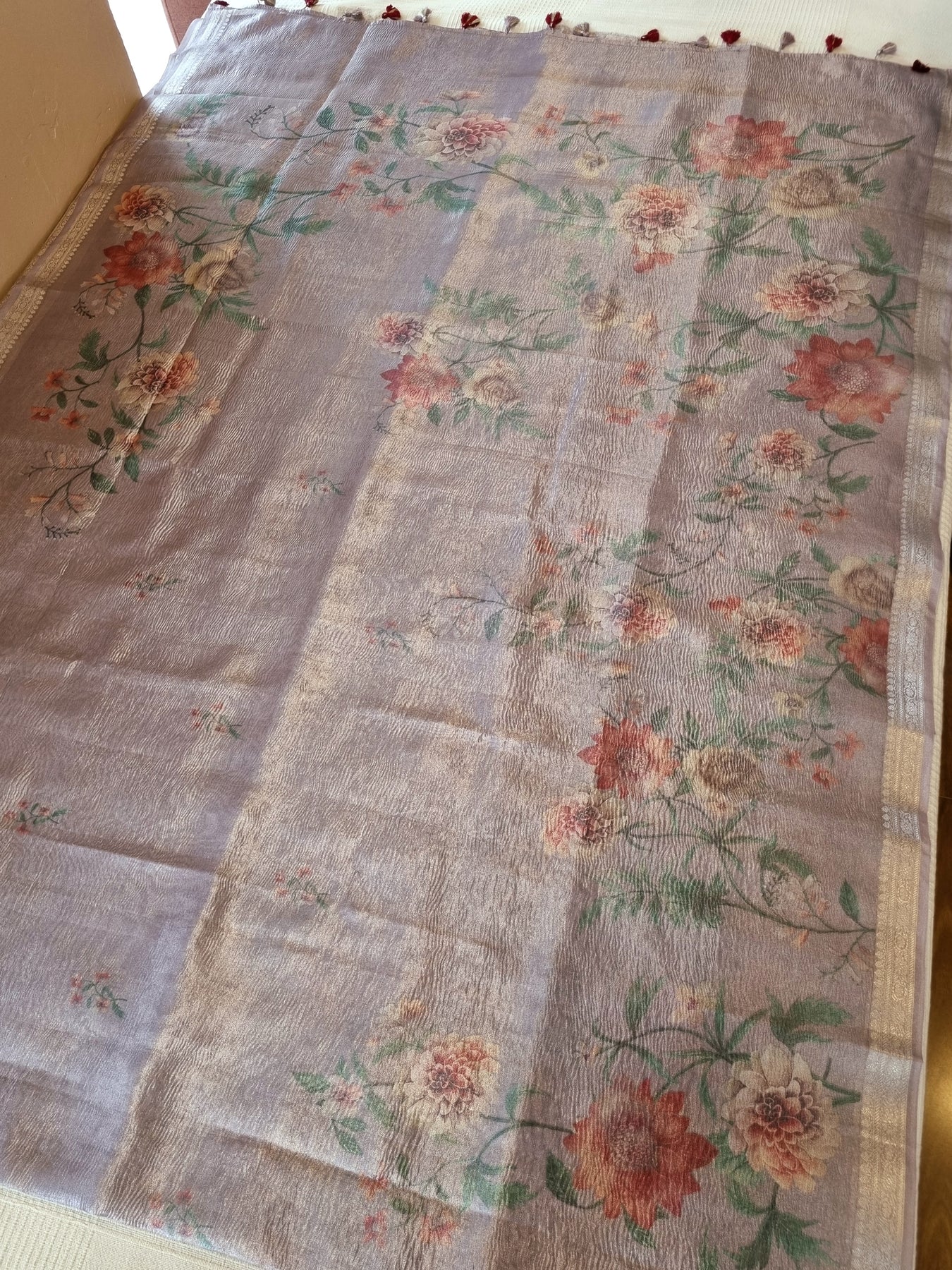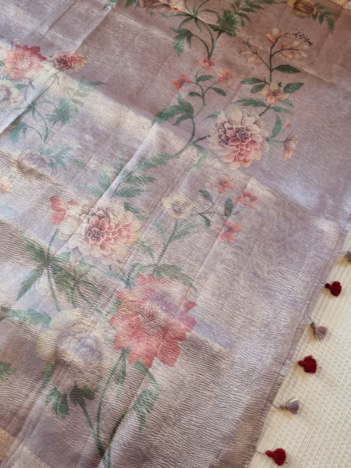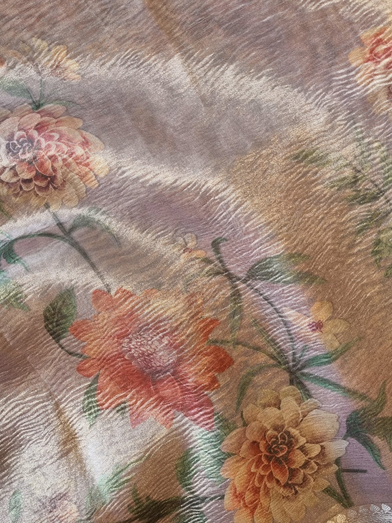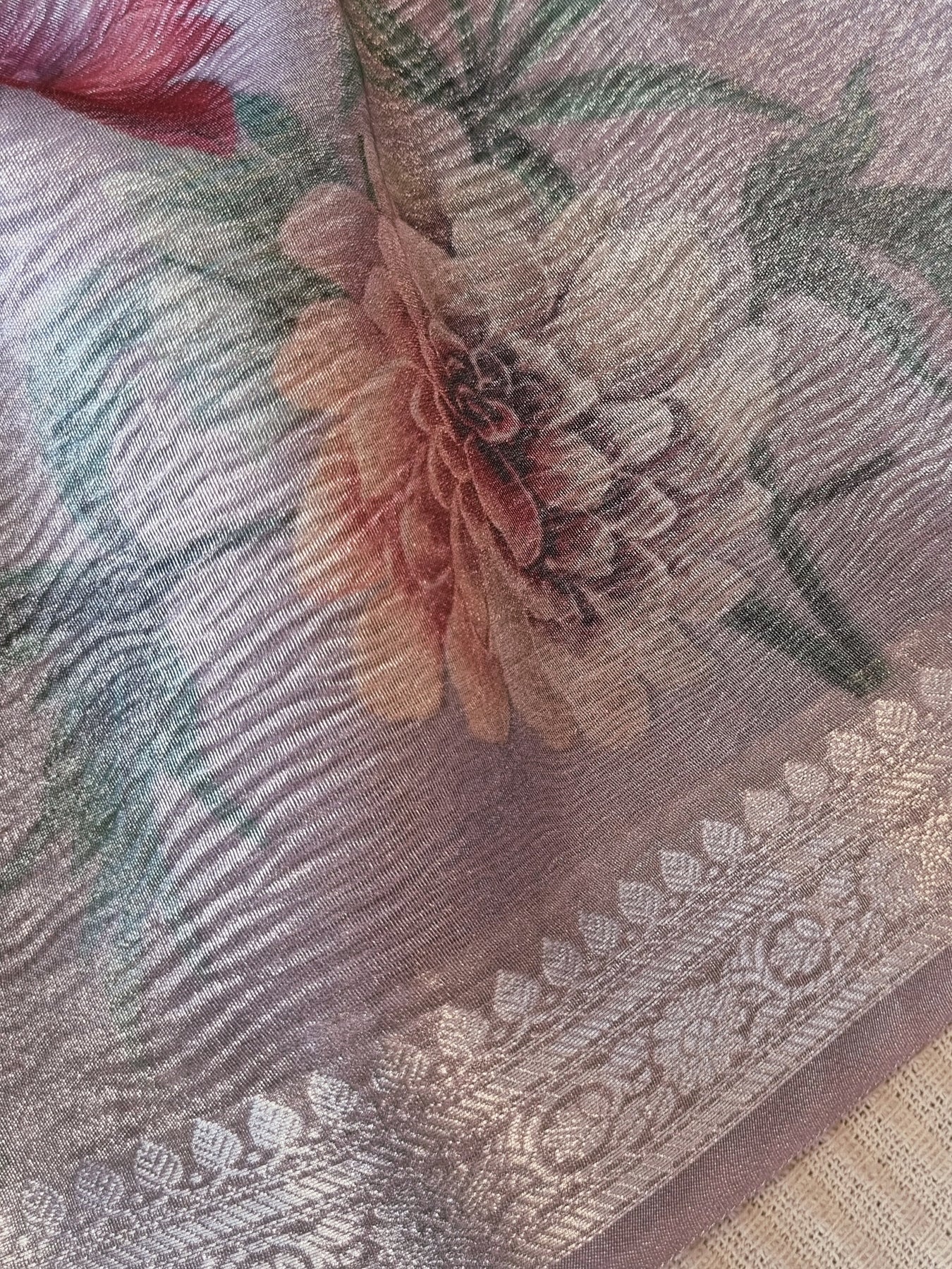 This elegant Crushed Silk Saree with Digital Floral Prints has a modern appeal