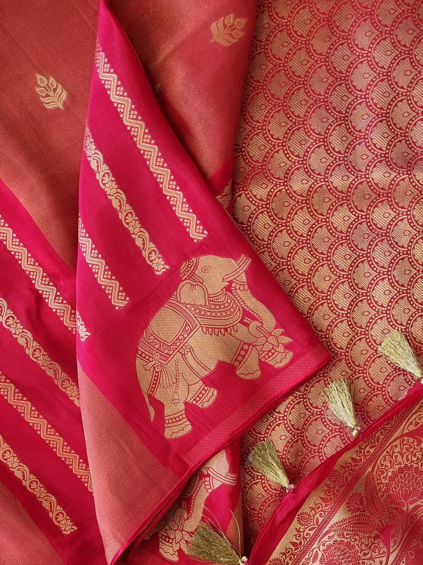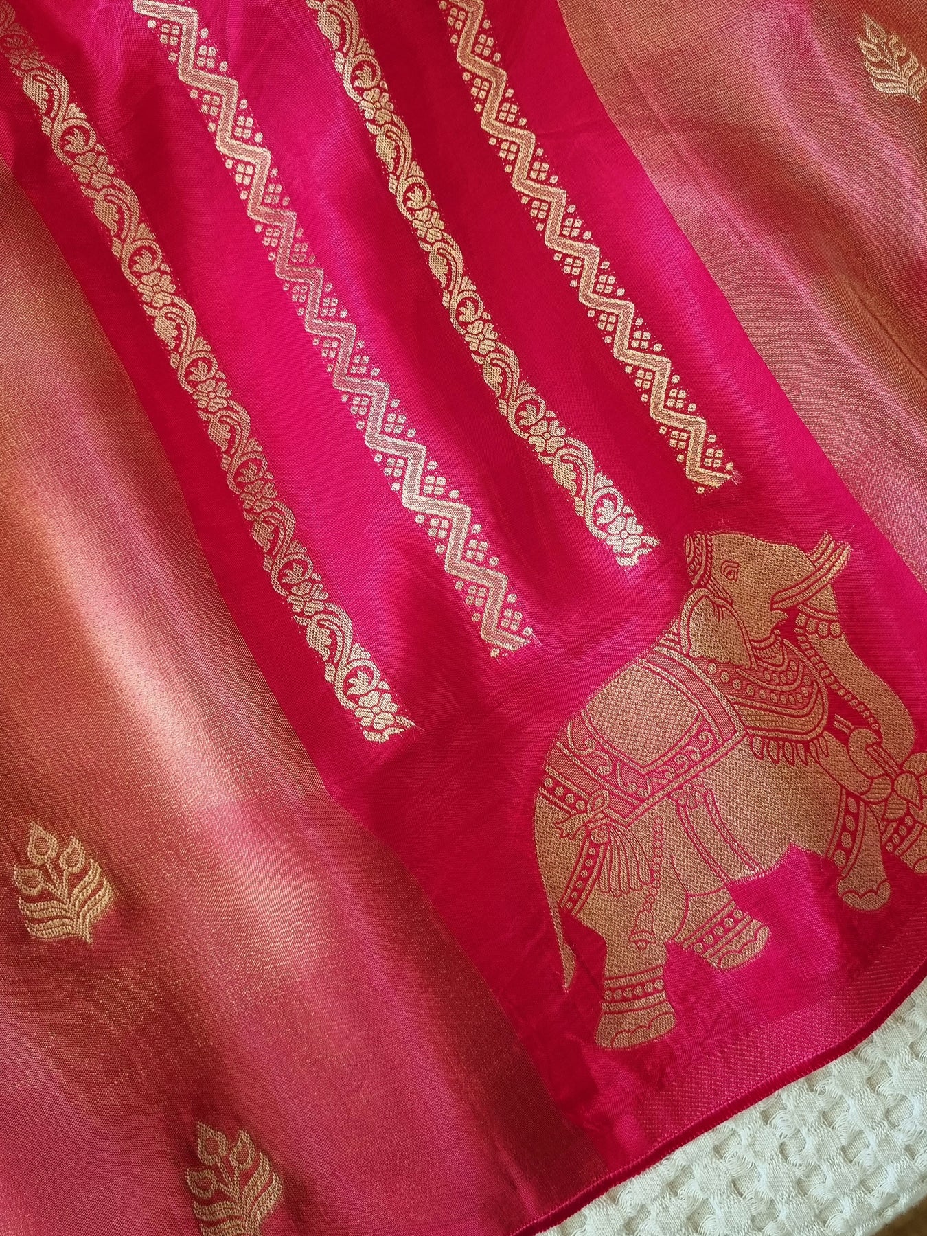 • The beautiful contrast pallu and borders elevates the style quotient