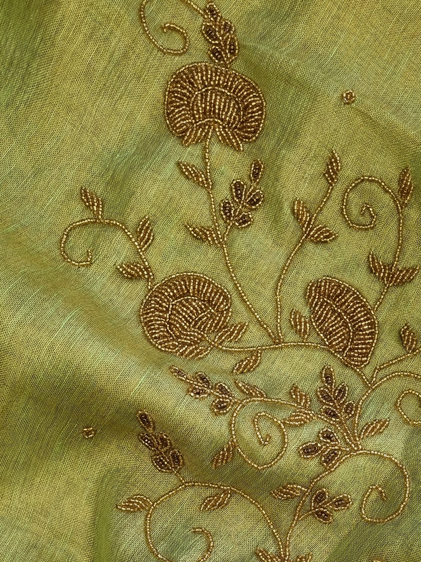 Masterly crafted with pearls and embellishments, this tissue linen Saree has a modern aappeal