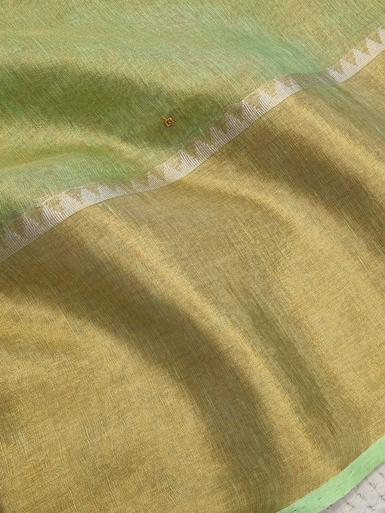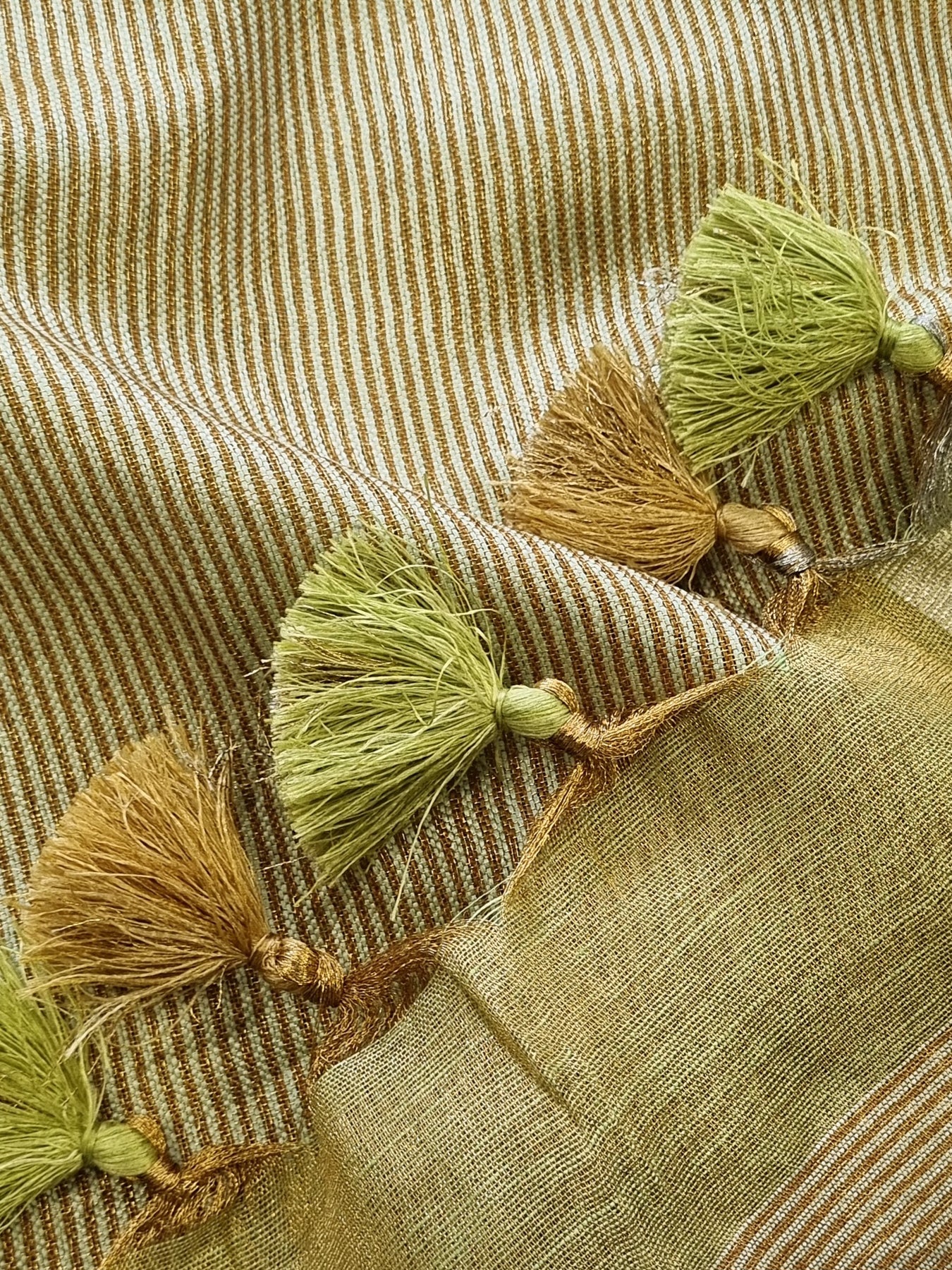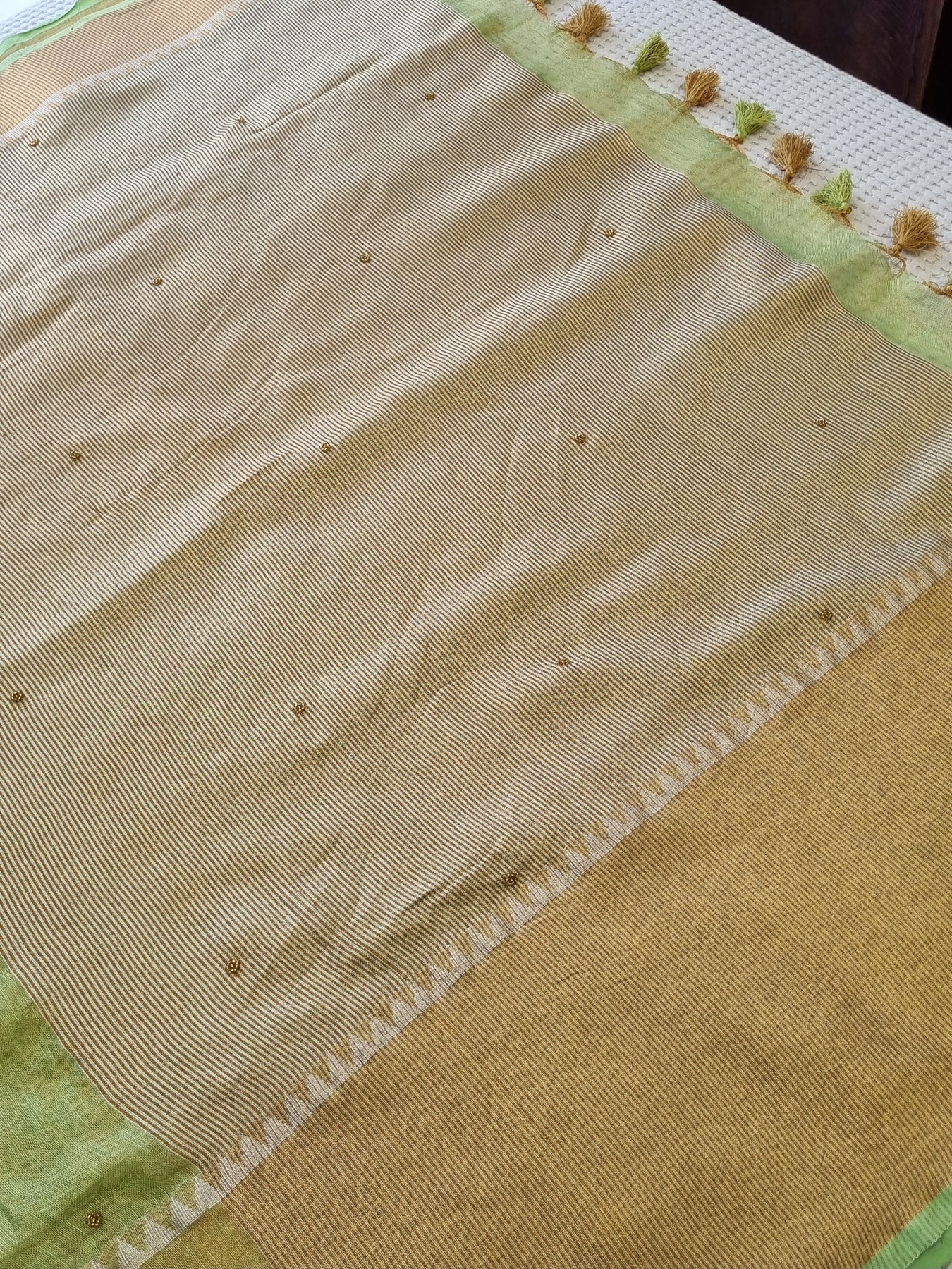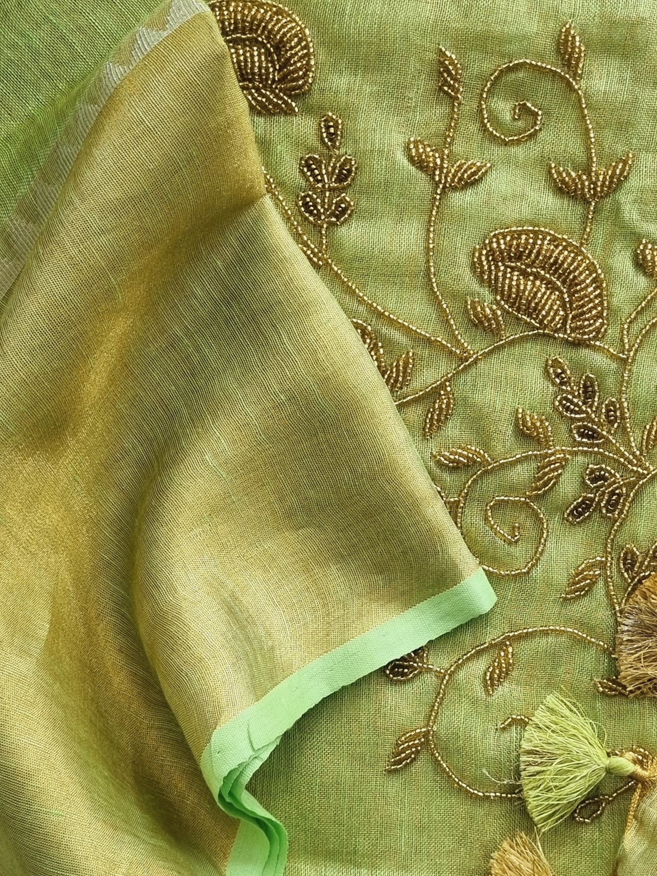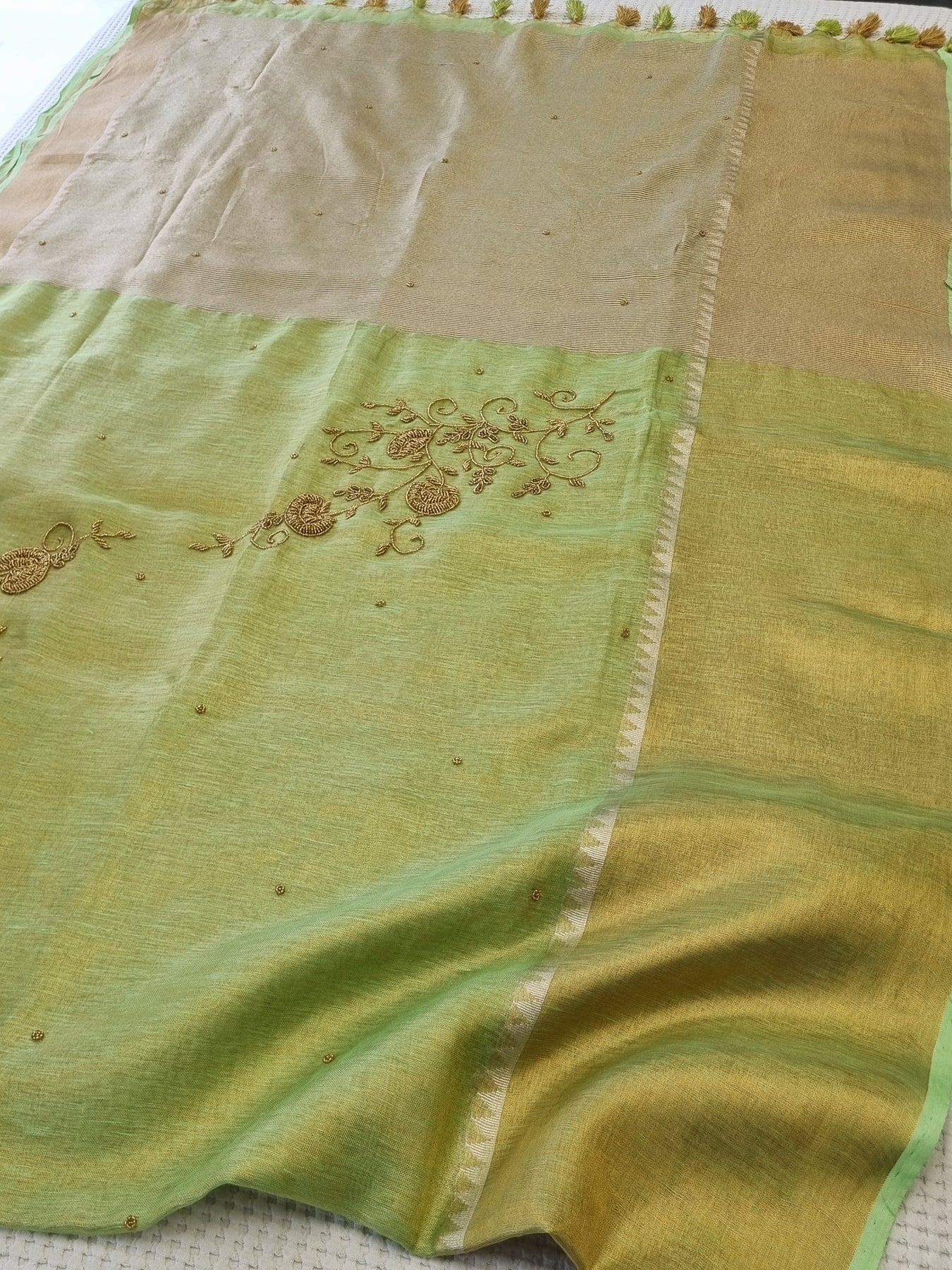 Dual toned body with Gold Borders and an embellished Pallu, beautifully finished with tassels