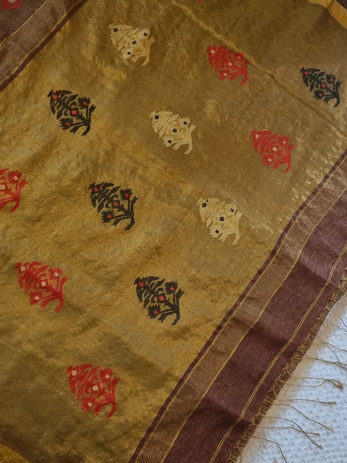 Woven from pure linen and tissue and adorned with contrastly embroidered motifs, this elegant linen saree is a great addition to your ethnic wardrobe