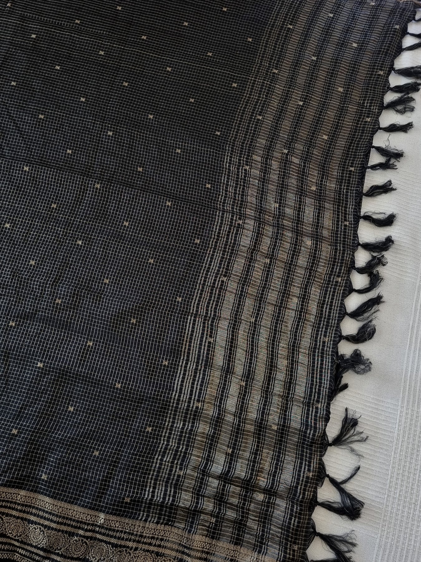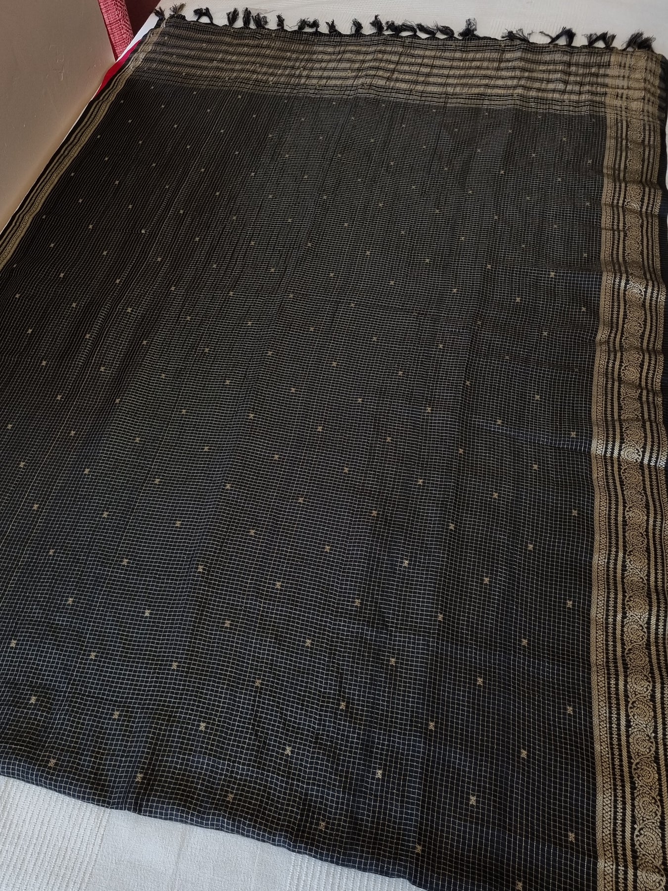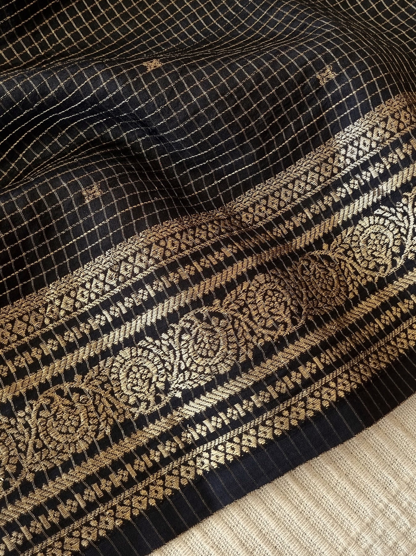 The elegant checked pattern and Striped pallu elevate the style quotient