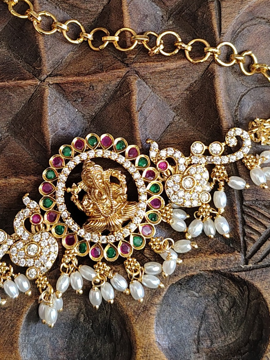 This is an elegant choker set comprising of a necklace with a Ganesha pendant, ornated with stones and pearls, and a pair of matching earrings