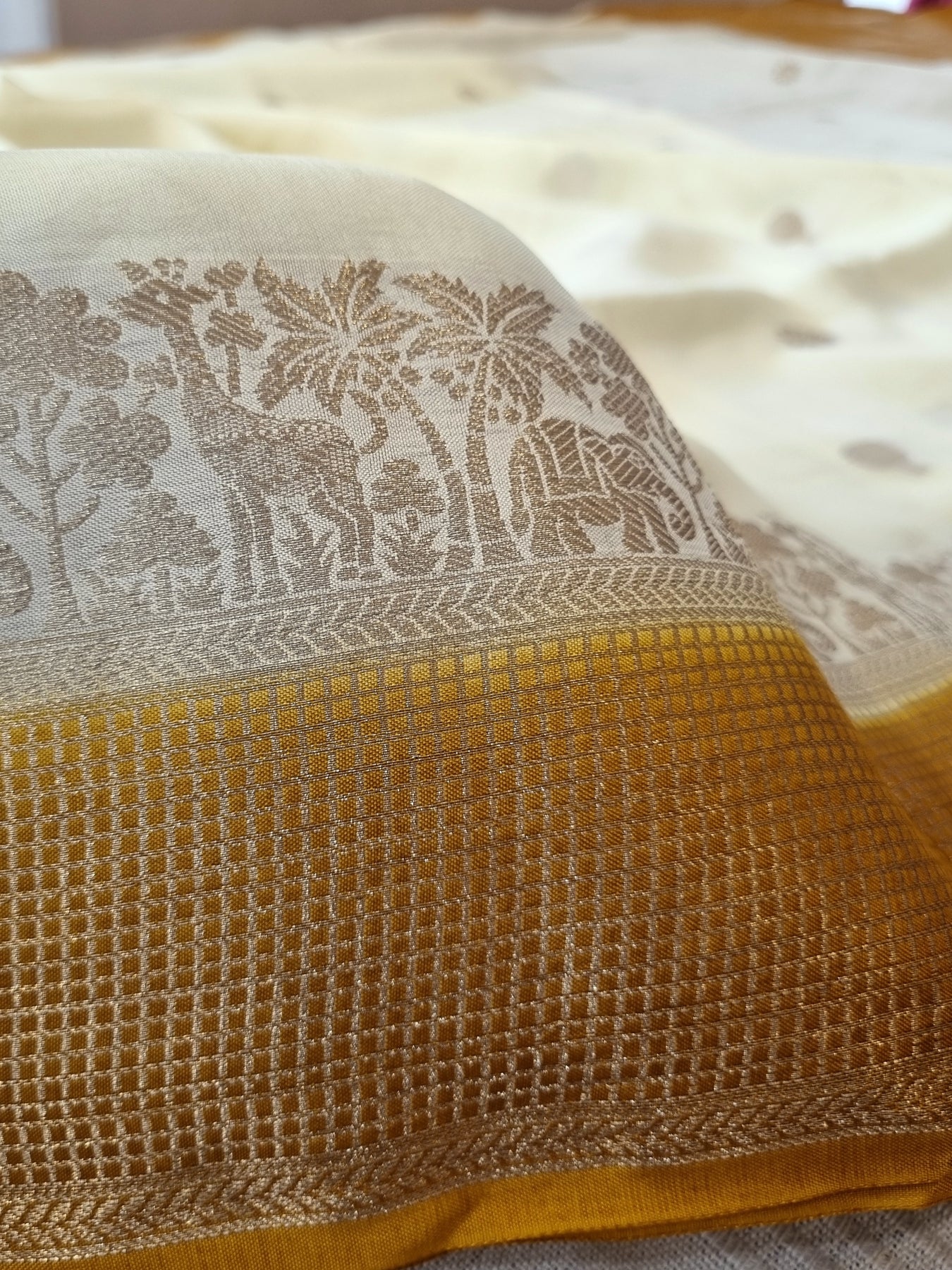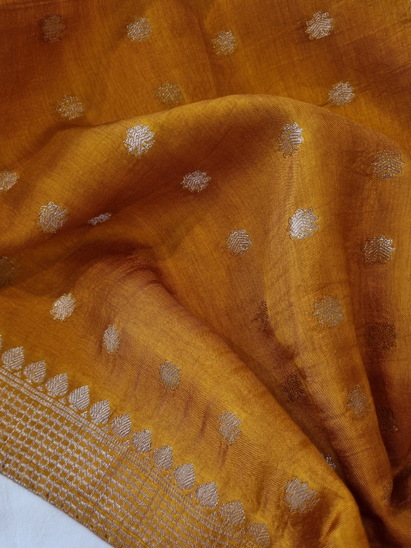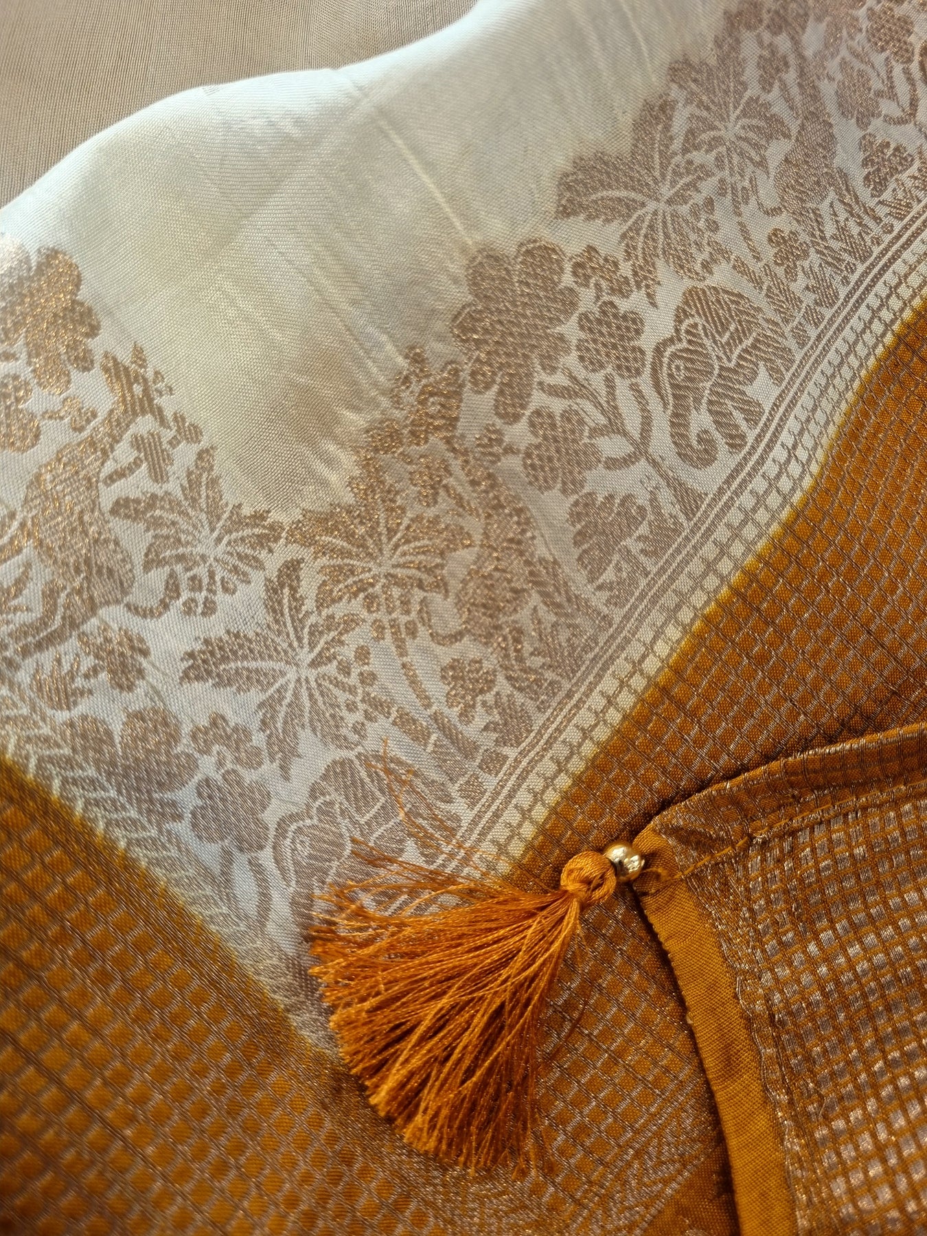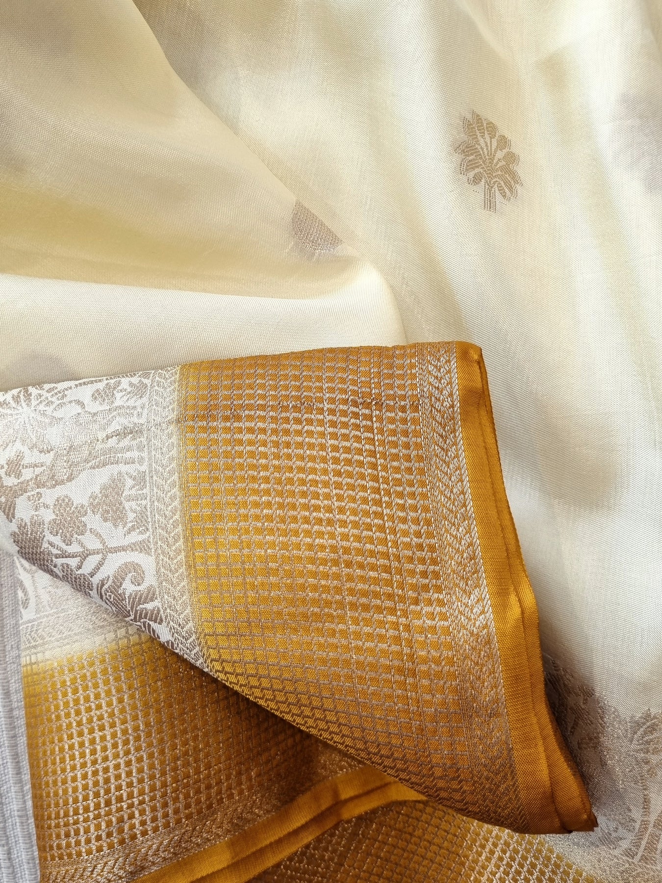 • The beautiful Gold zari patterns on the body pallu elevates the style quotient