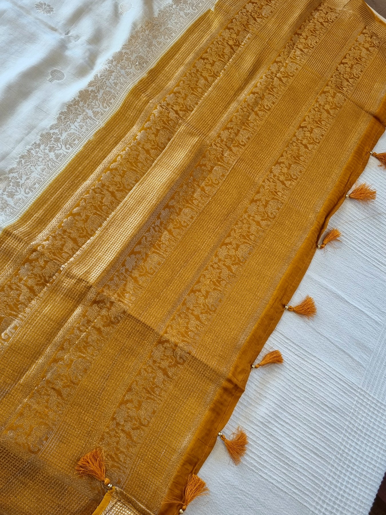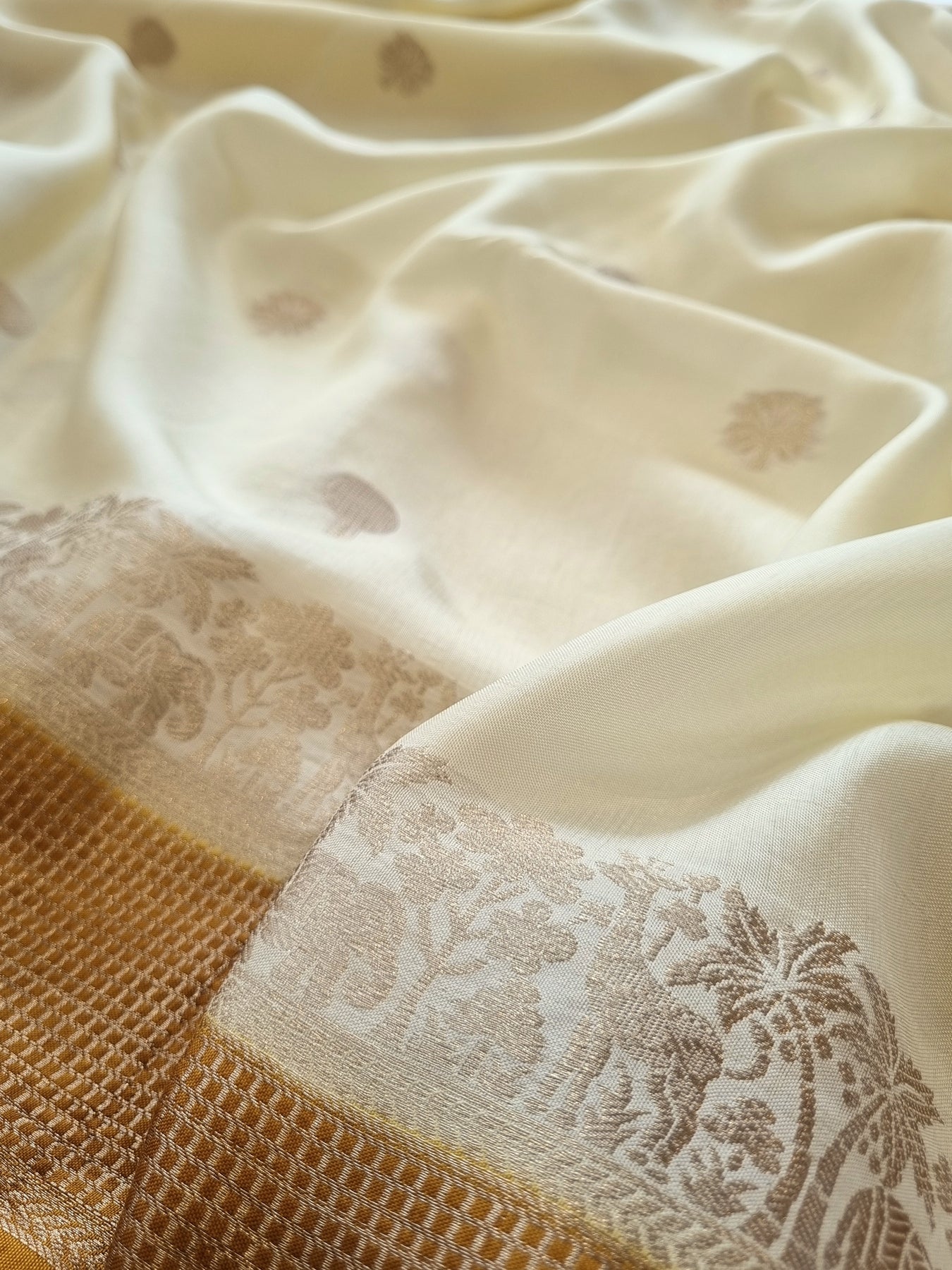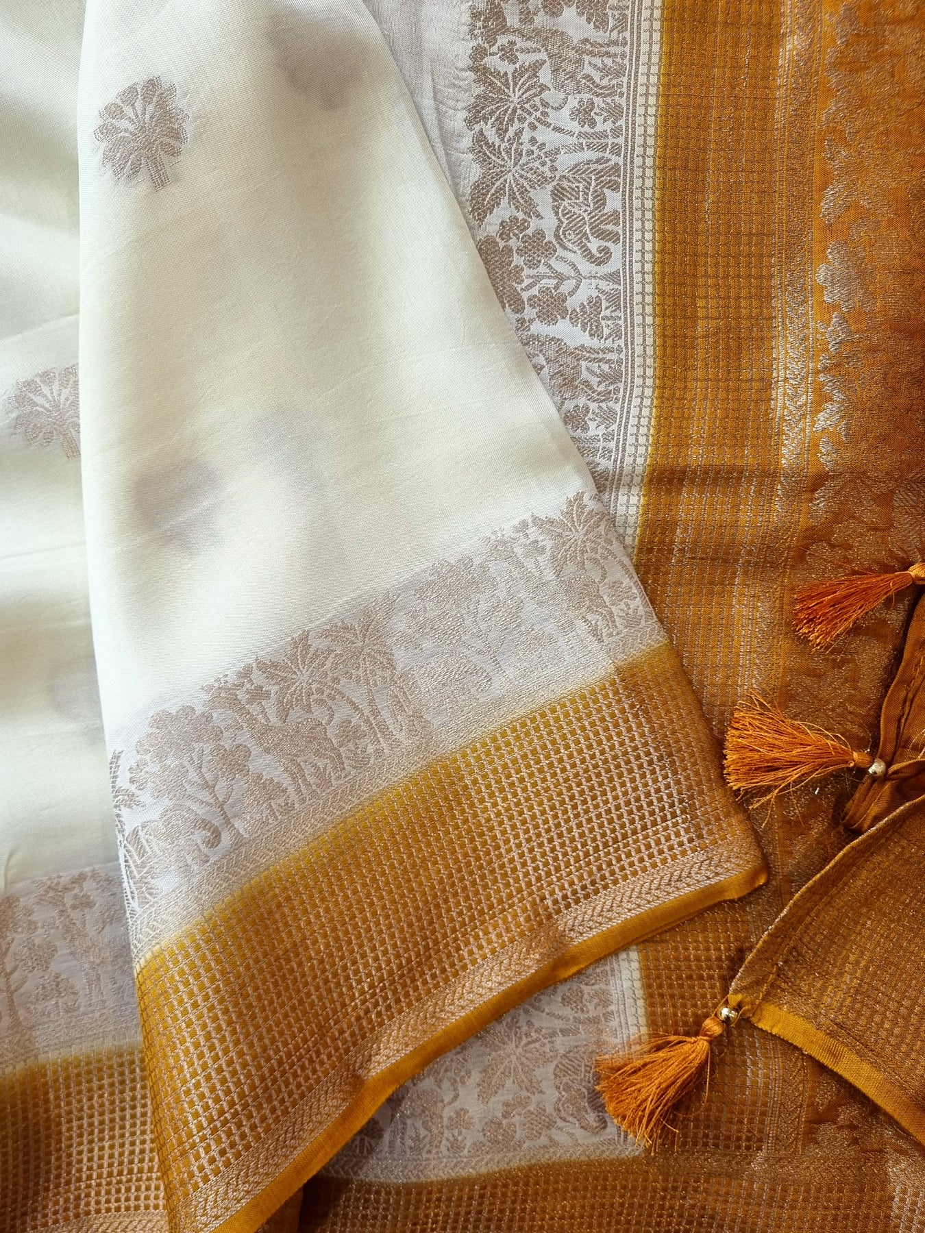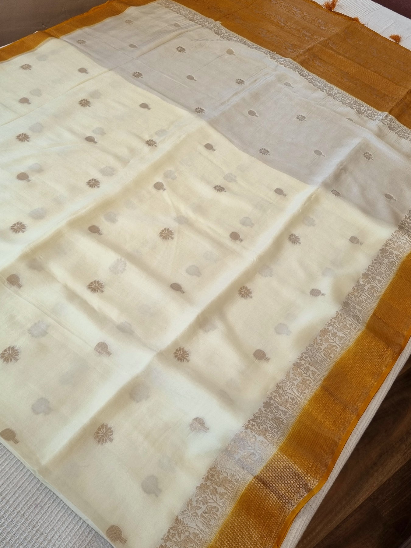 • The beautiful Gold zari patterns on the body pallu elevates the style quotient