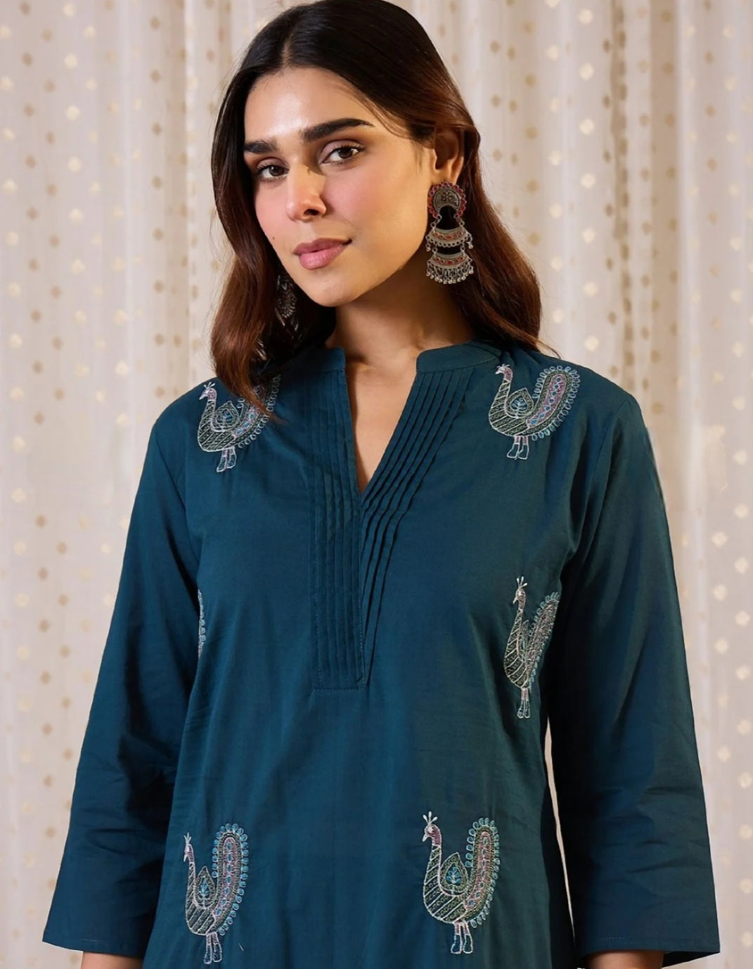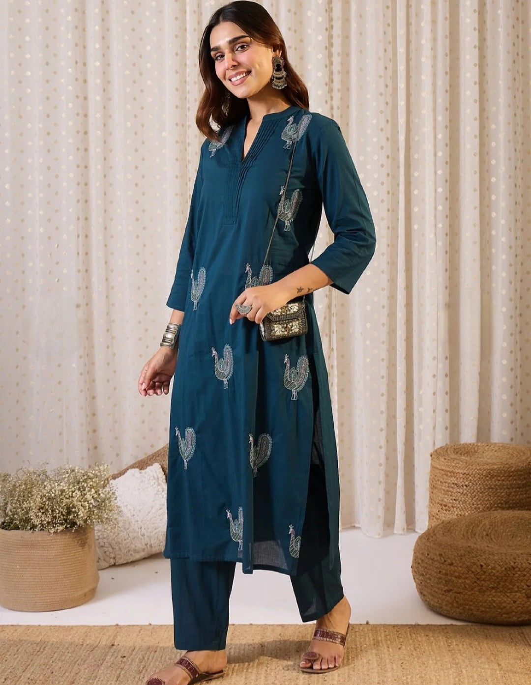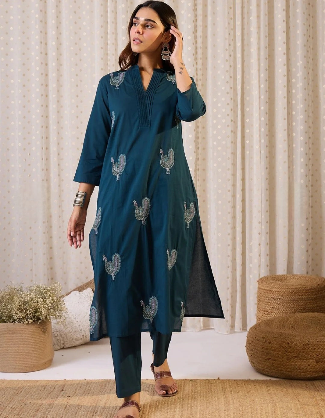 Ethnic Motif Printed Blue V neck Cotton Kurta with Trousers