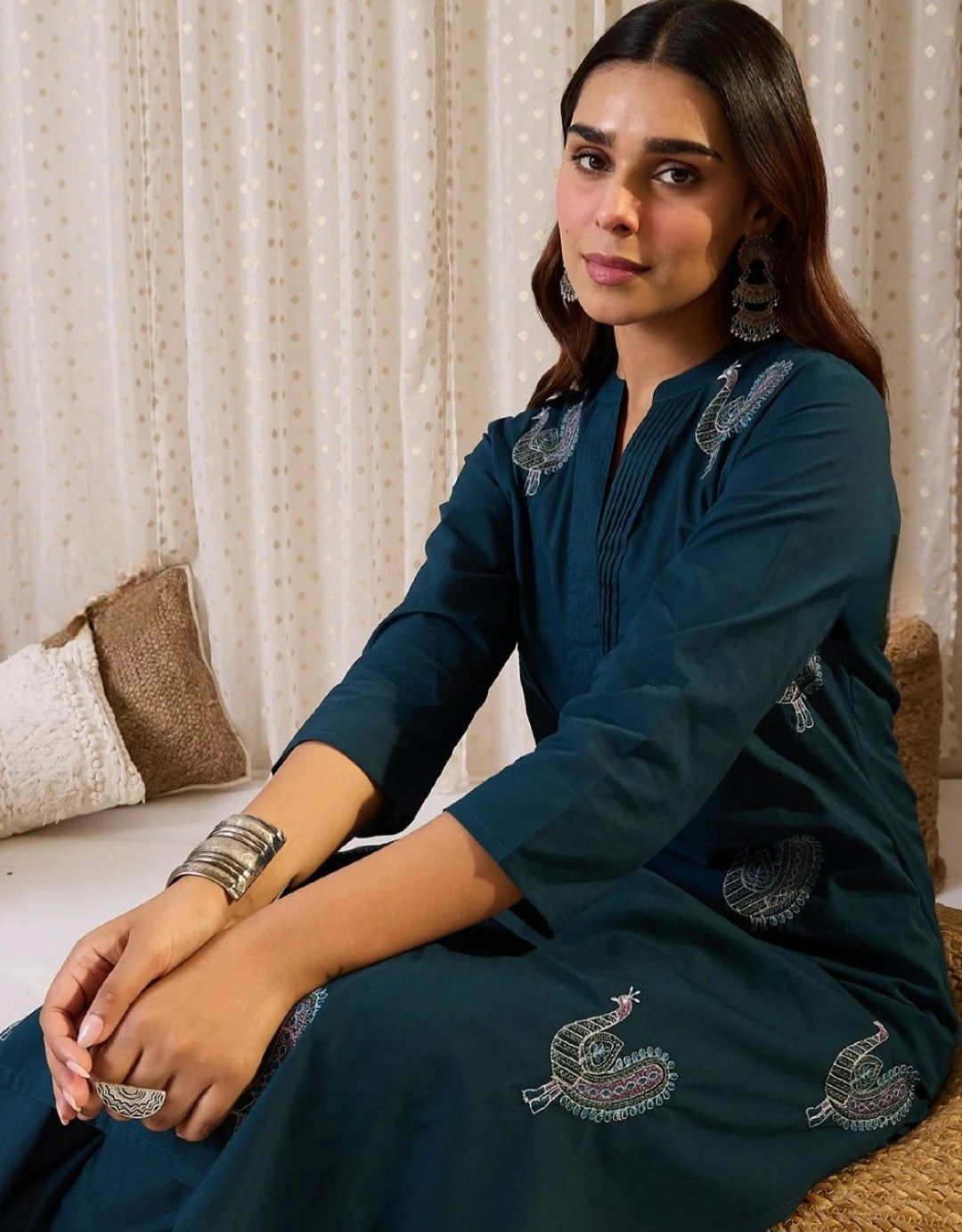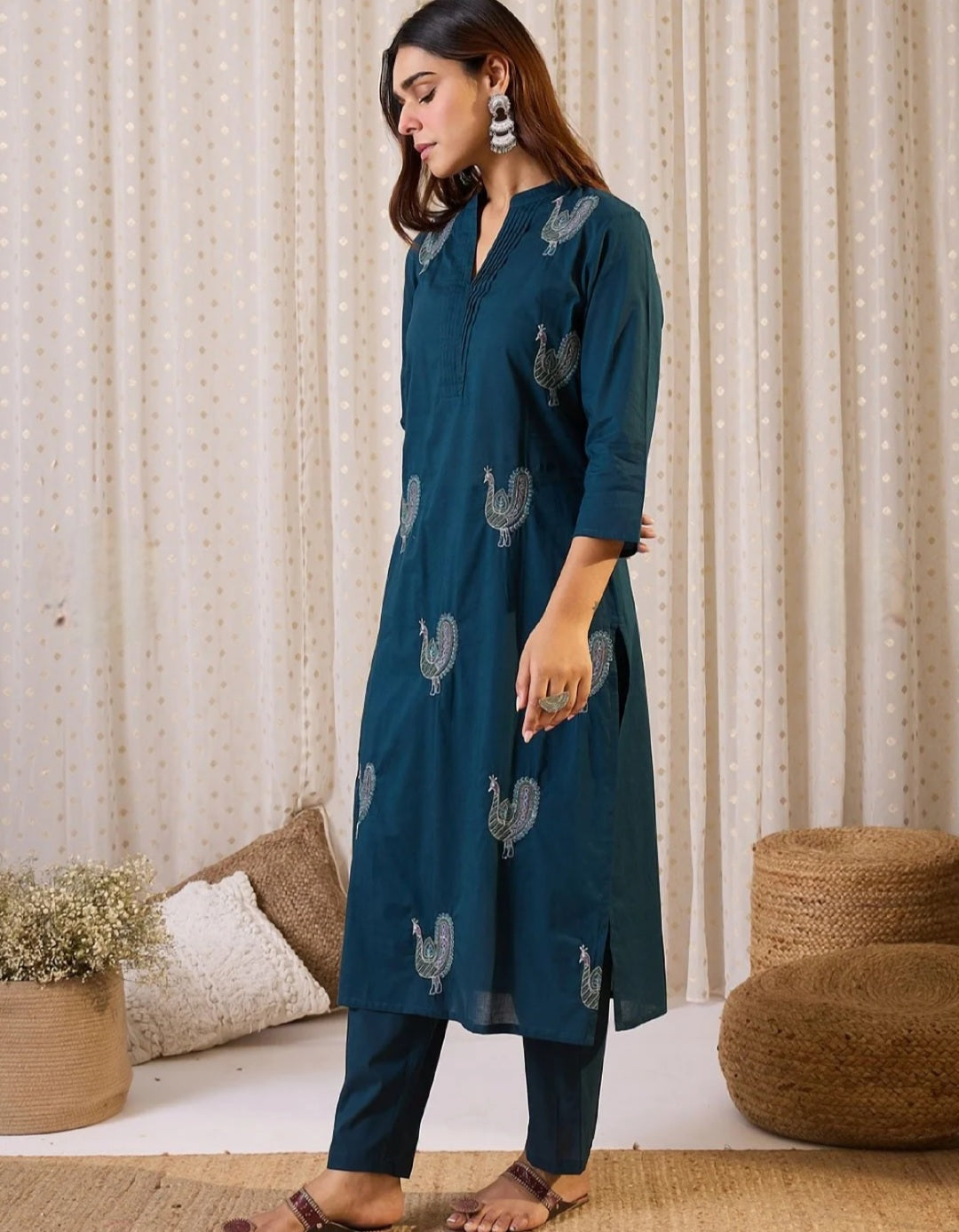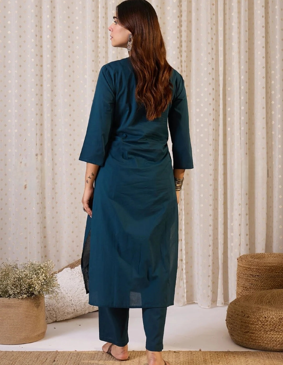 Ethnic Motif Printed Blue V neck Cotton Kurta with Trousers