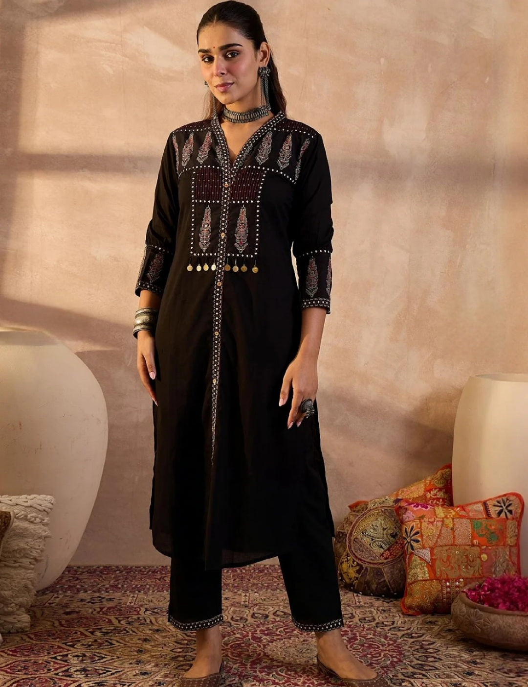 V-Neck Kurta with Ethnic Motifs Embroidery