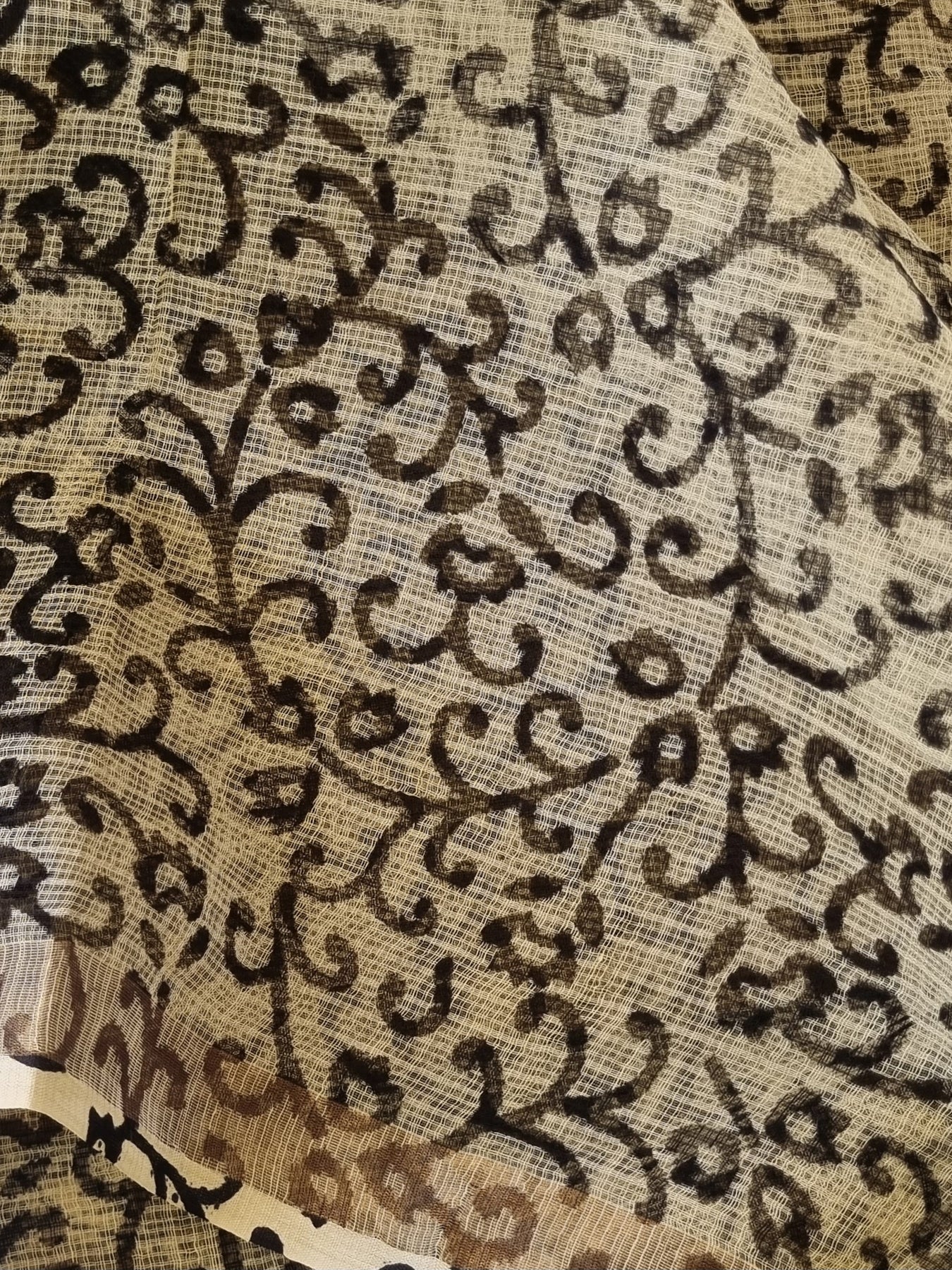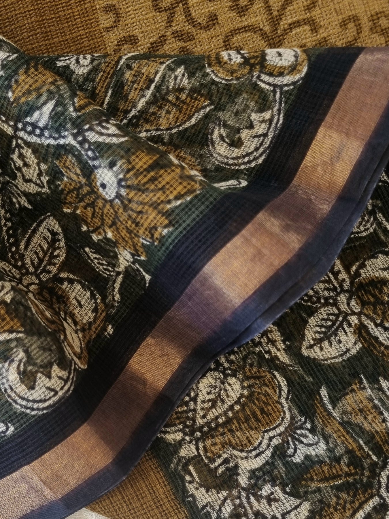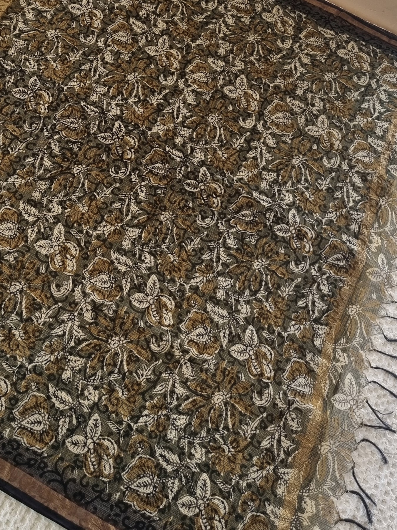 Beautiful saree with Gold borders and Block Prints on the Body & Pallu