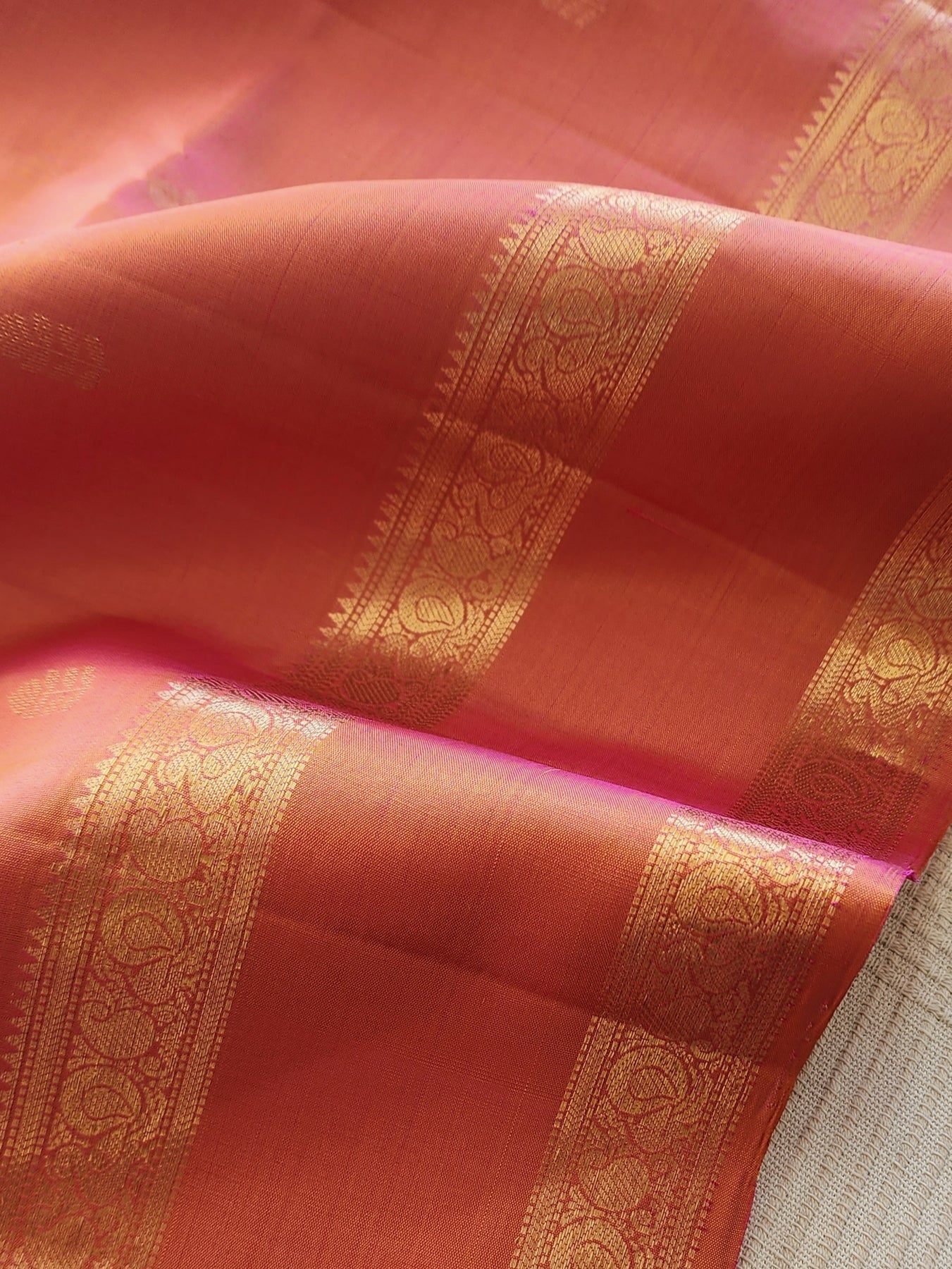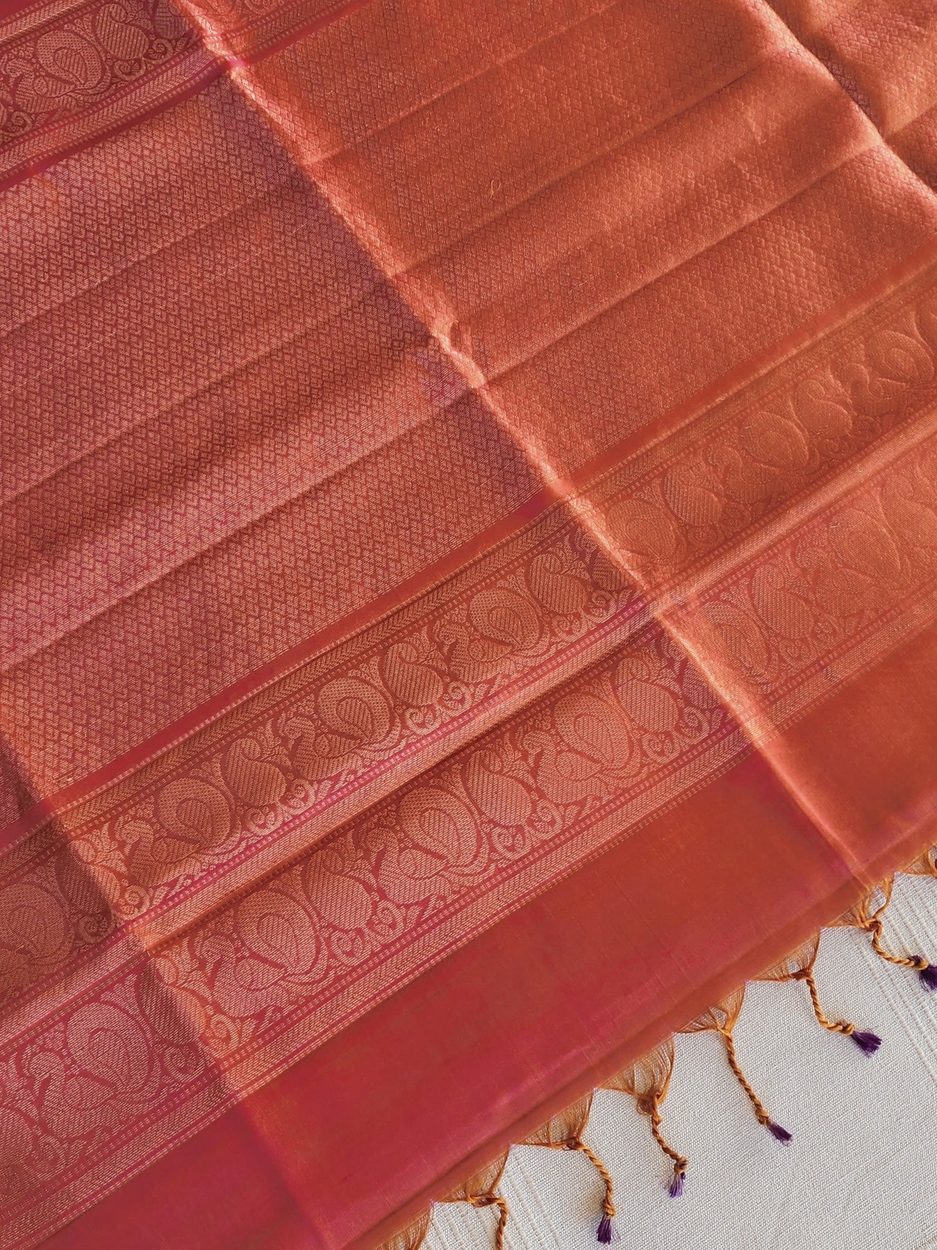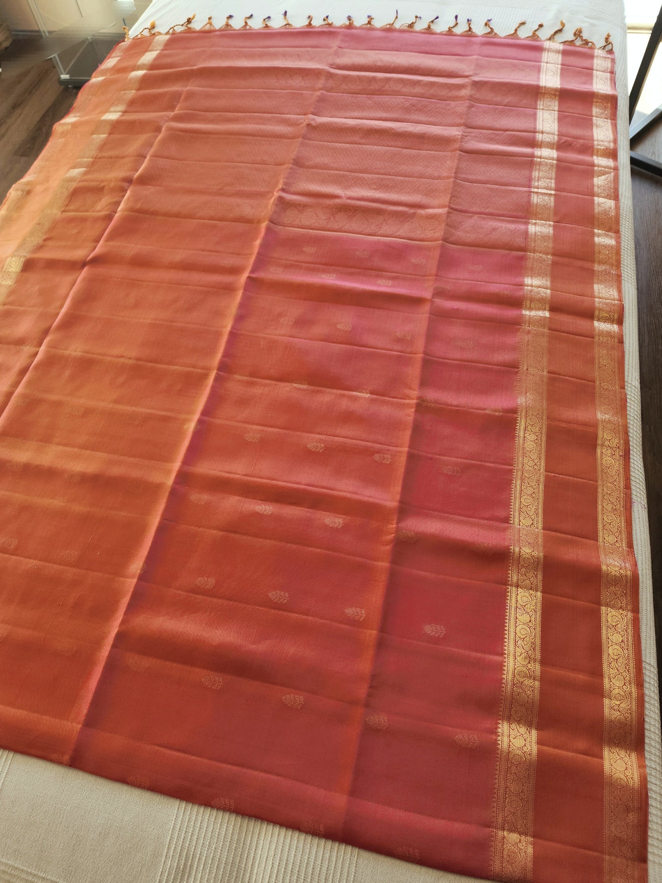 Beautiful Dual Toned Peach Handwoven Soft Silk Saree with contrast Gold zari Borders and intricately woven gold motifs on the body and a rich contrast woven pallu