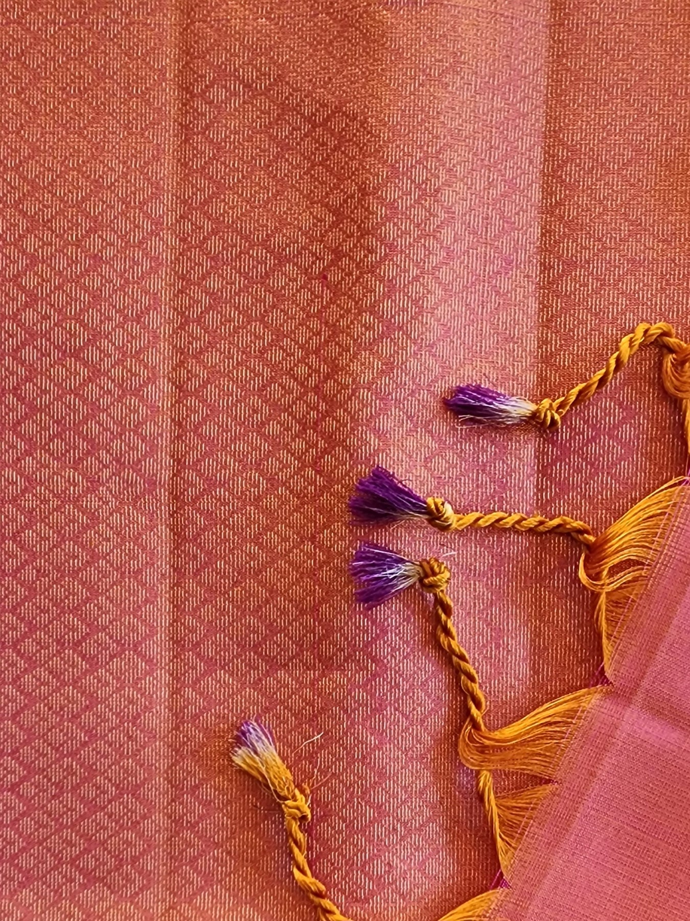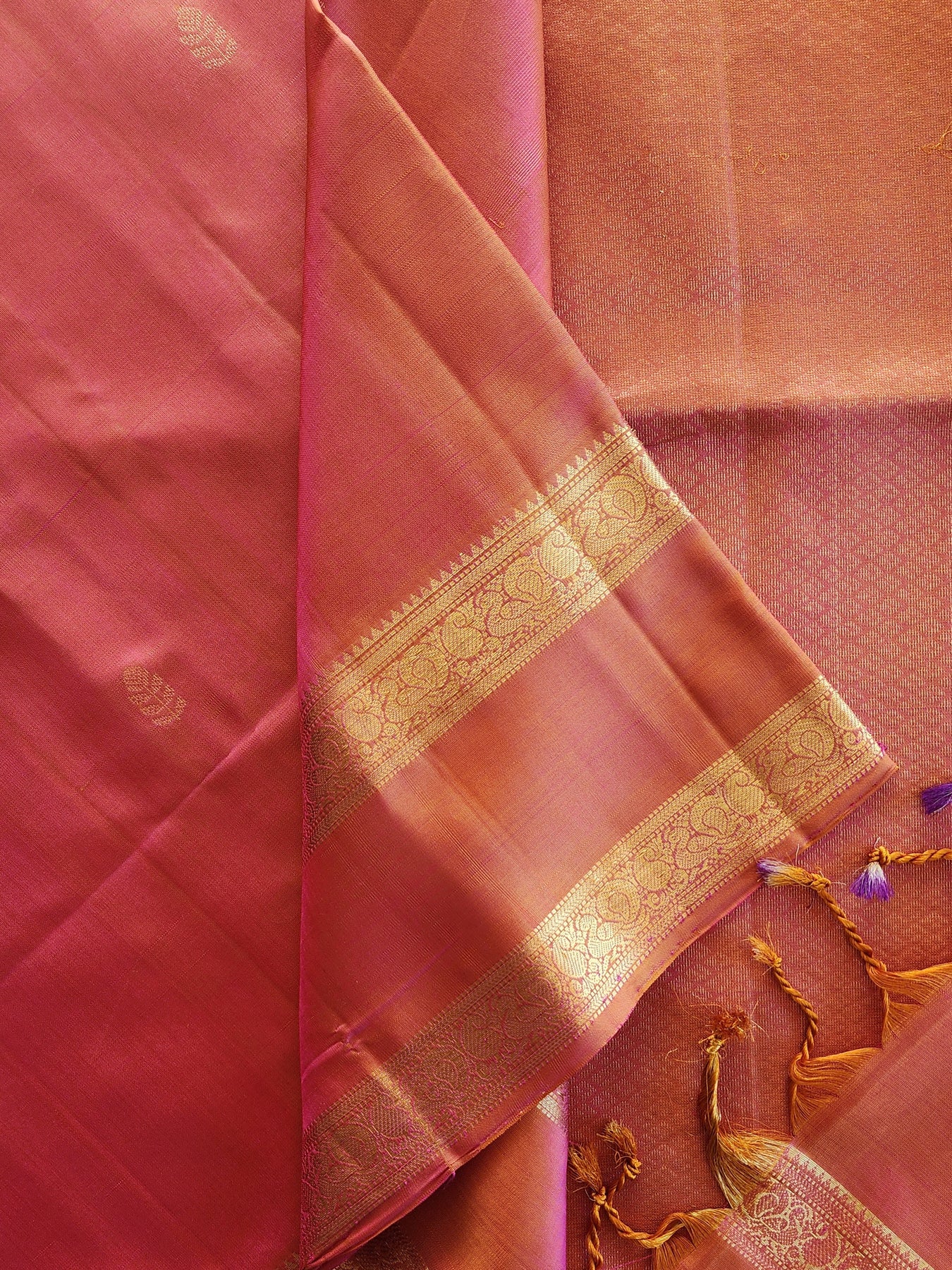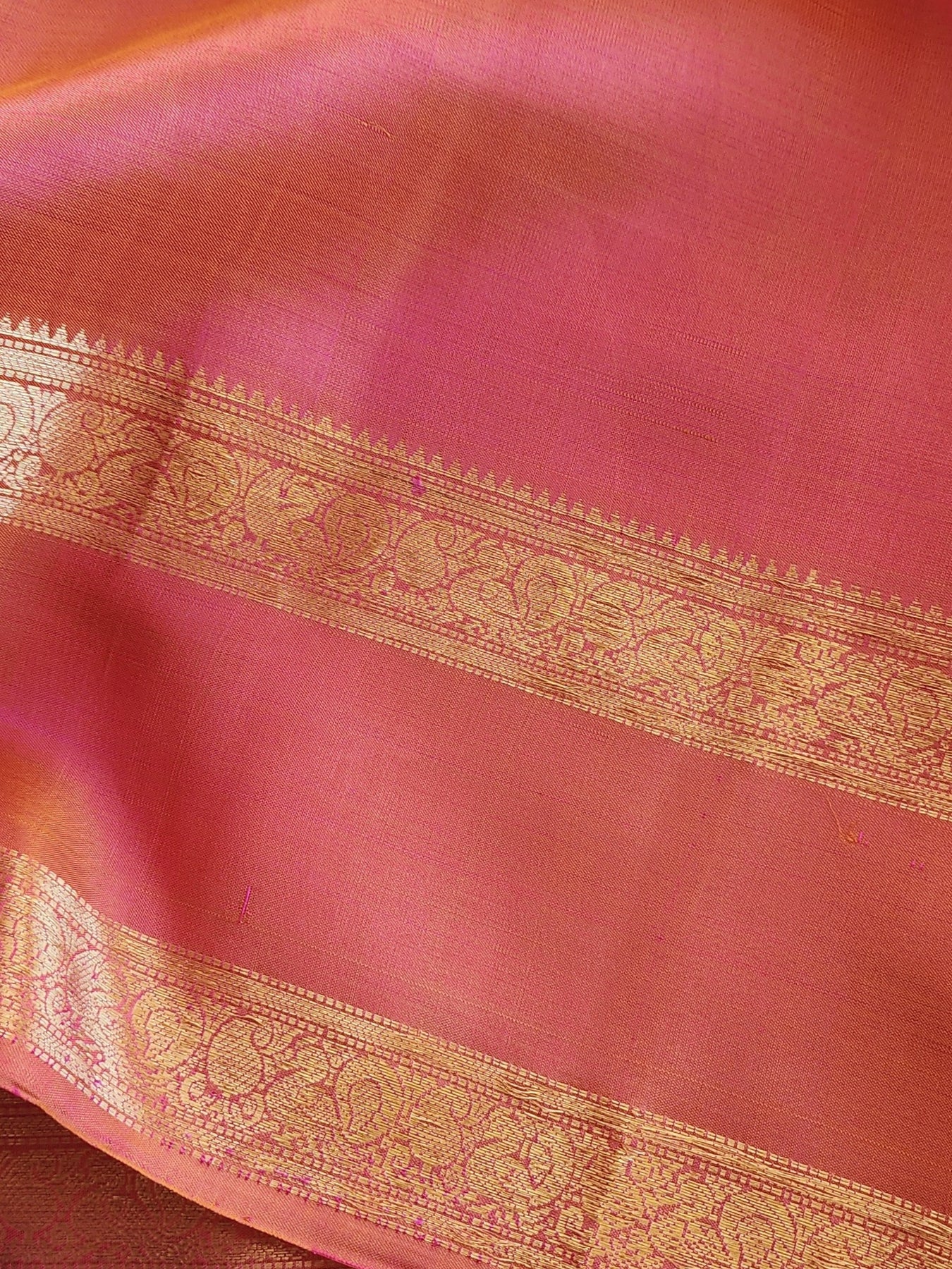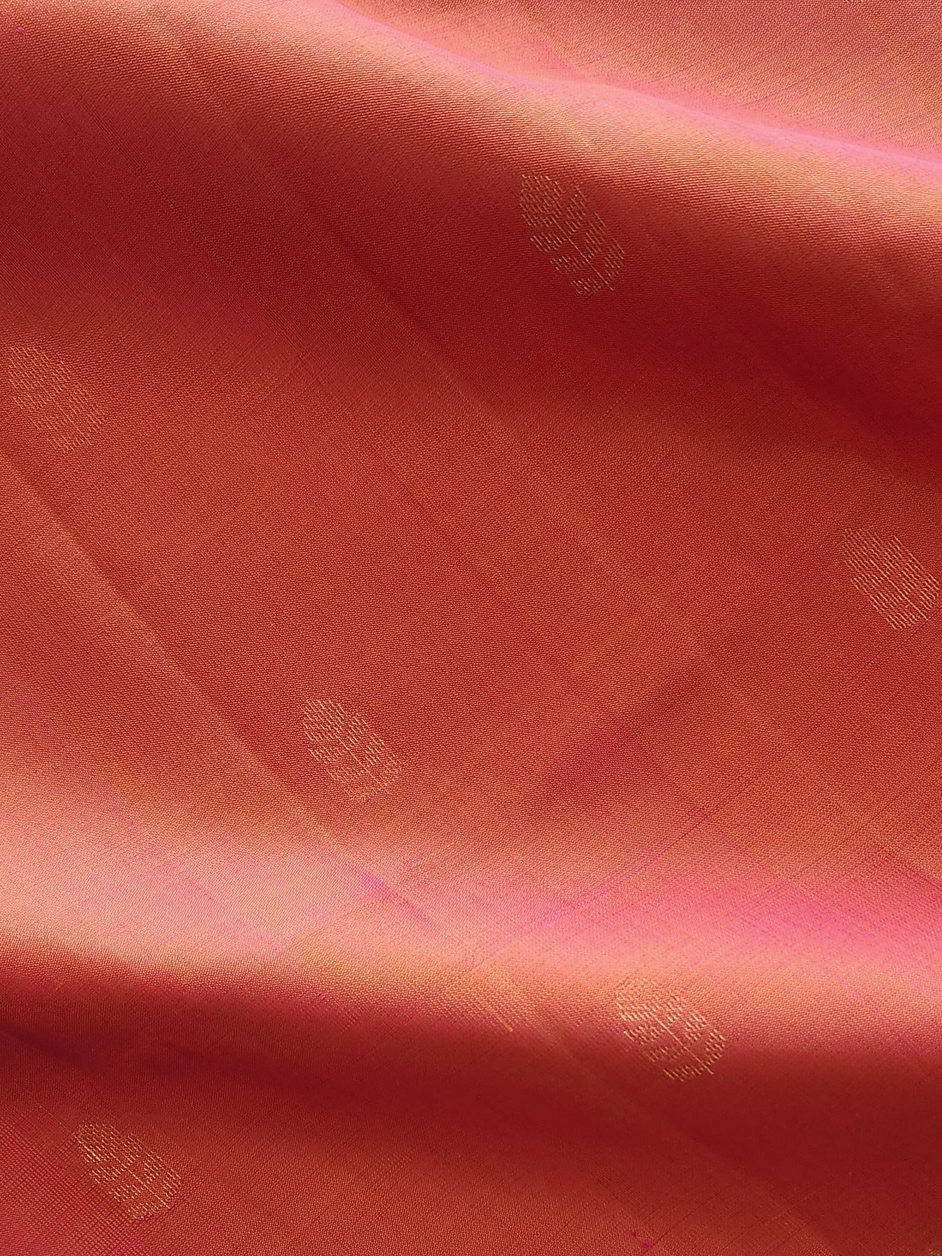 Beautiful Dual Toned Peach Handwoven Soft Silk Saree with contrast Gold zari Borders and intricately woven gold motifs on the body and a rich contrast woven pallu