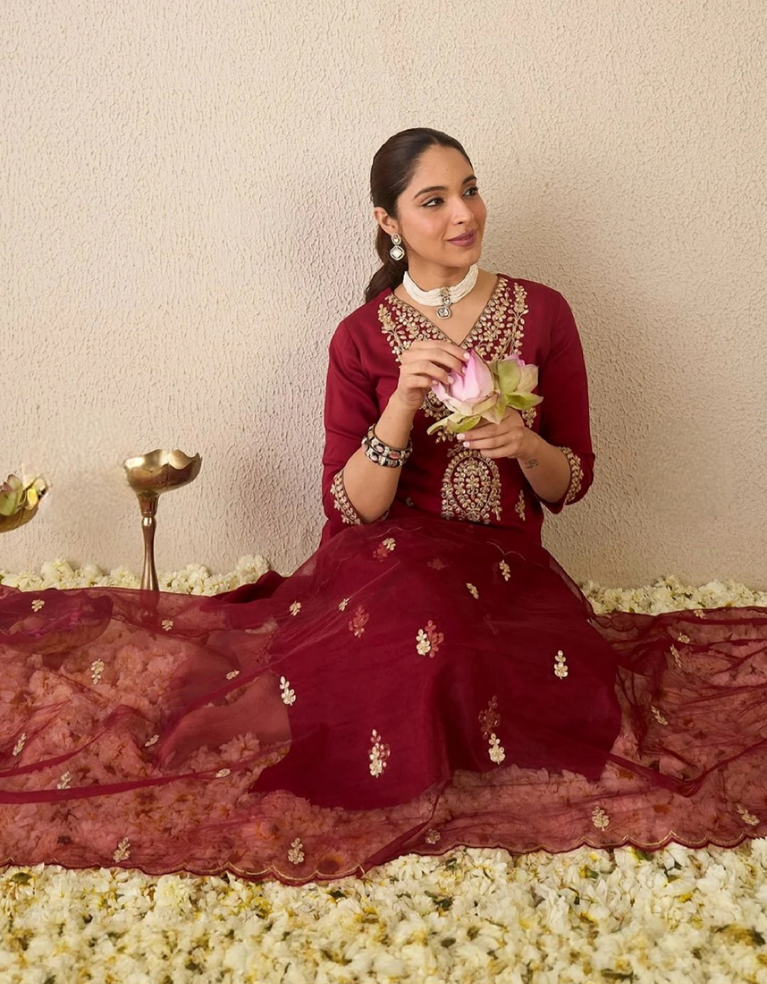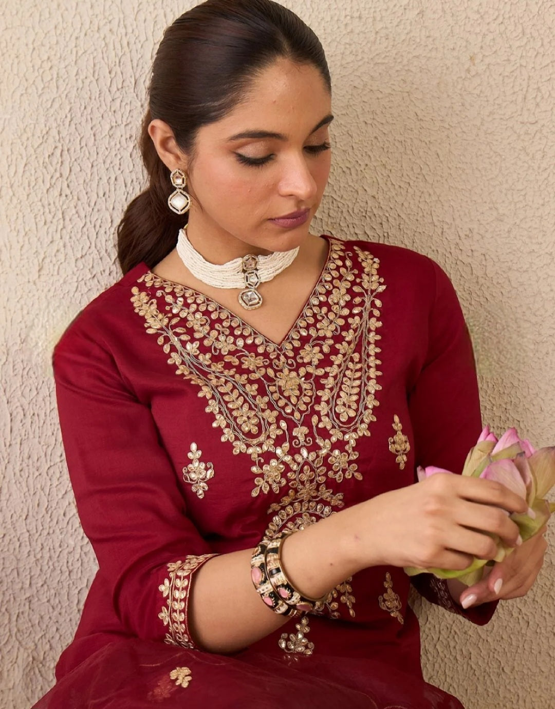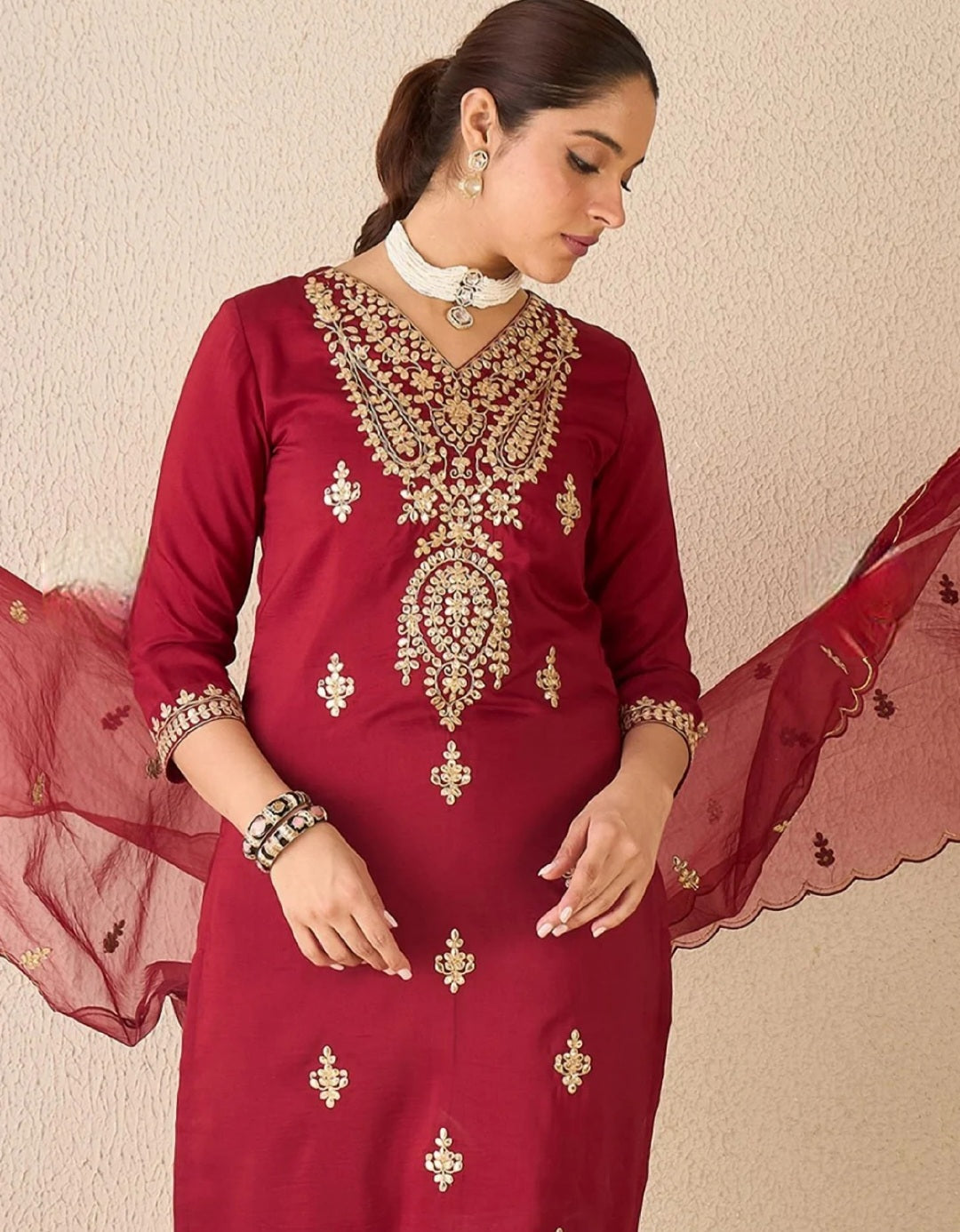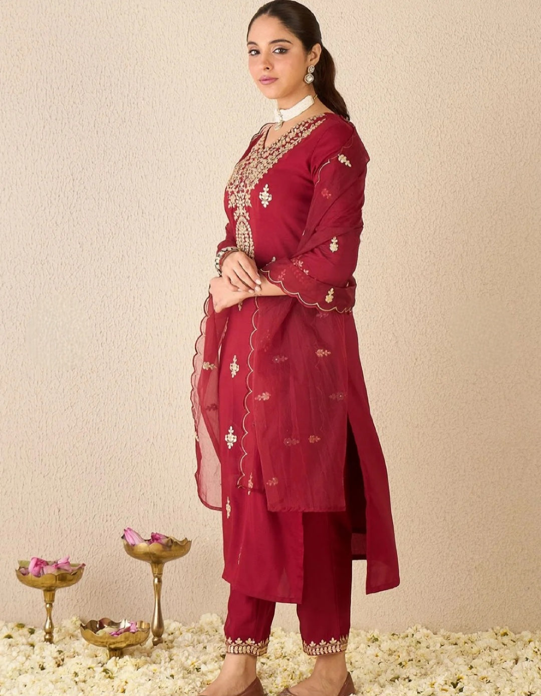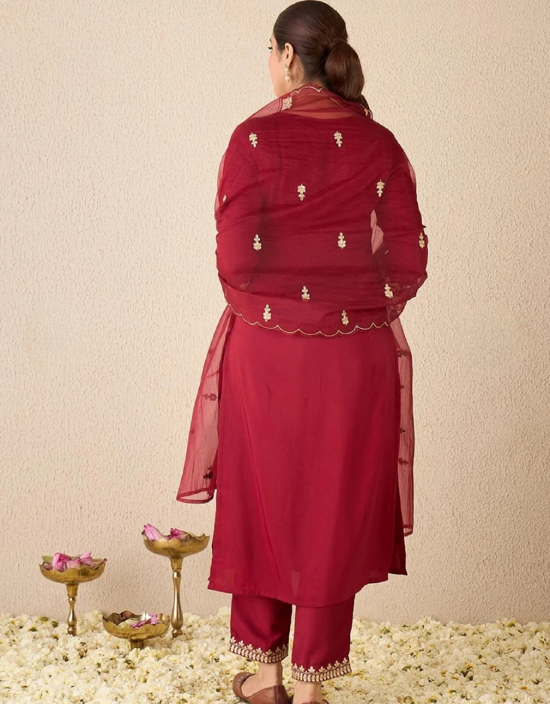 Maroon Red Embroidered & Sequinned Straight Kurta with Trousers and Dupatta