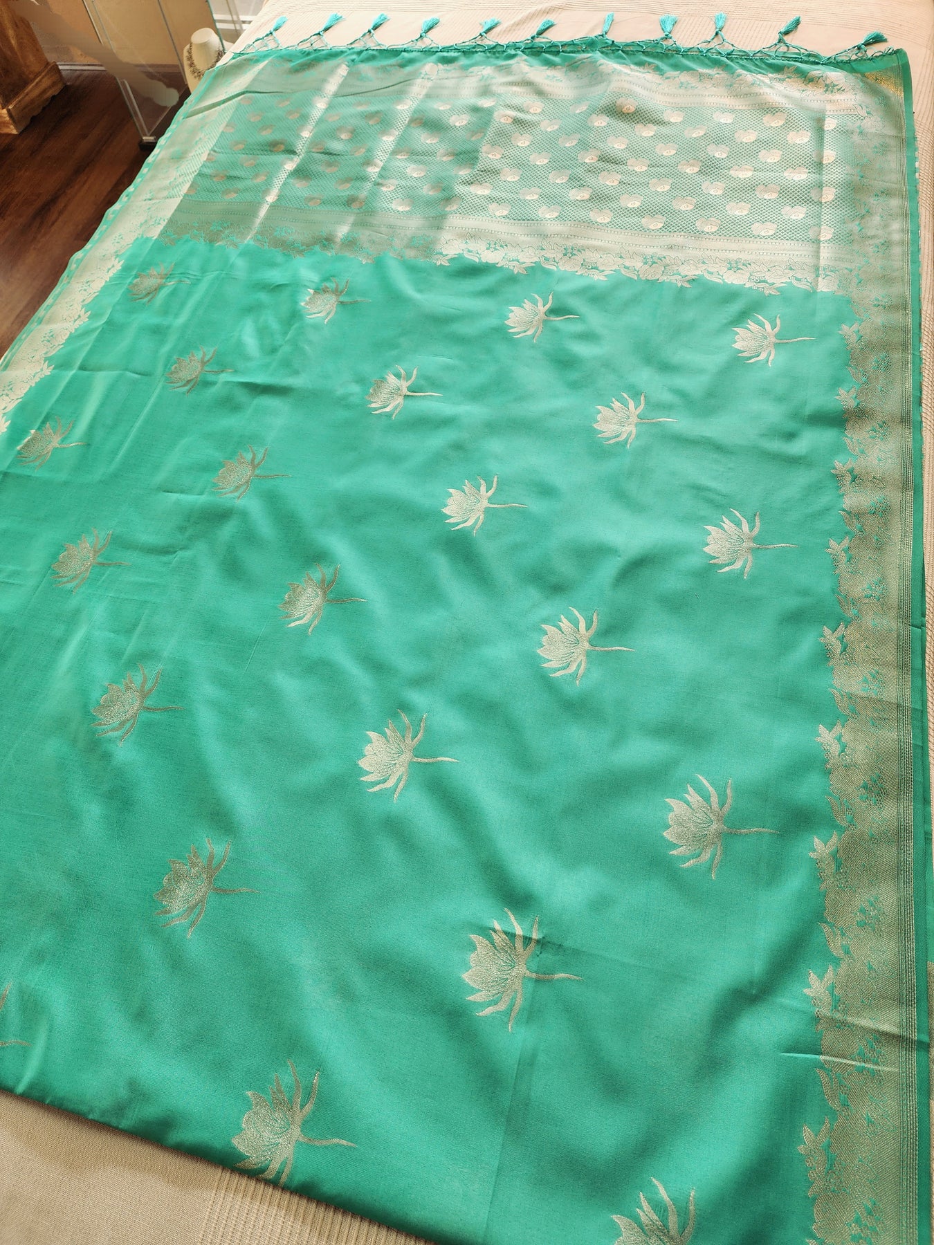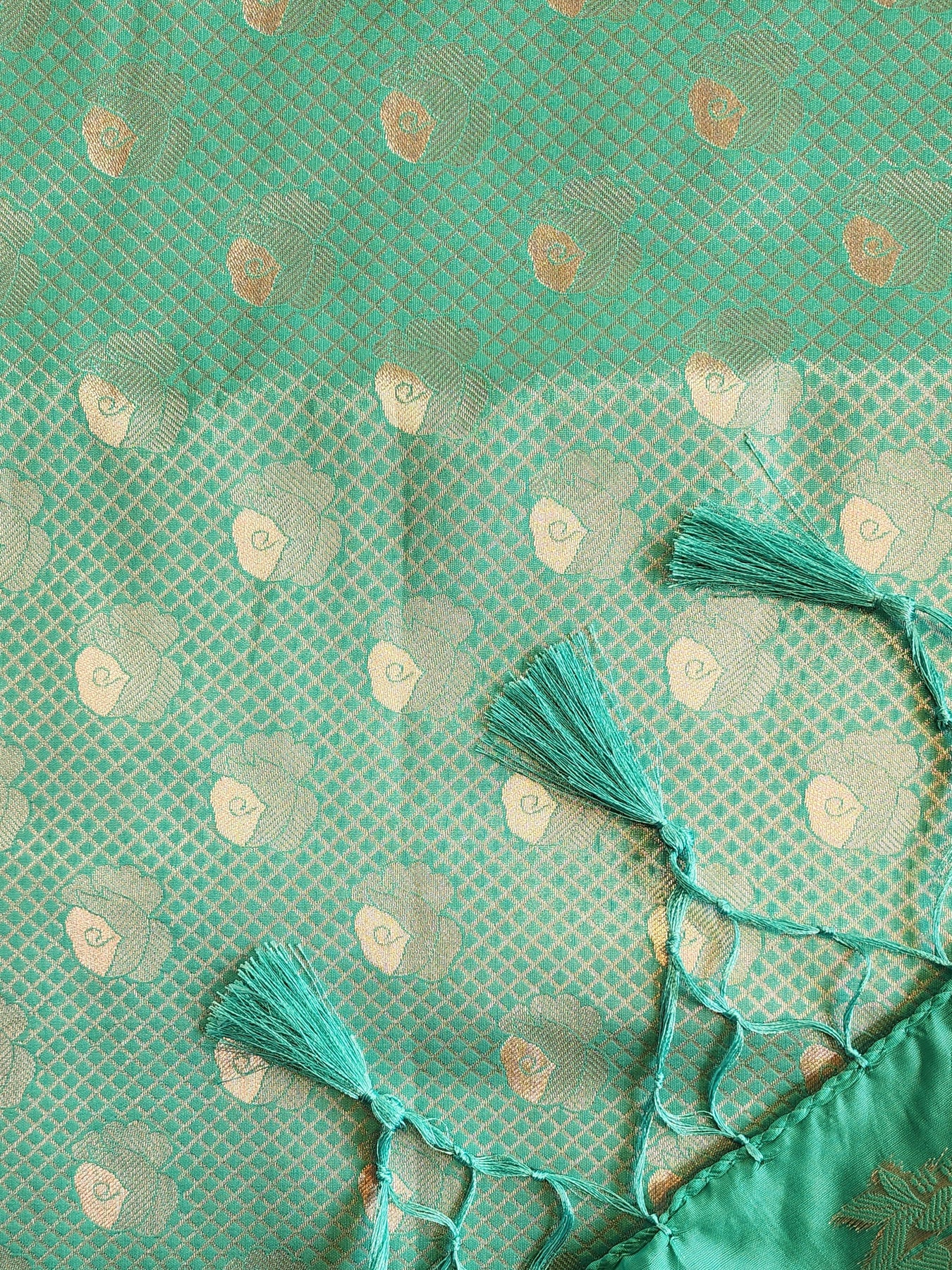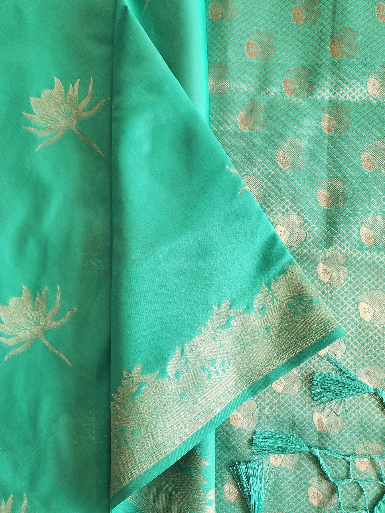 Turquoise Semi Silk Saree with woven borders and pallu, beautifully finished with tassels