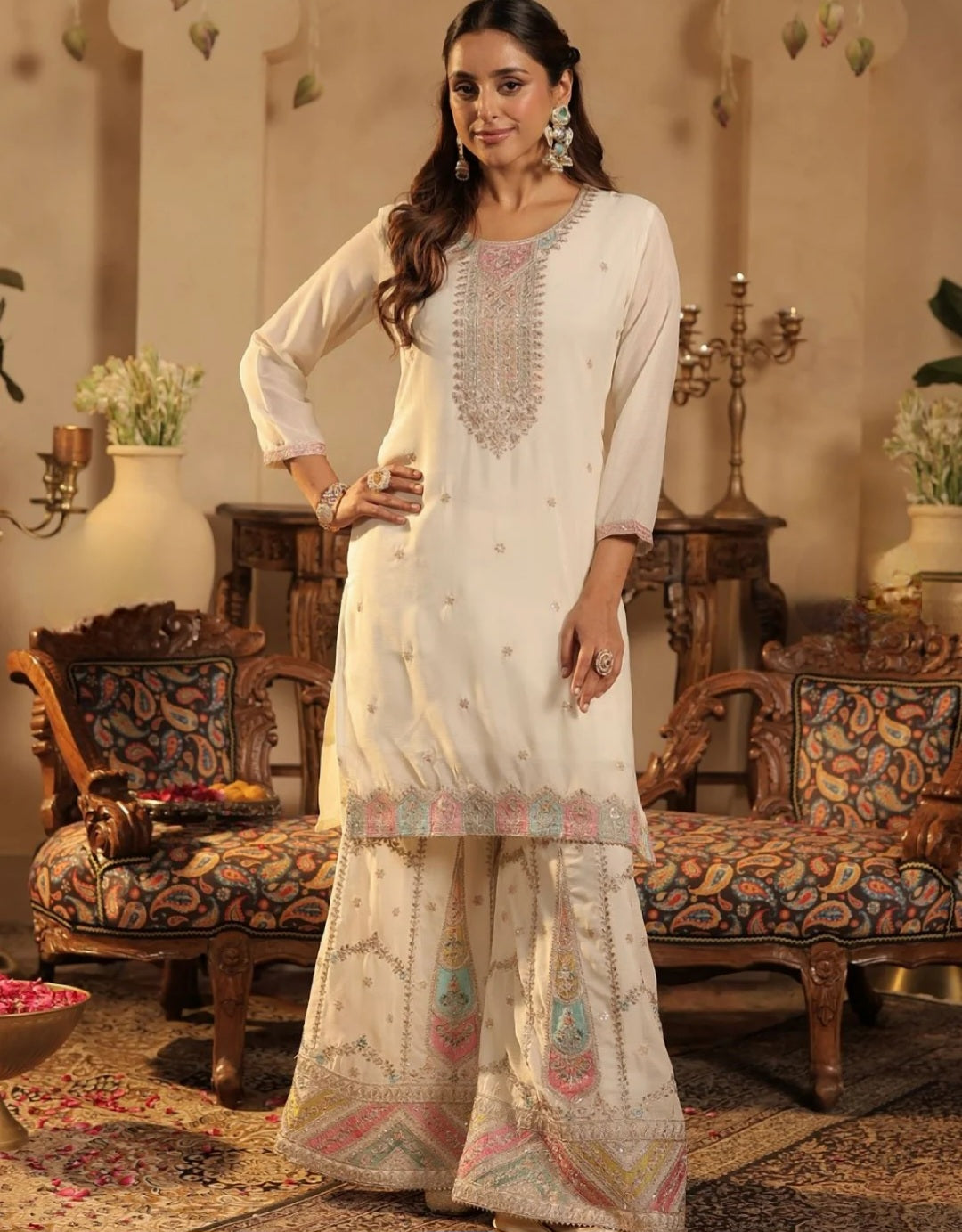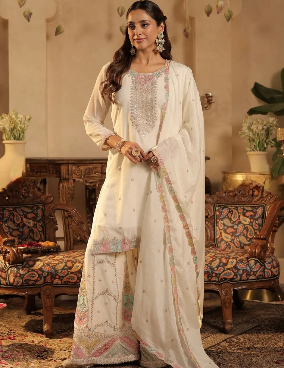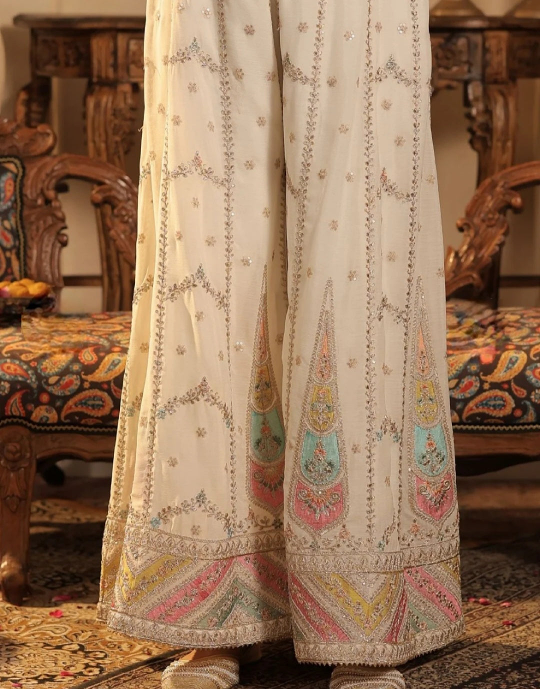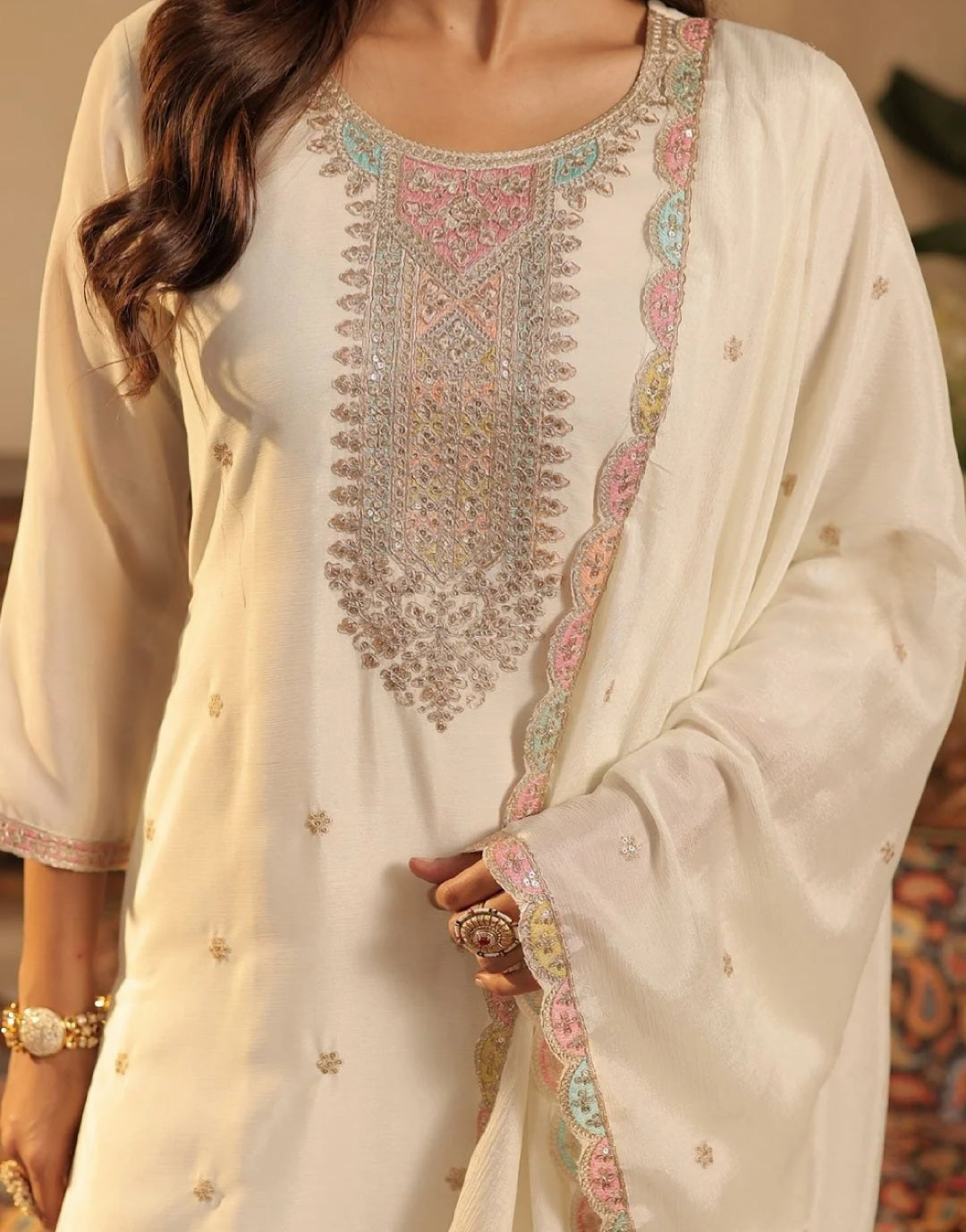 Off White Embroidered & Sequinned A- Line Kurta with Trousers and & Banarassi Dupatta