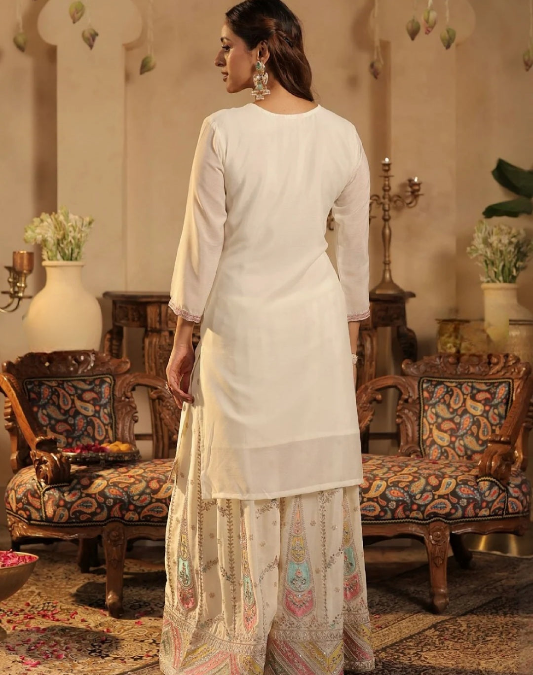 Off White Embroidered Kurta Set with a Banarasi Dupatta