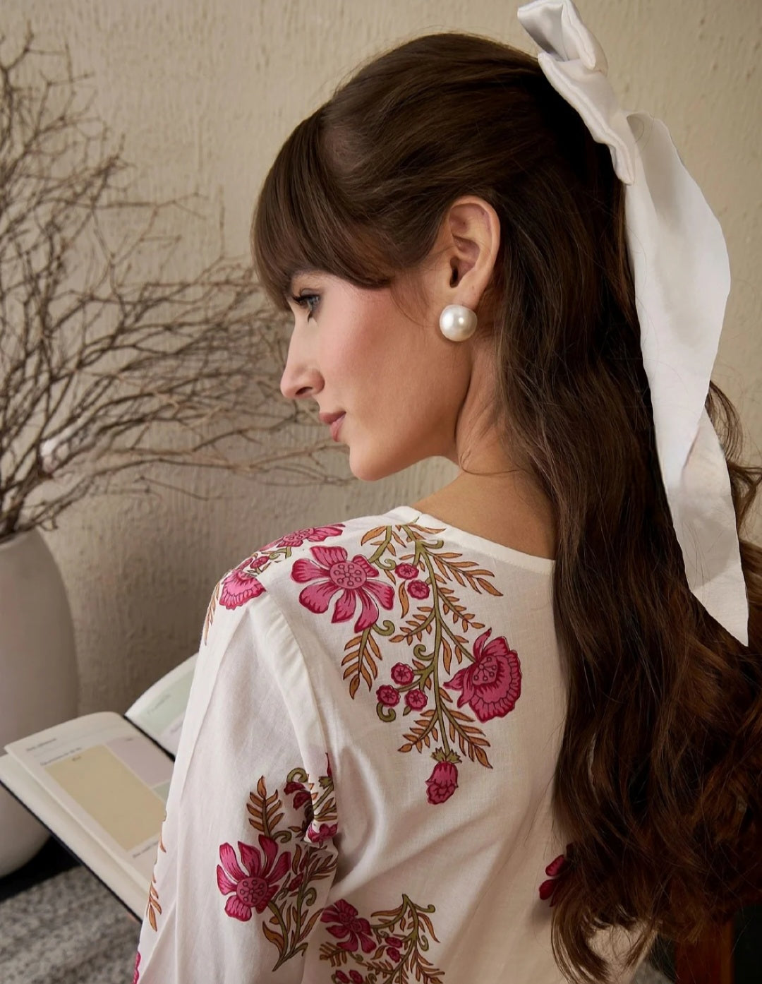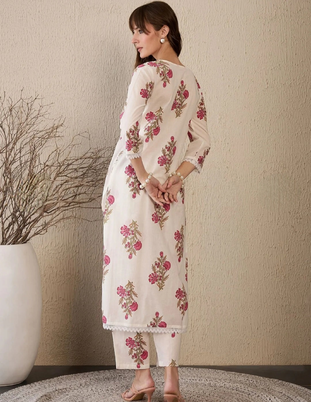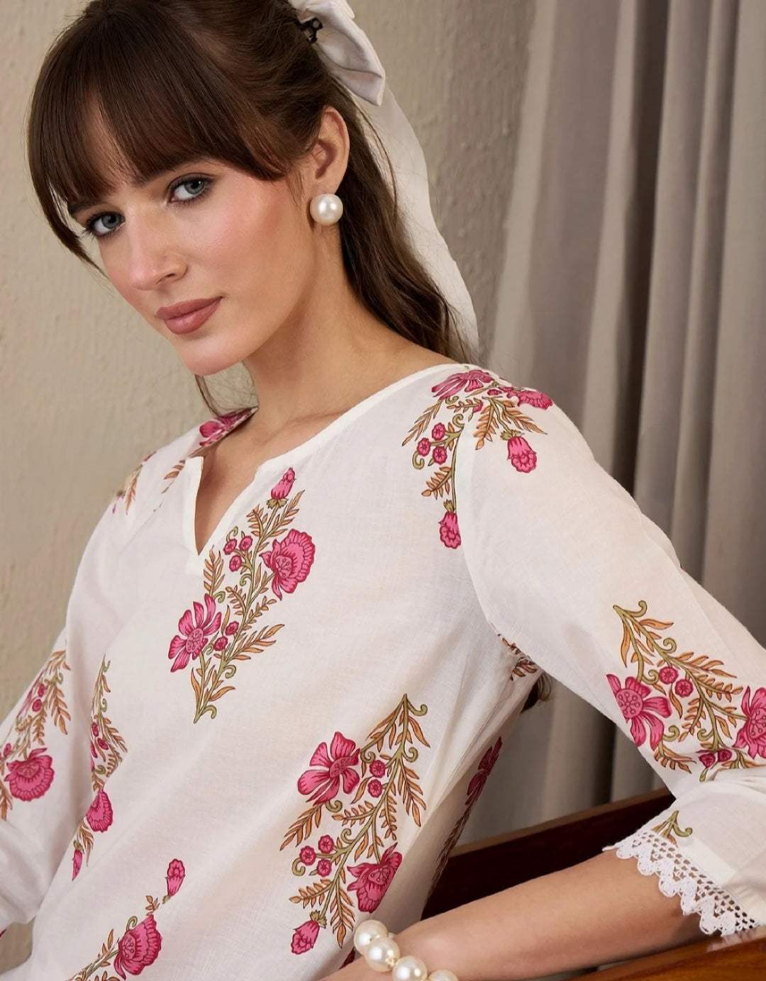 • Floral Printed V- neck Kurta with Elbow Length Sleeves