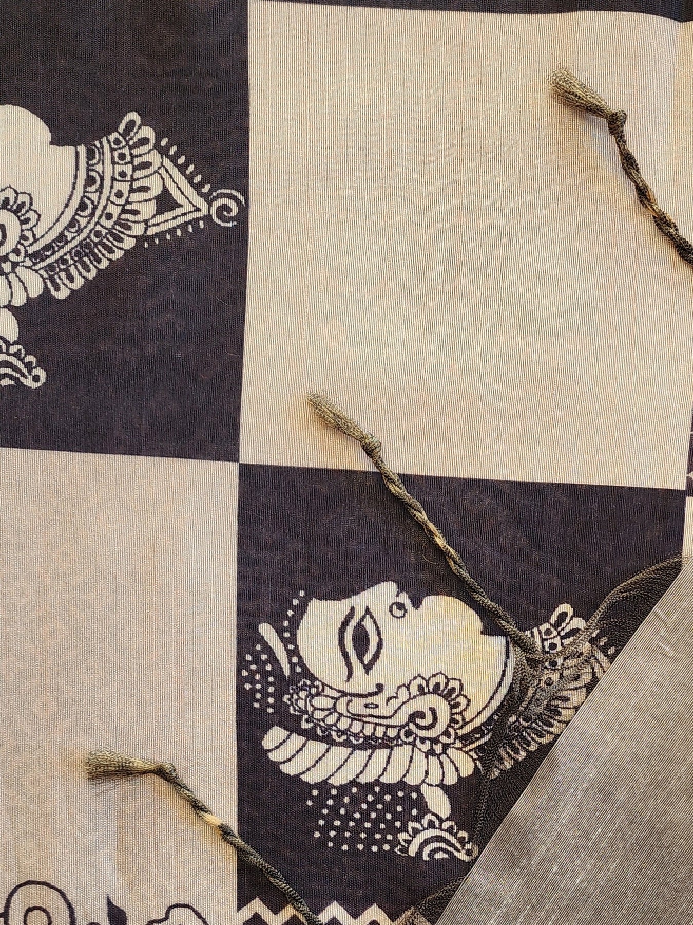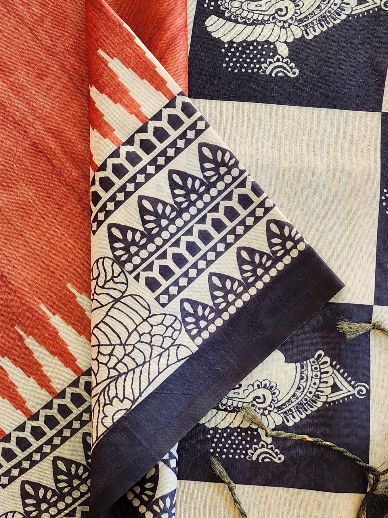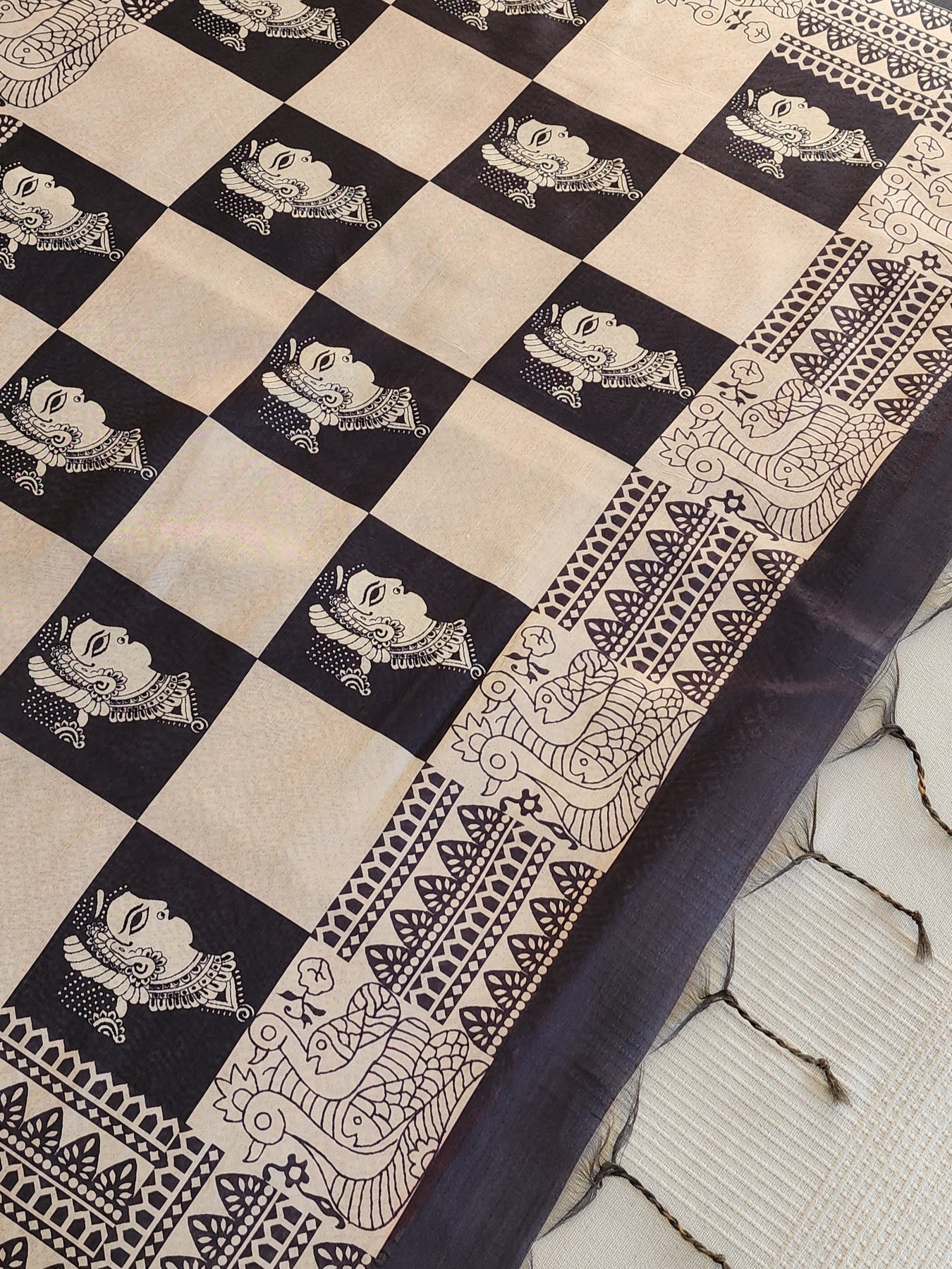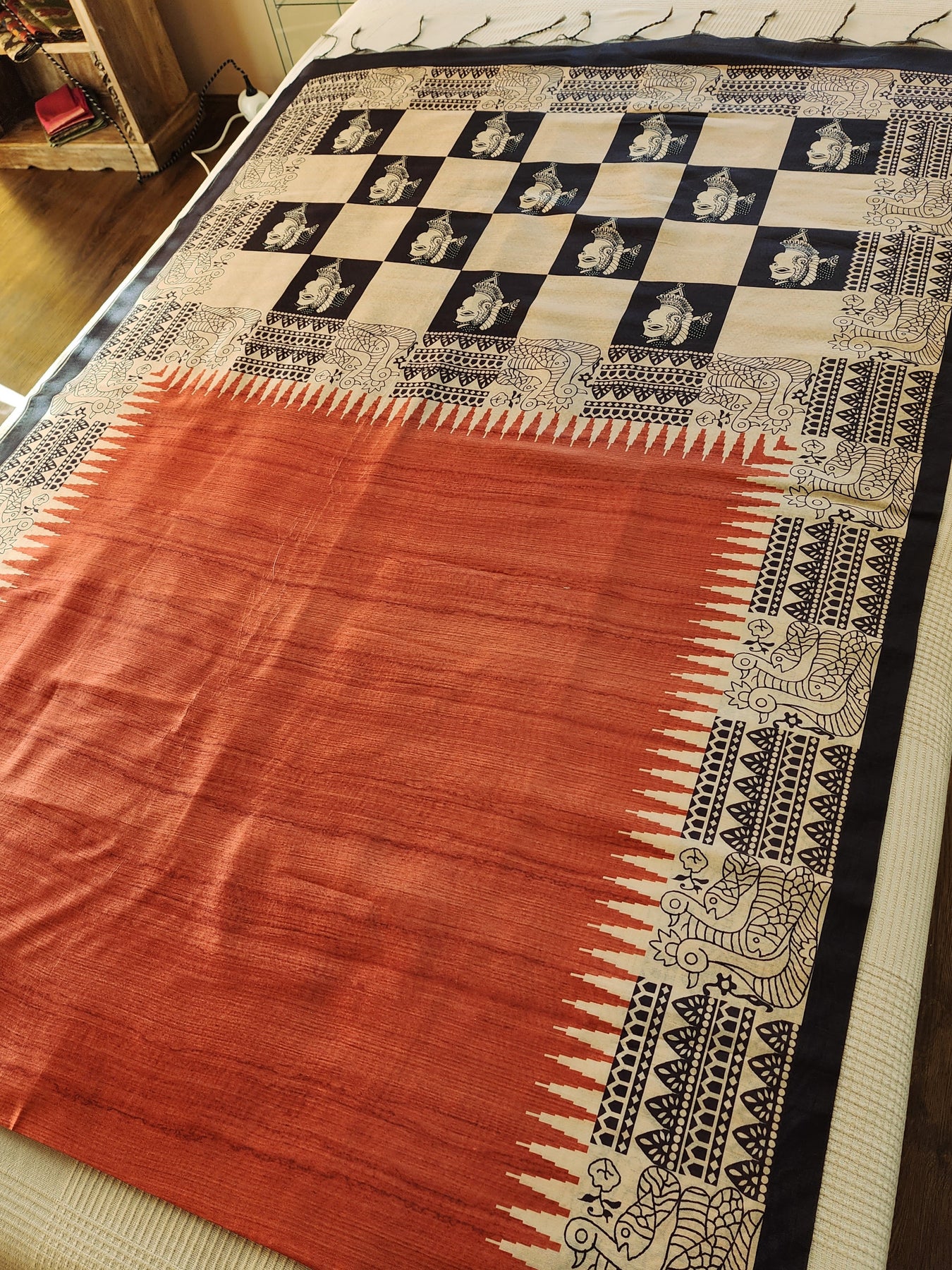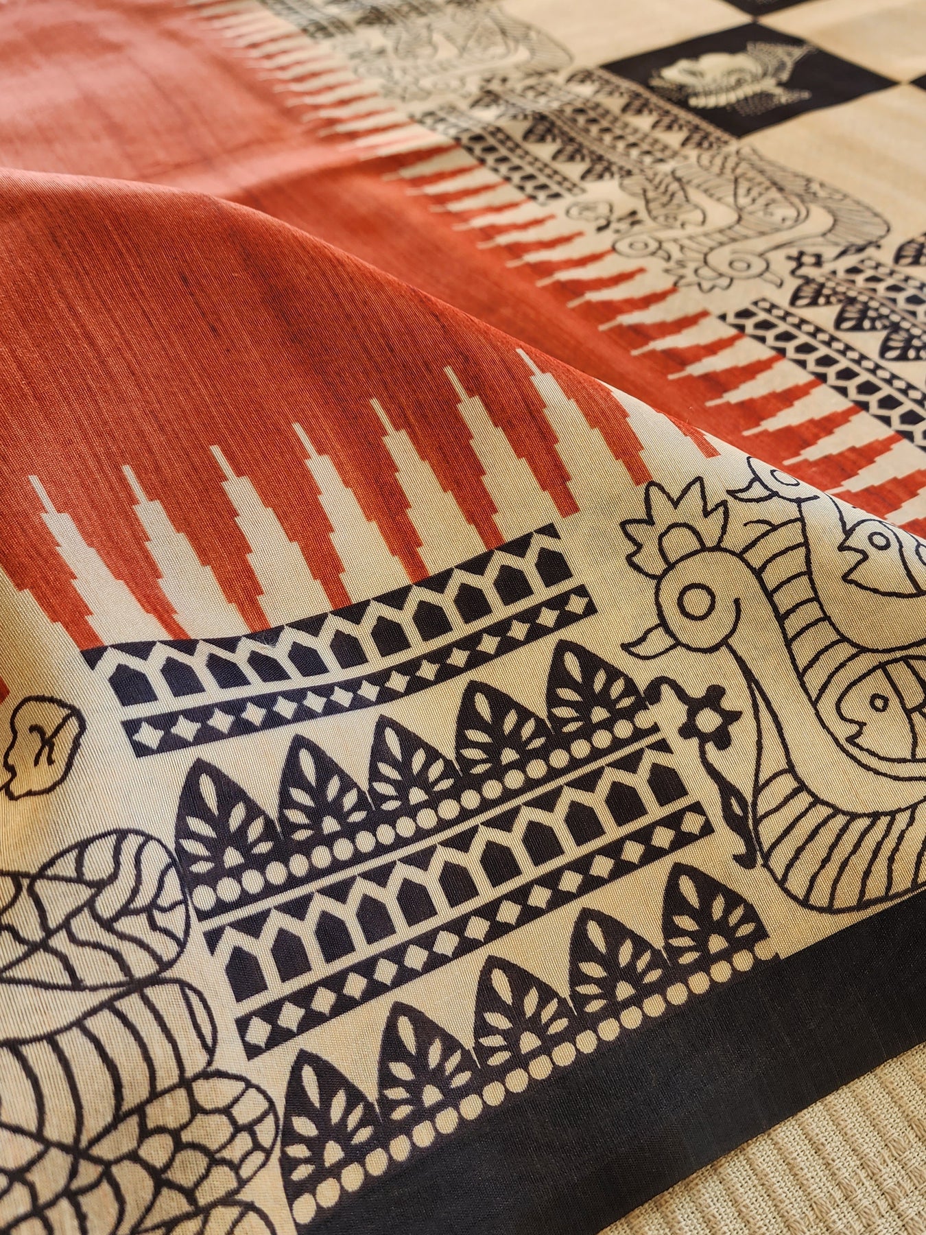 An elegant Semi Tussar Silk Saree with Madhubani Borders.