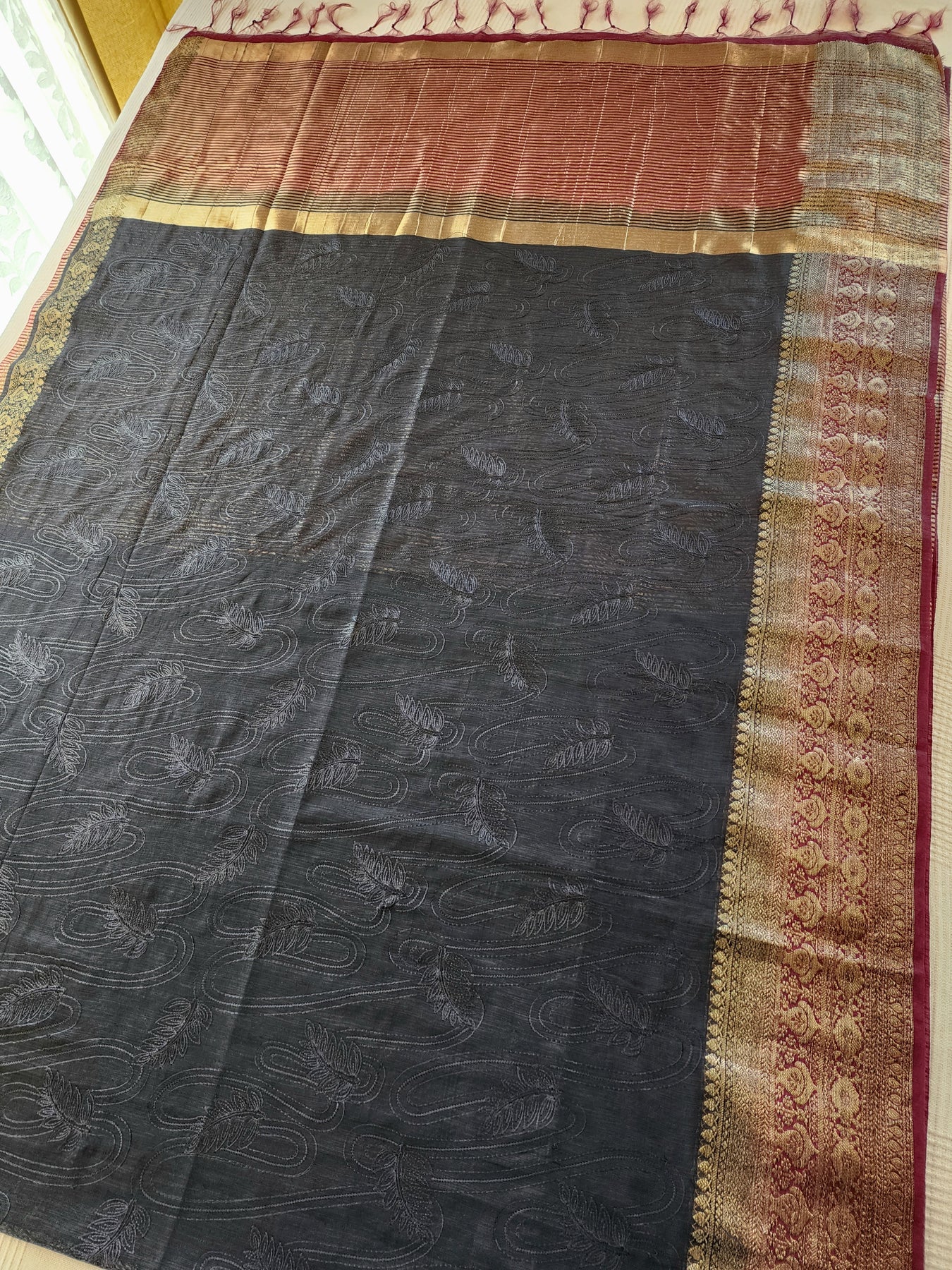 A beautiful Silk Cotton Saree with embroidered on the body and striped pallu