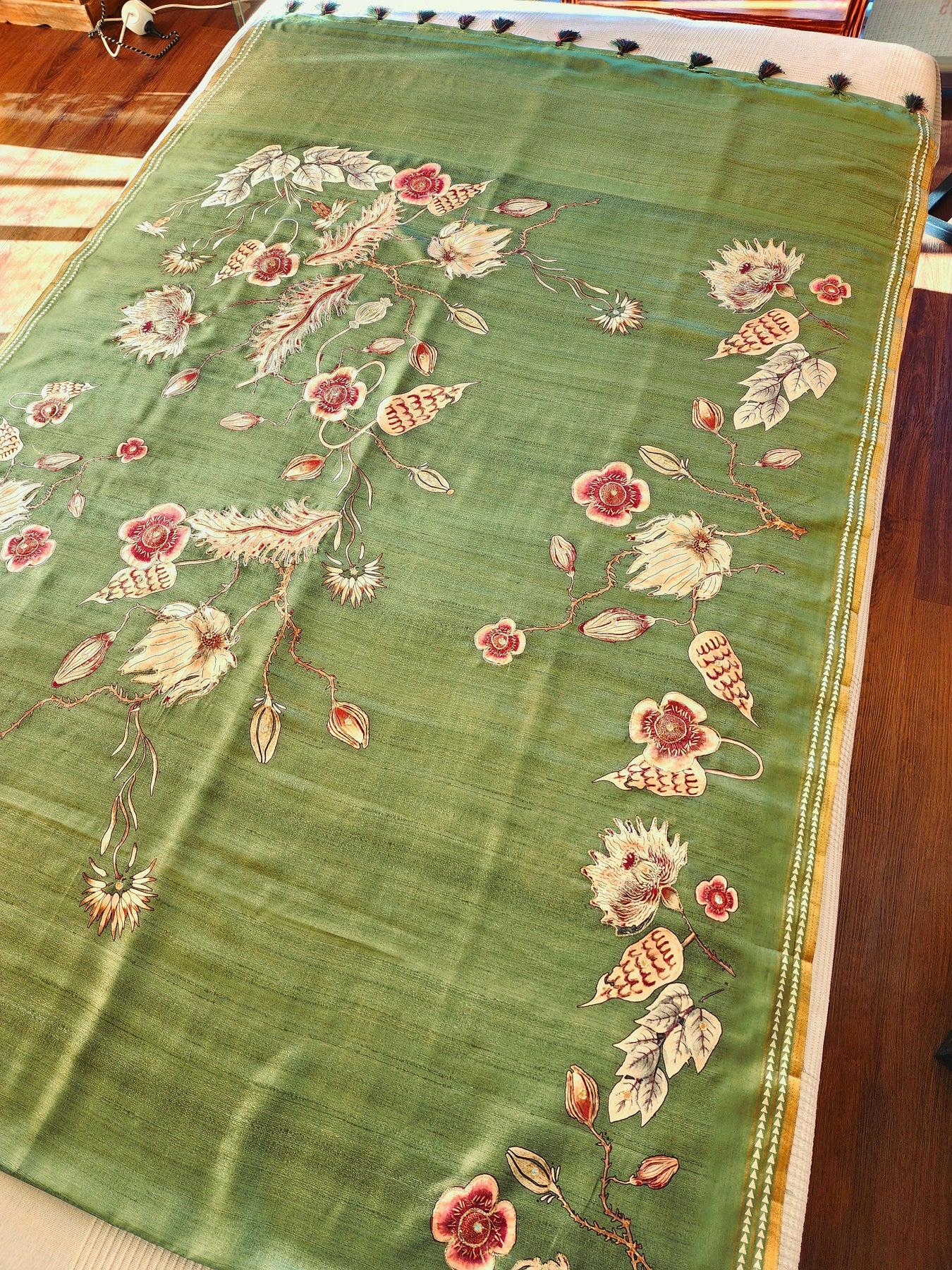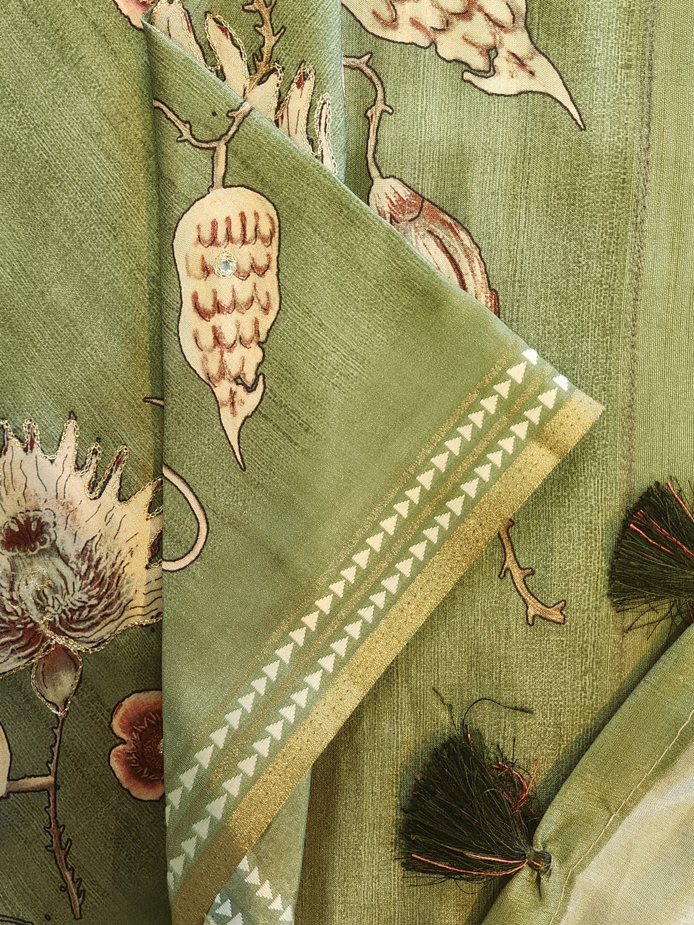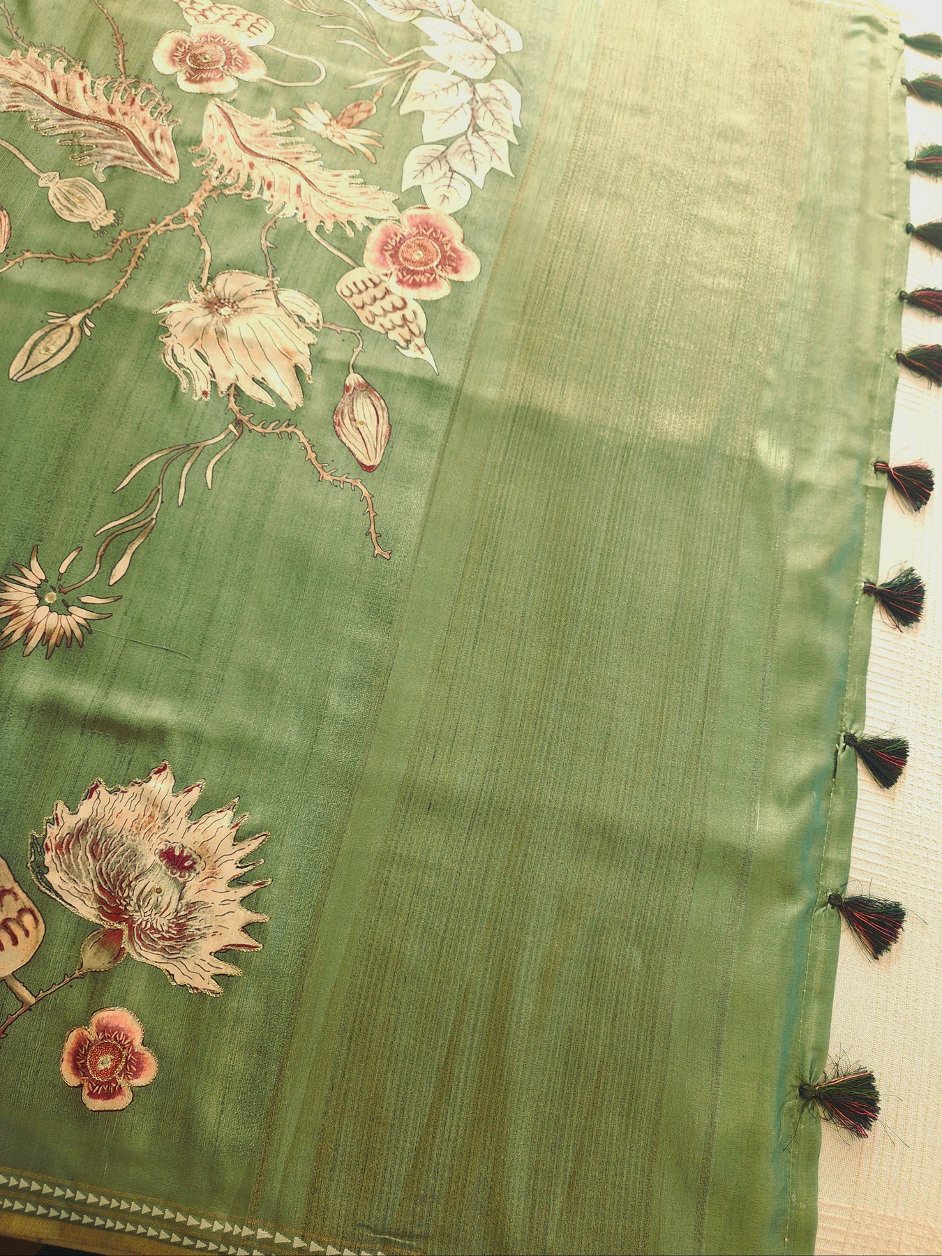 An elegant Semi Tussar Silk Saree with contrast borders and Digital Floral Prints on body of the saree