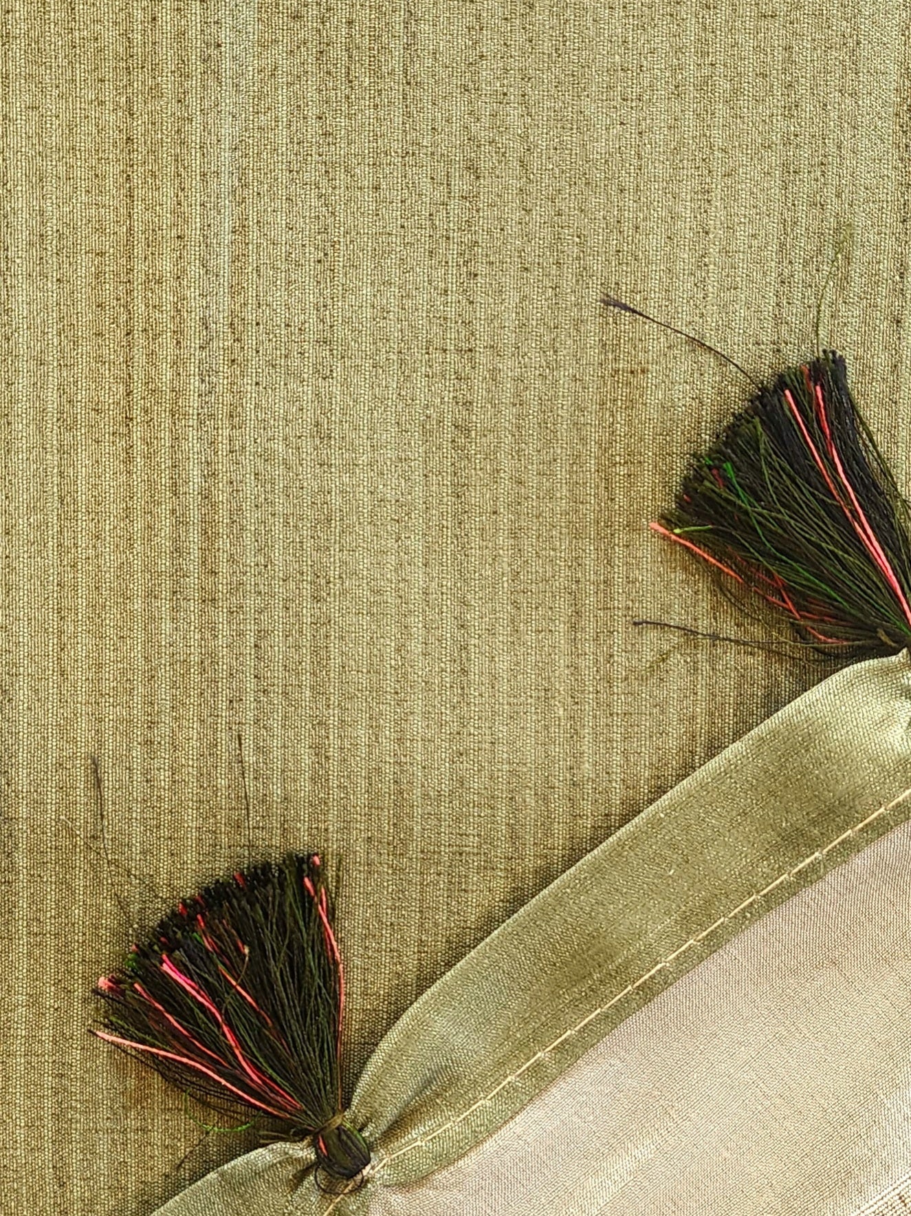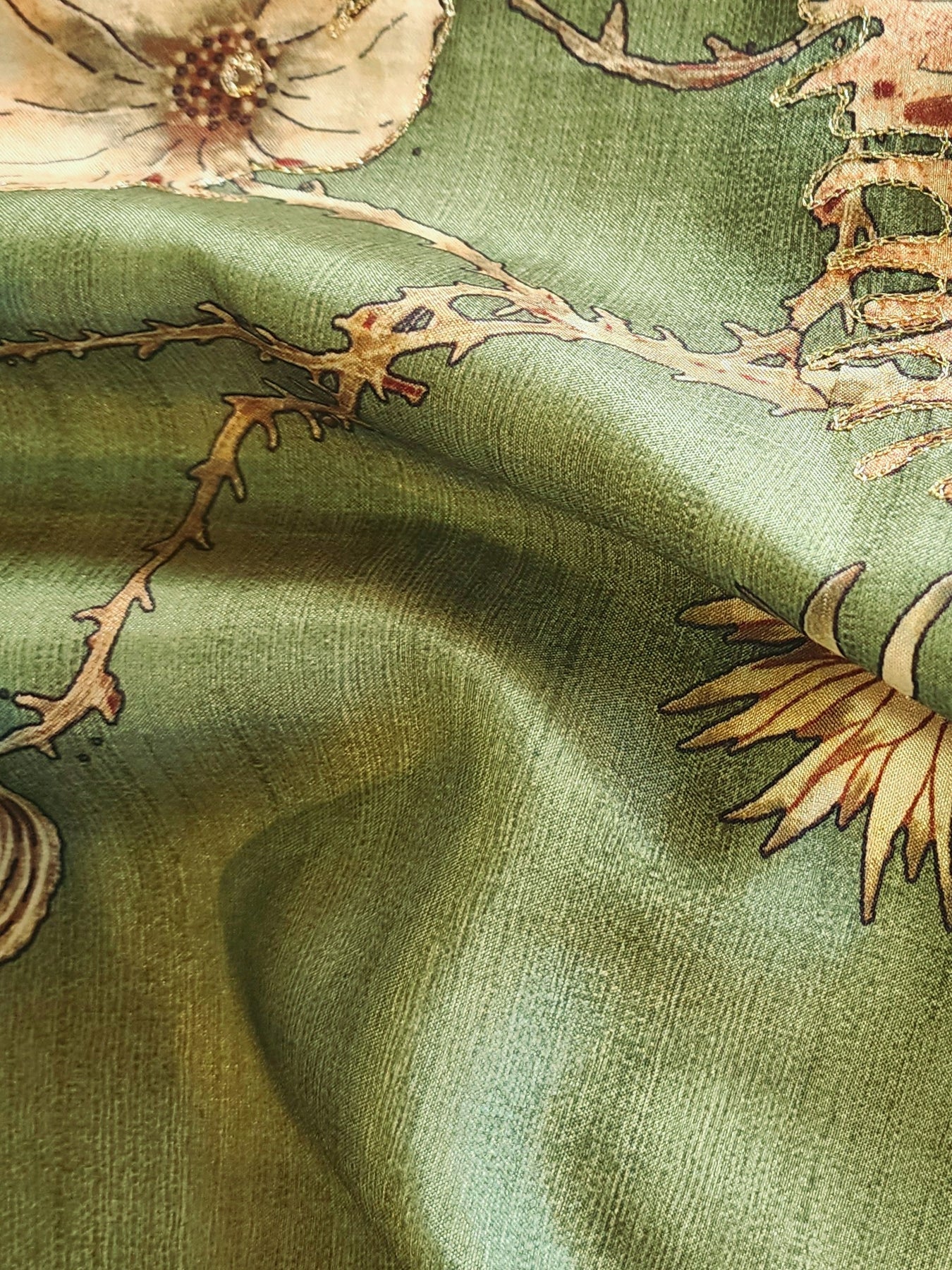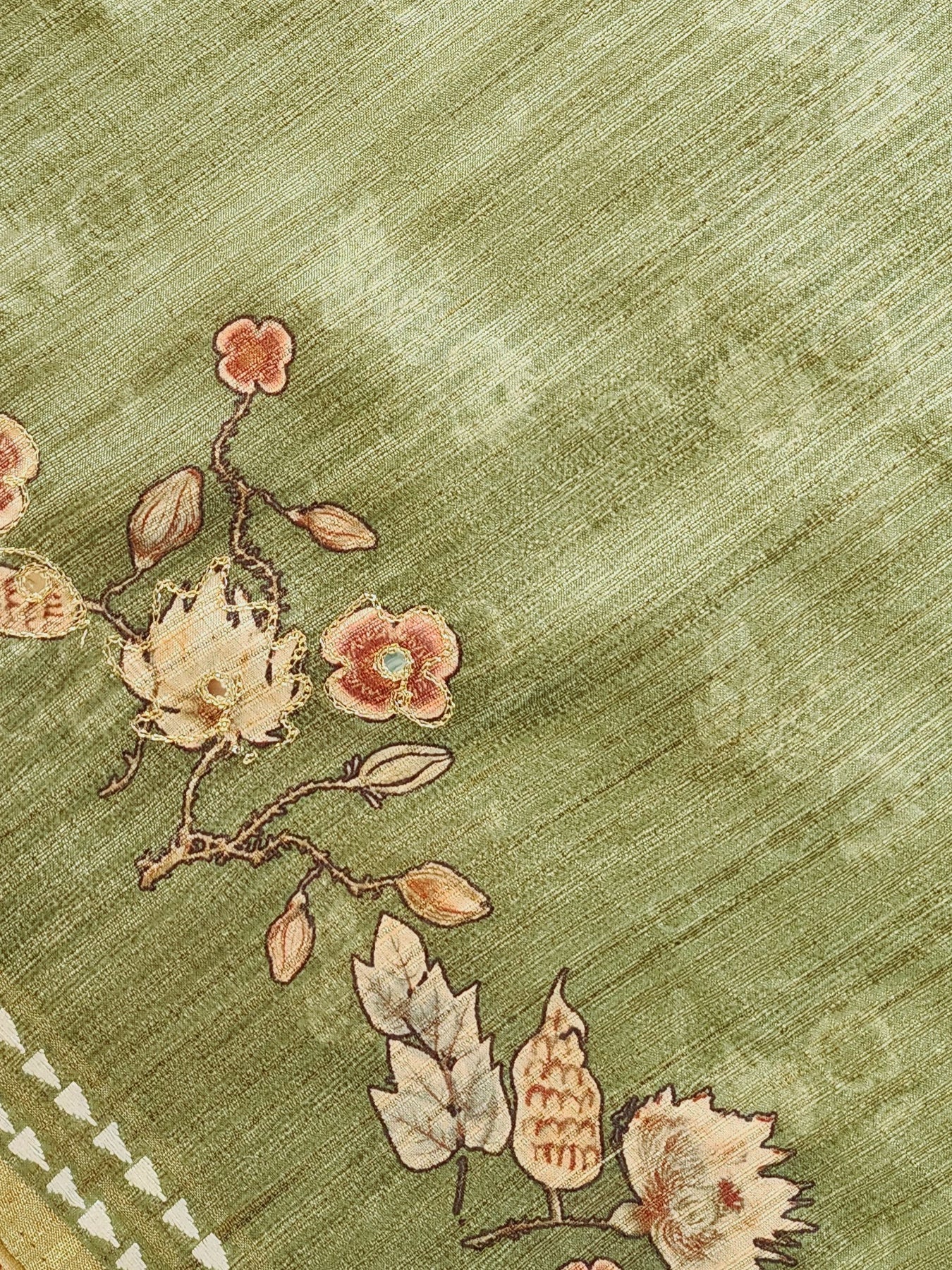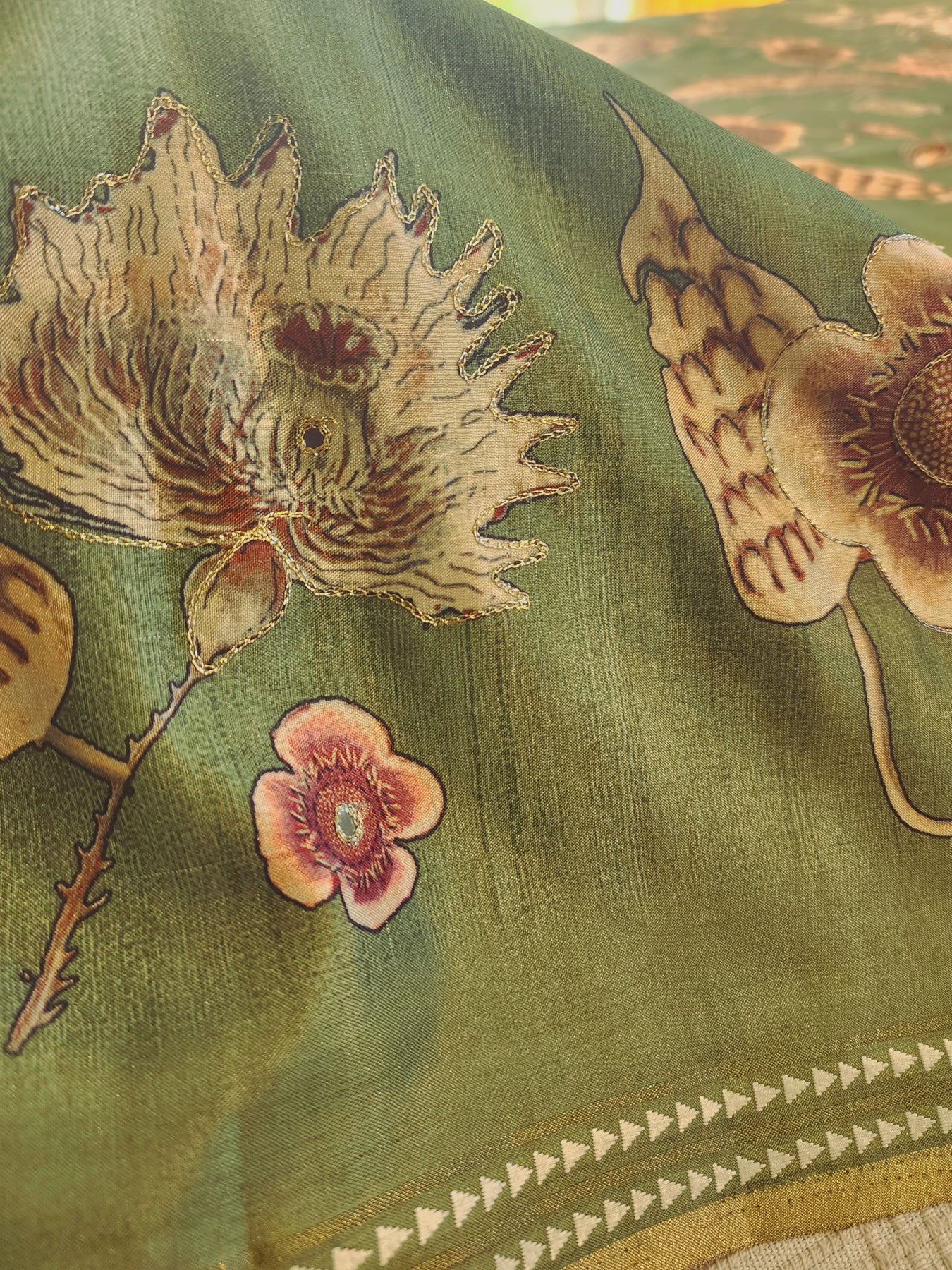 An elegant Semi Tussar Silk Saree with contrast borders and Digital Floral Prints on body of the saree