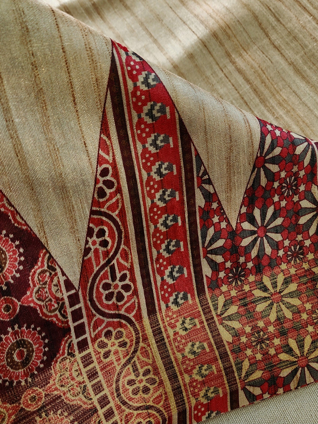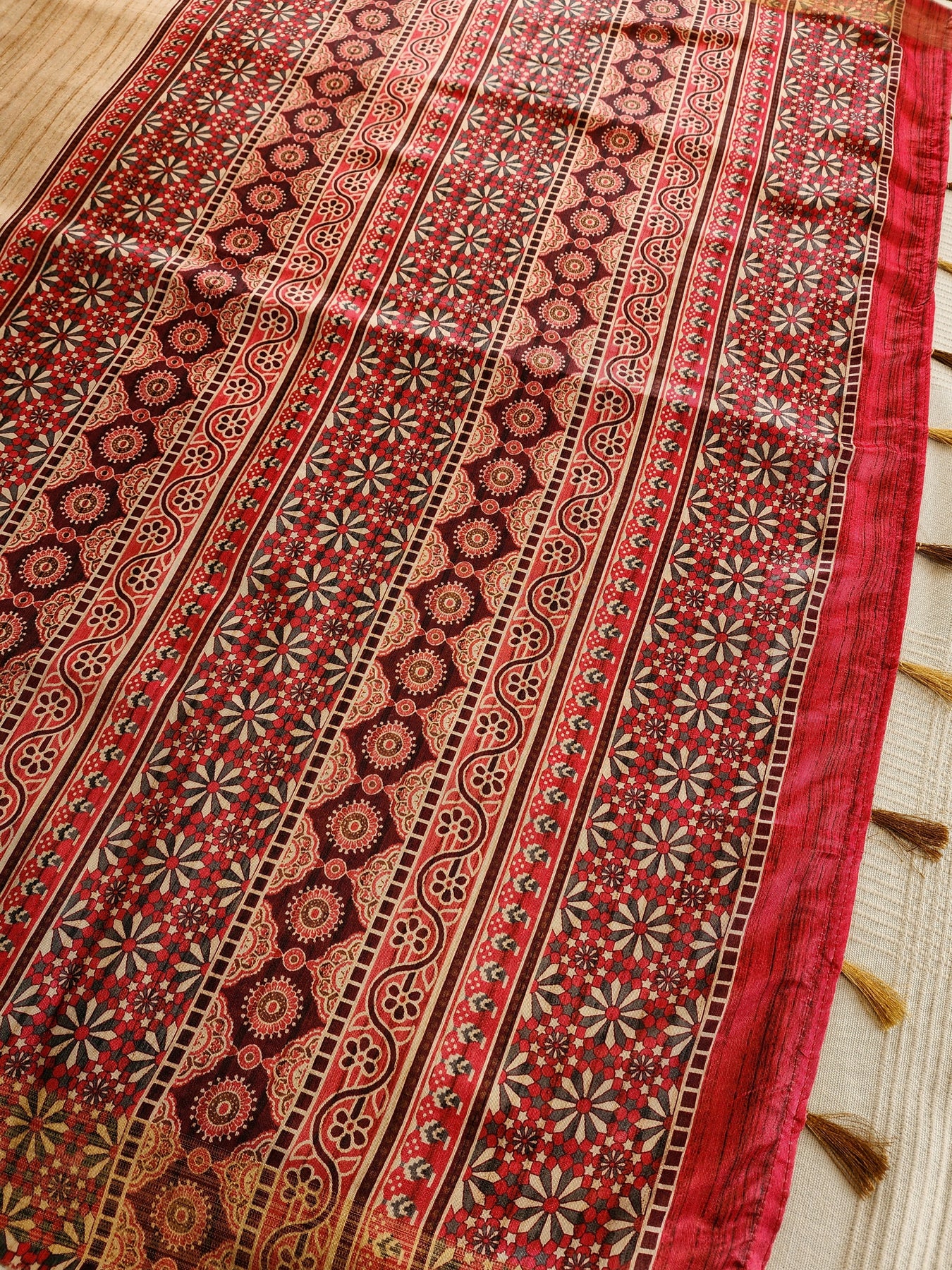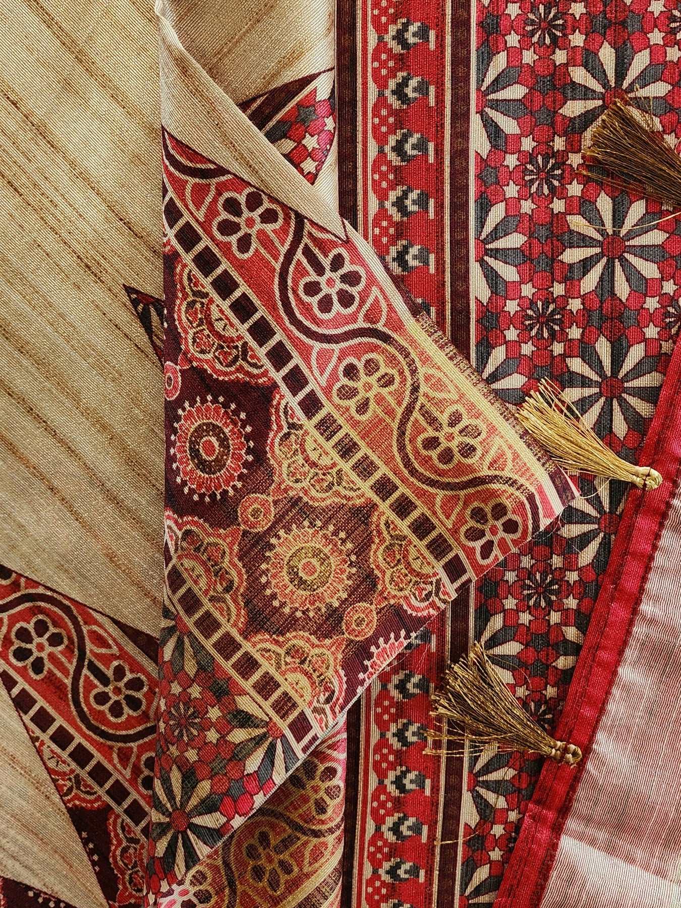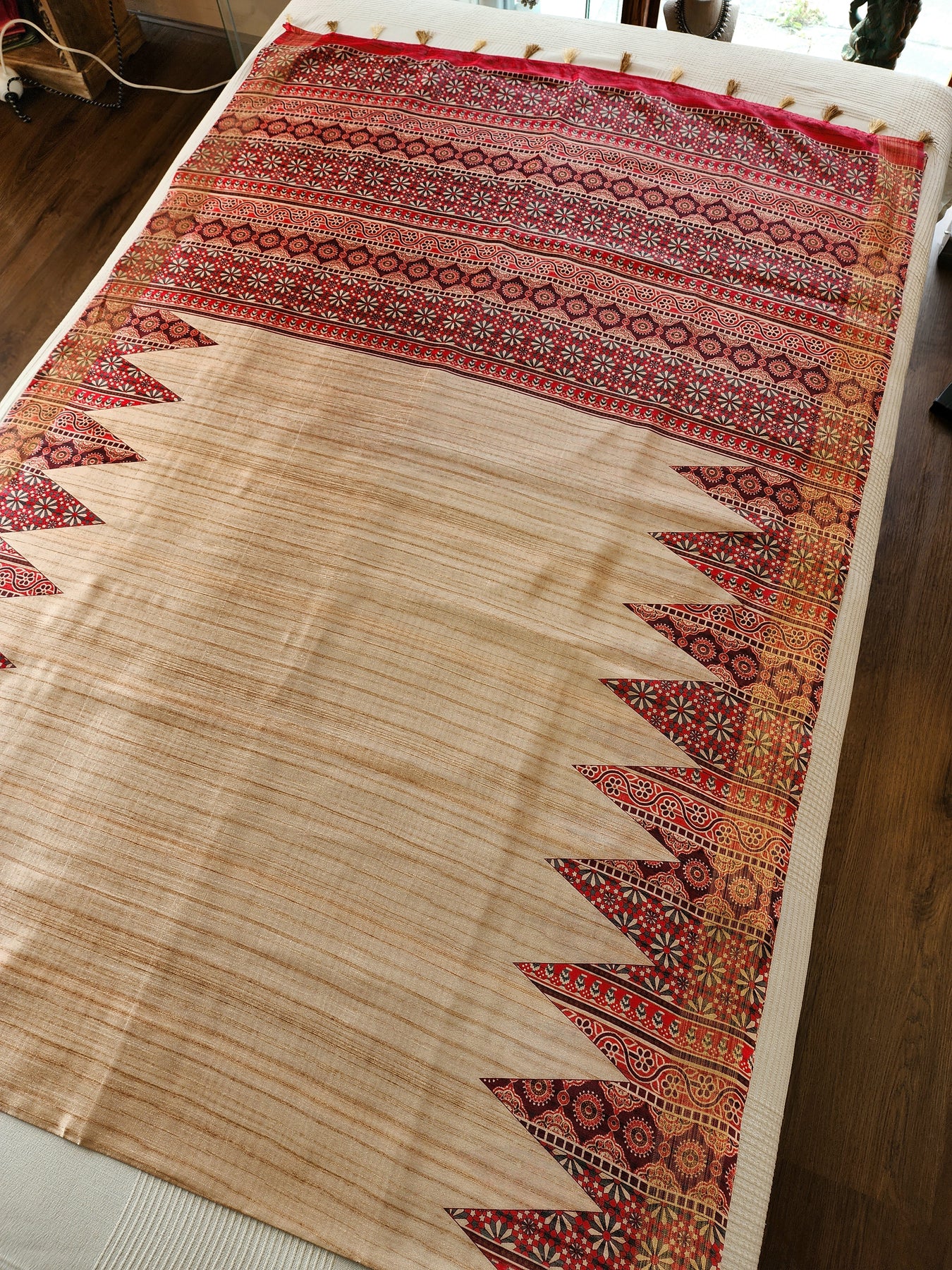 An elegant Tussar Silk Saree with contrast Temple Borders.