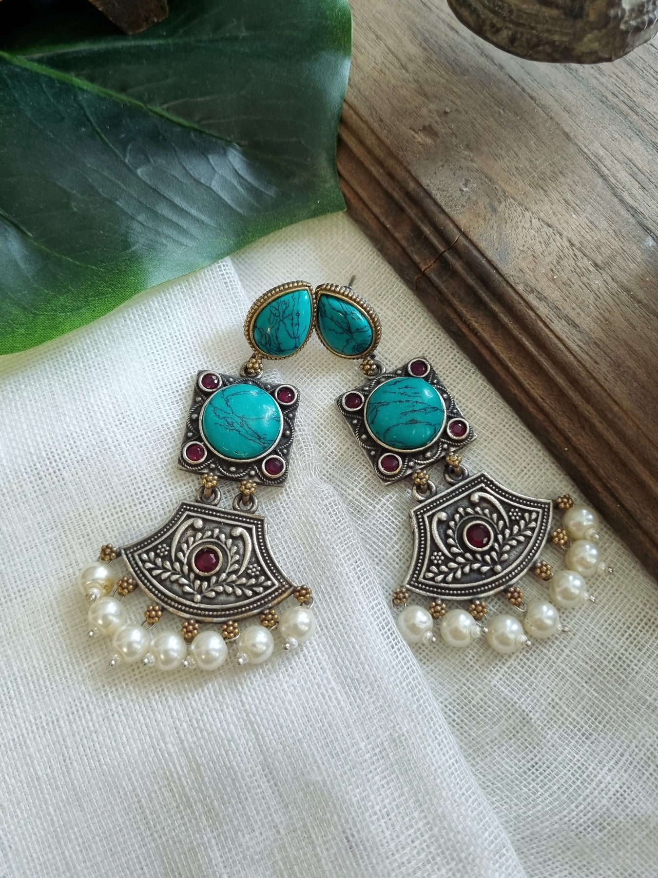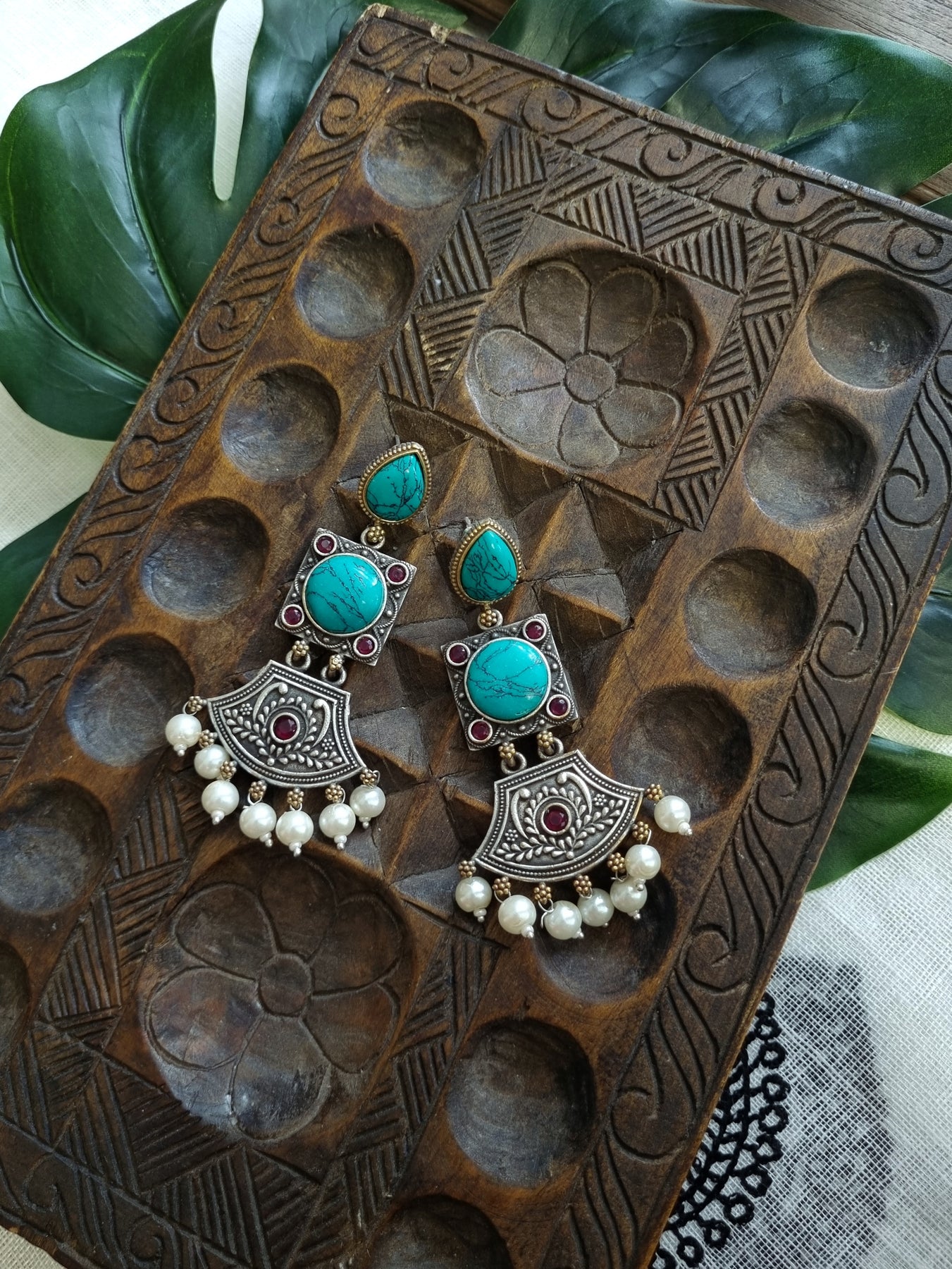 Dual Tone German Silver Earrings ornated with Blue and Red stones and Pearls