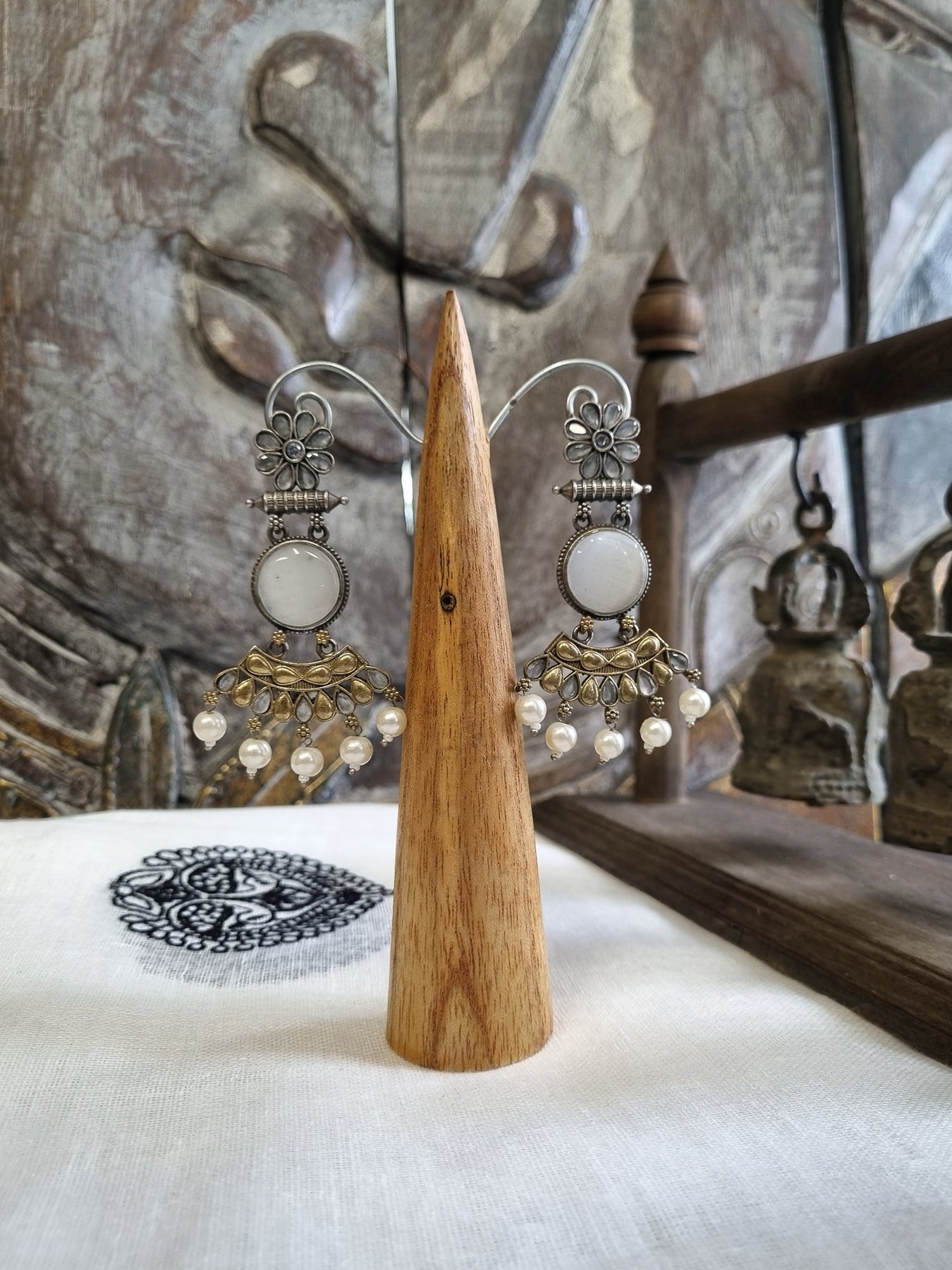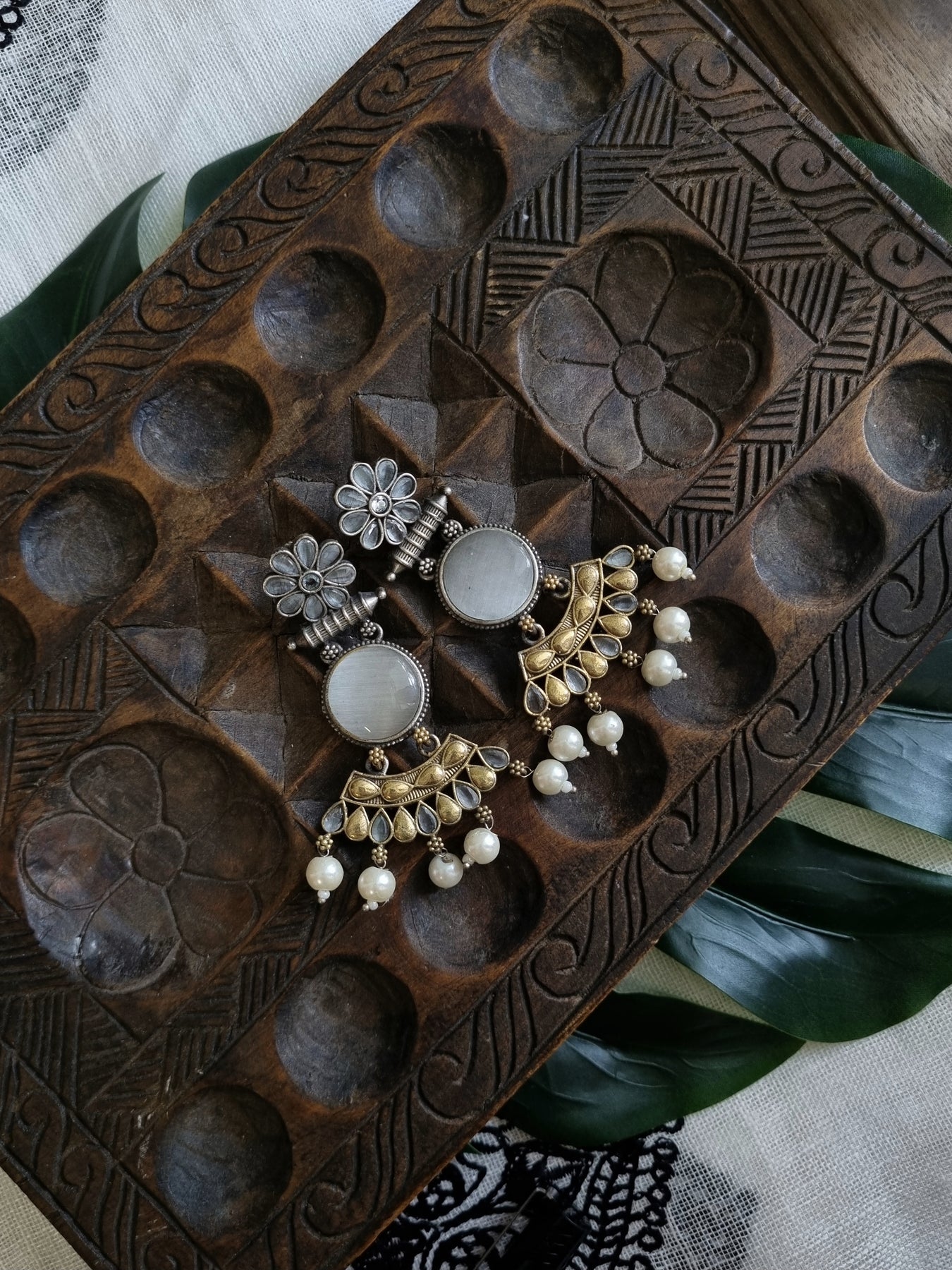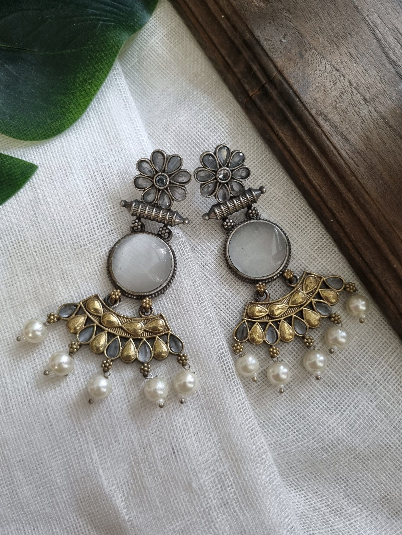 Dual Tone German Silver Earrings ornated with White stones and Pearls