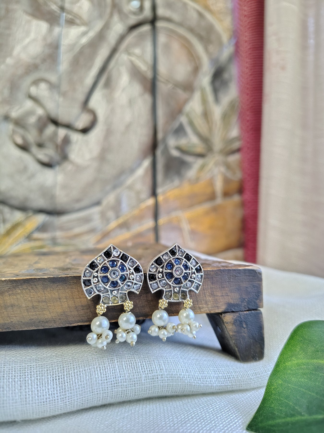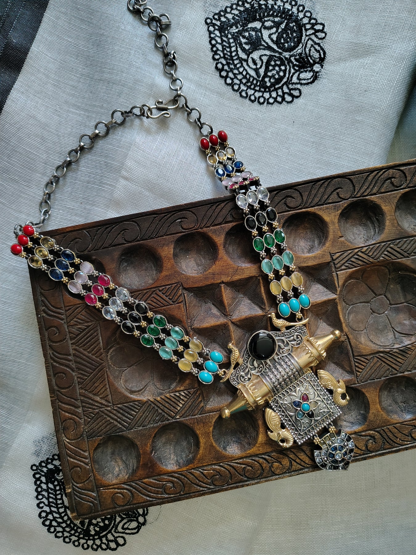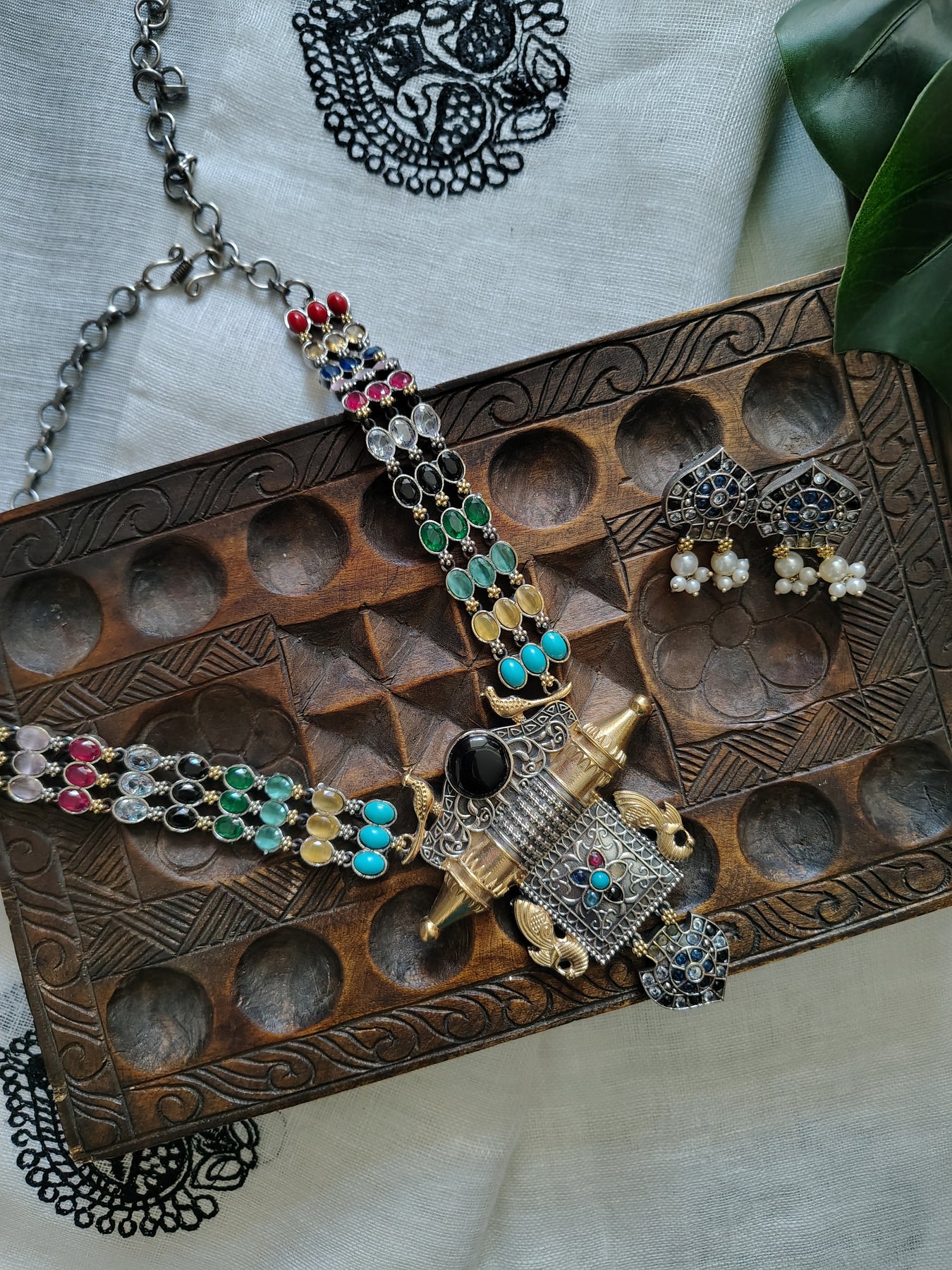 Dual Toned German Silver Necklace with Navaratna stones, paired with matching Earrings