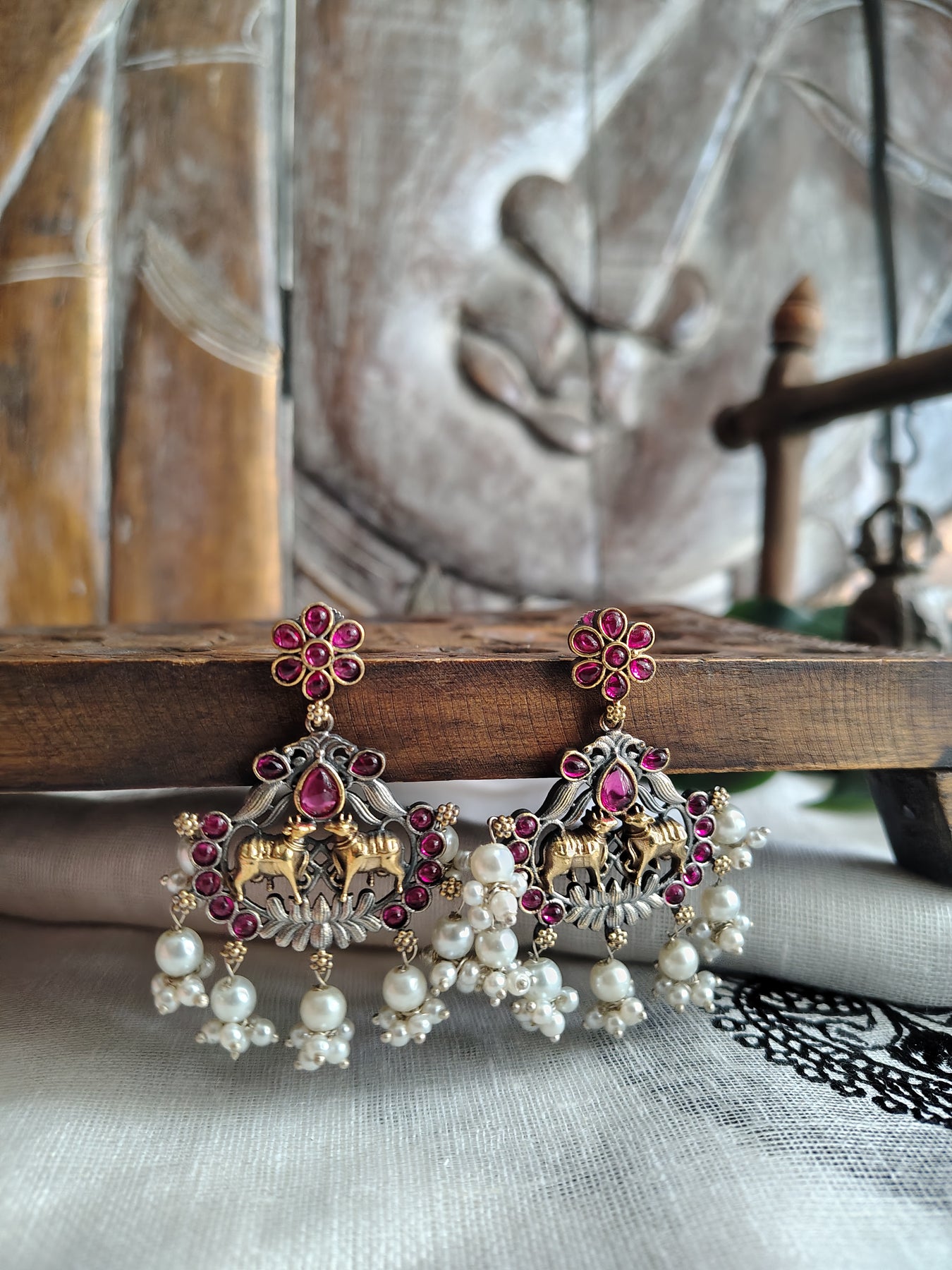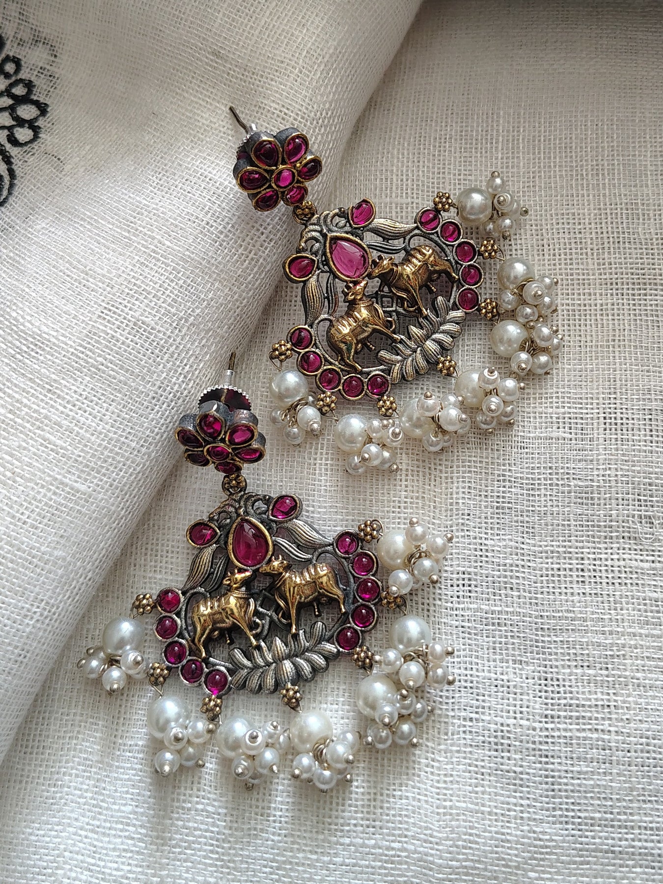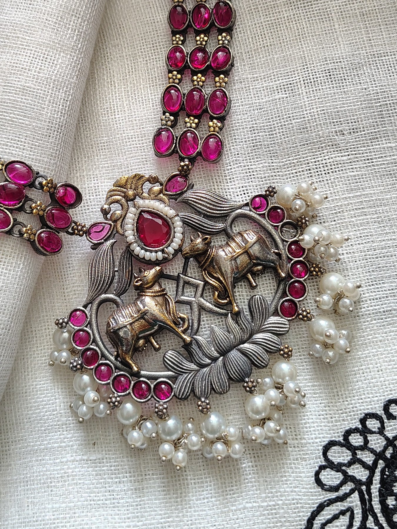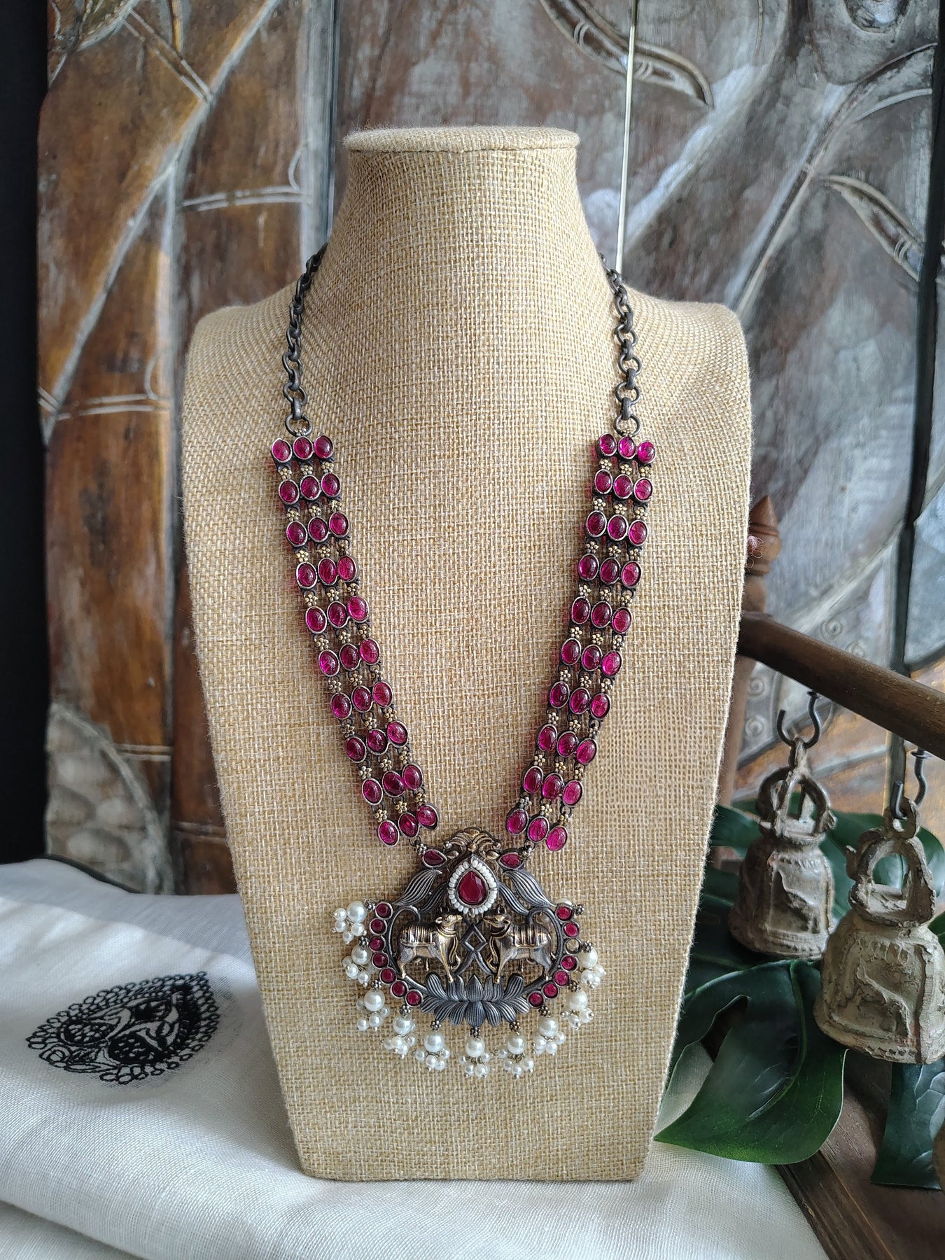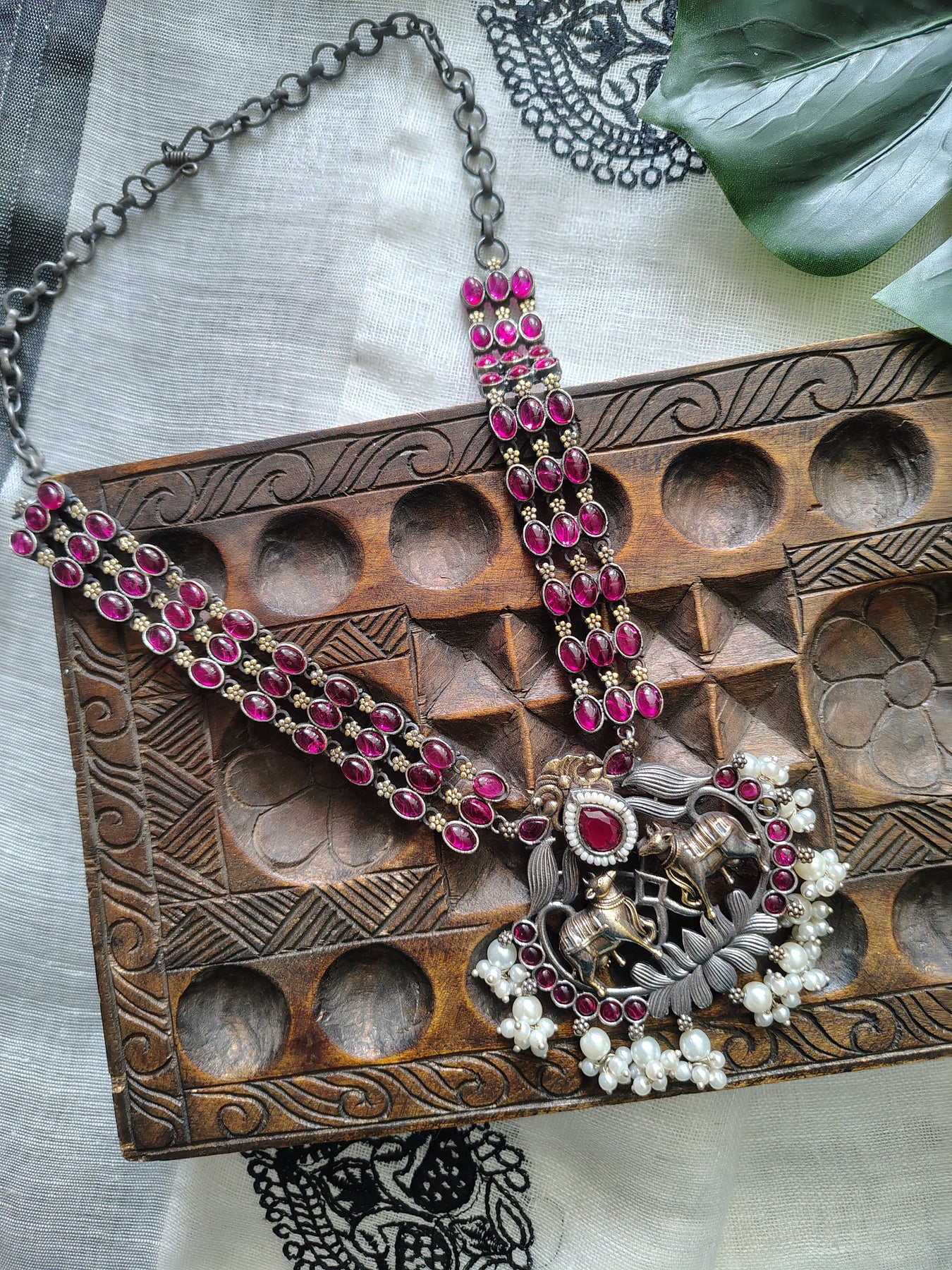 Dual Toned German Silver Necklace with Pink stones, paired with matching Earrings