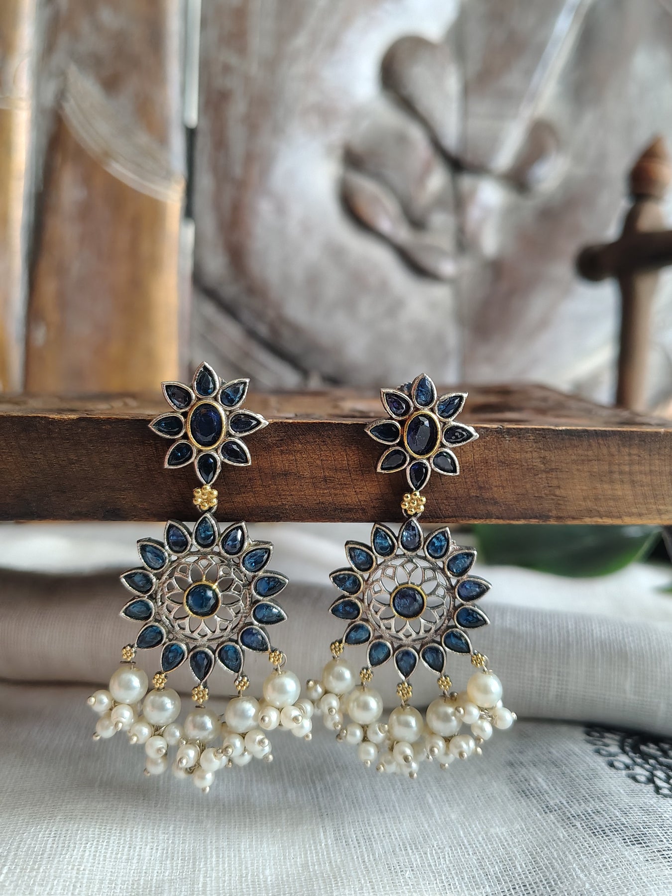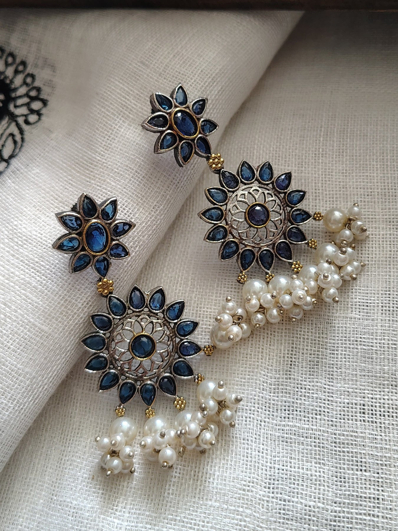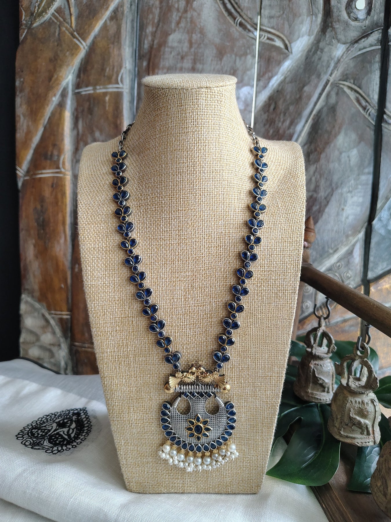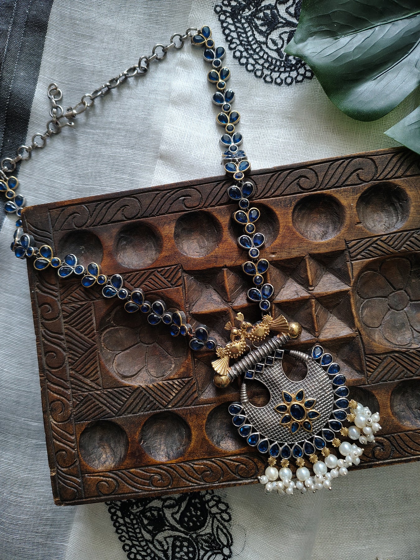 Dual Toned German Silver Necklace with Blue stones, paired with matching Earrings