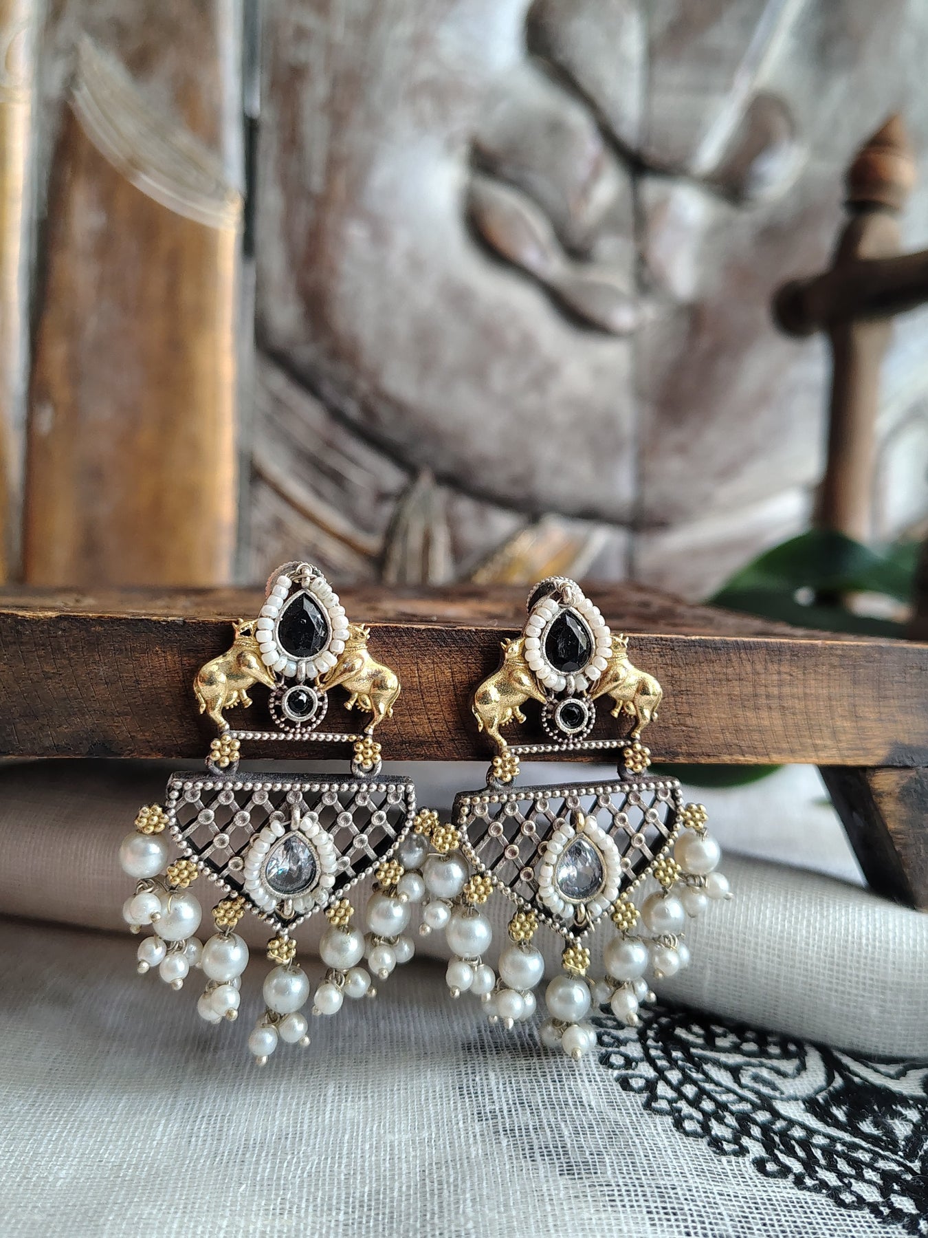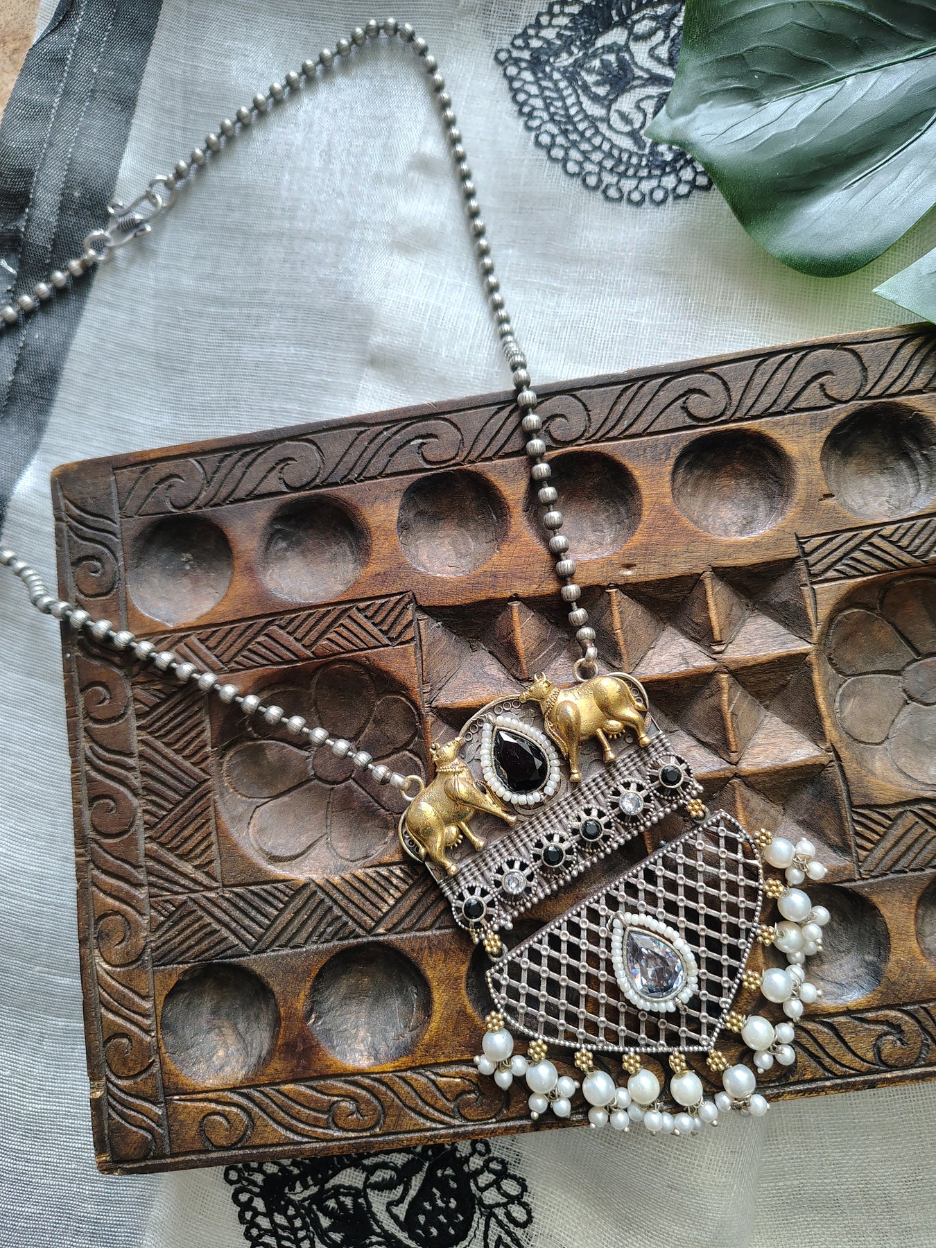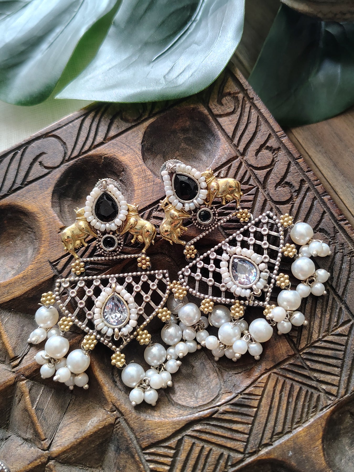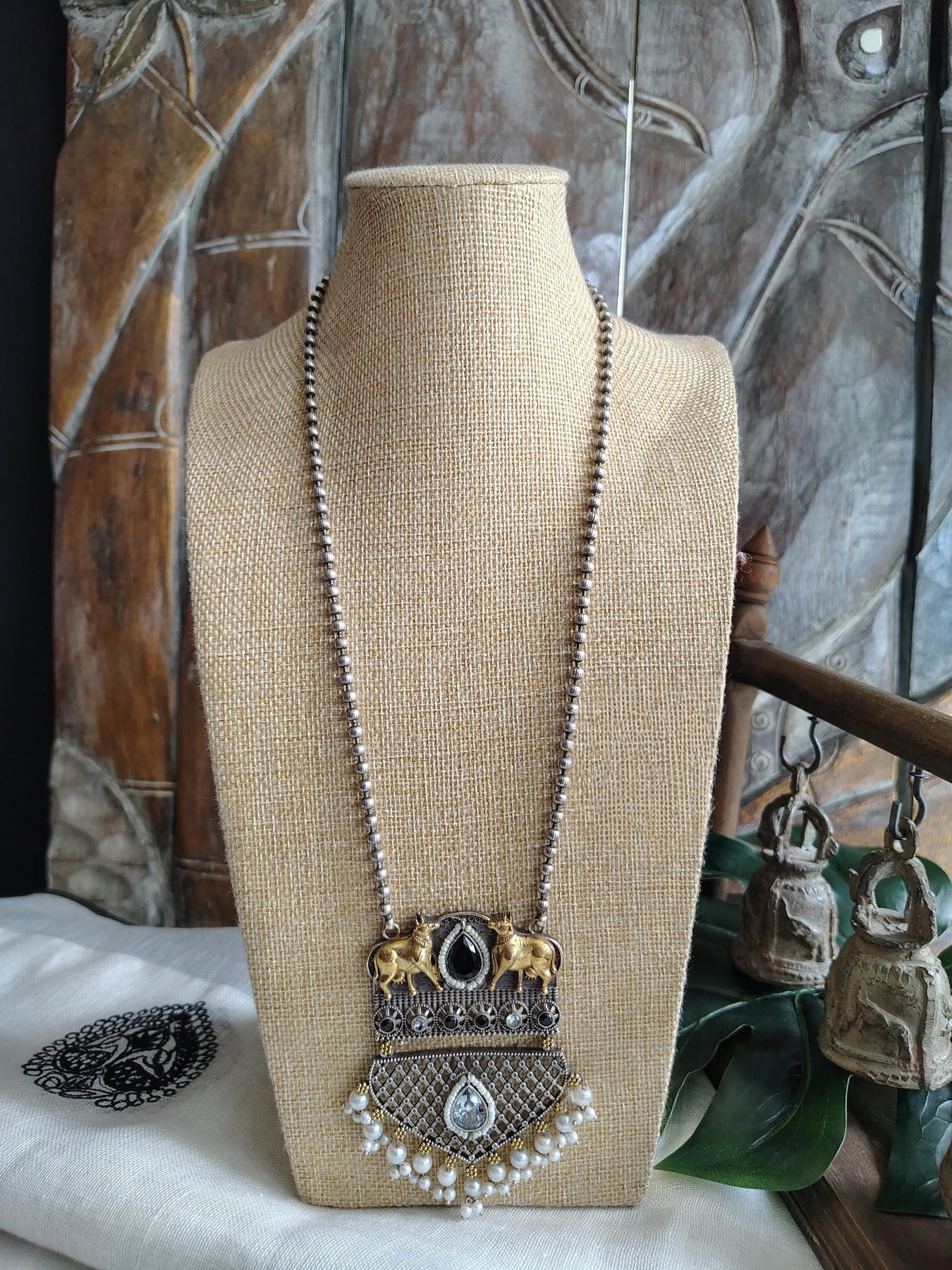 Dual Tone German Silver Statement Necklace with Black and White stones, paired with Earrings