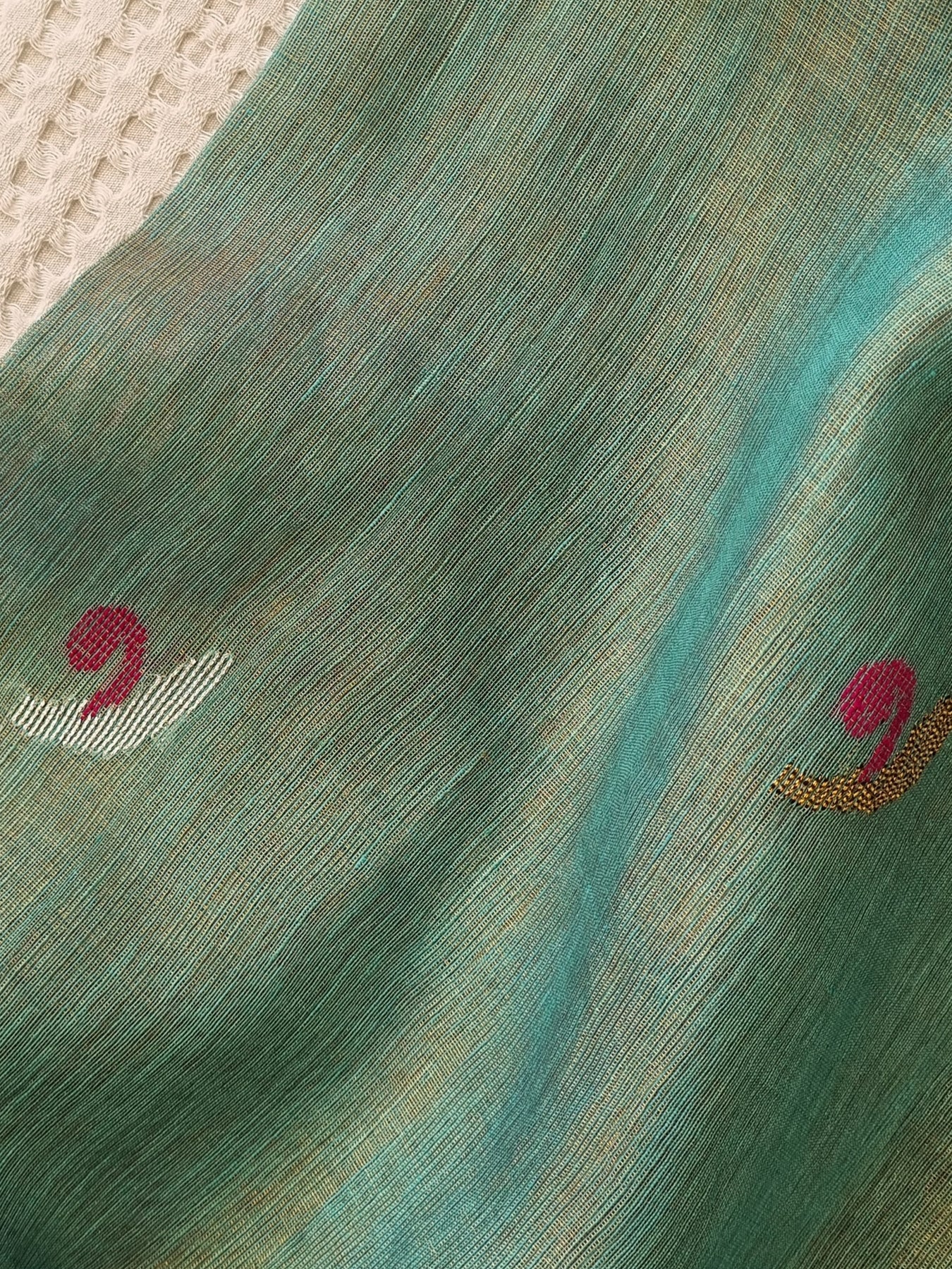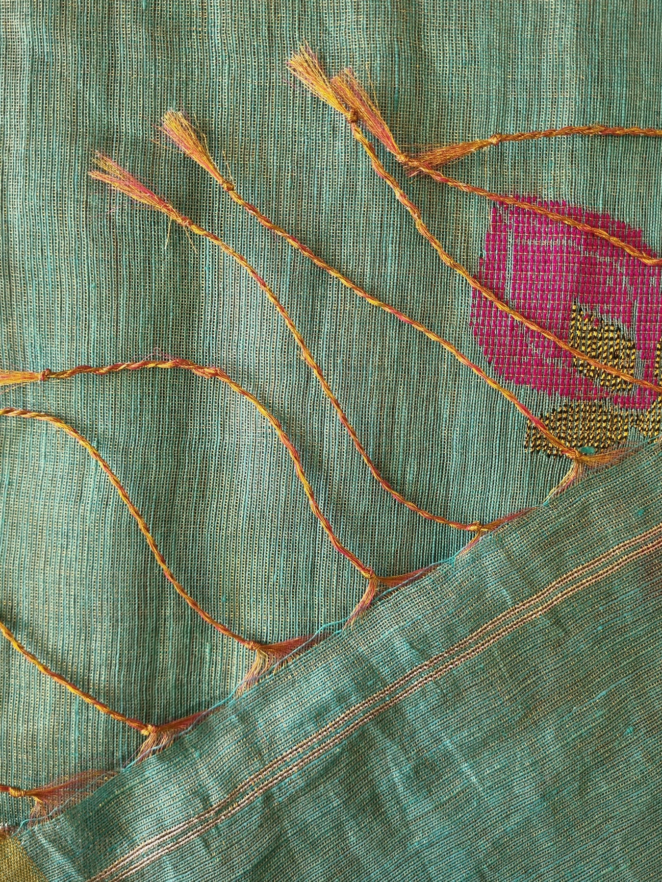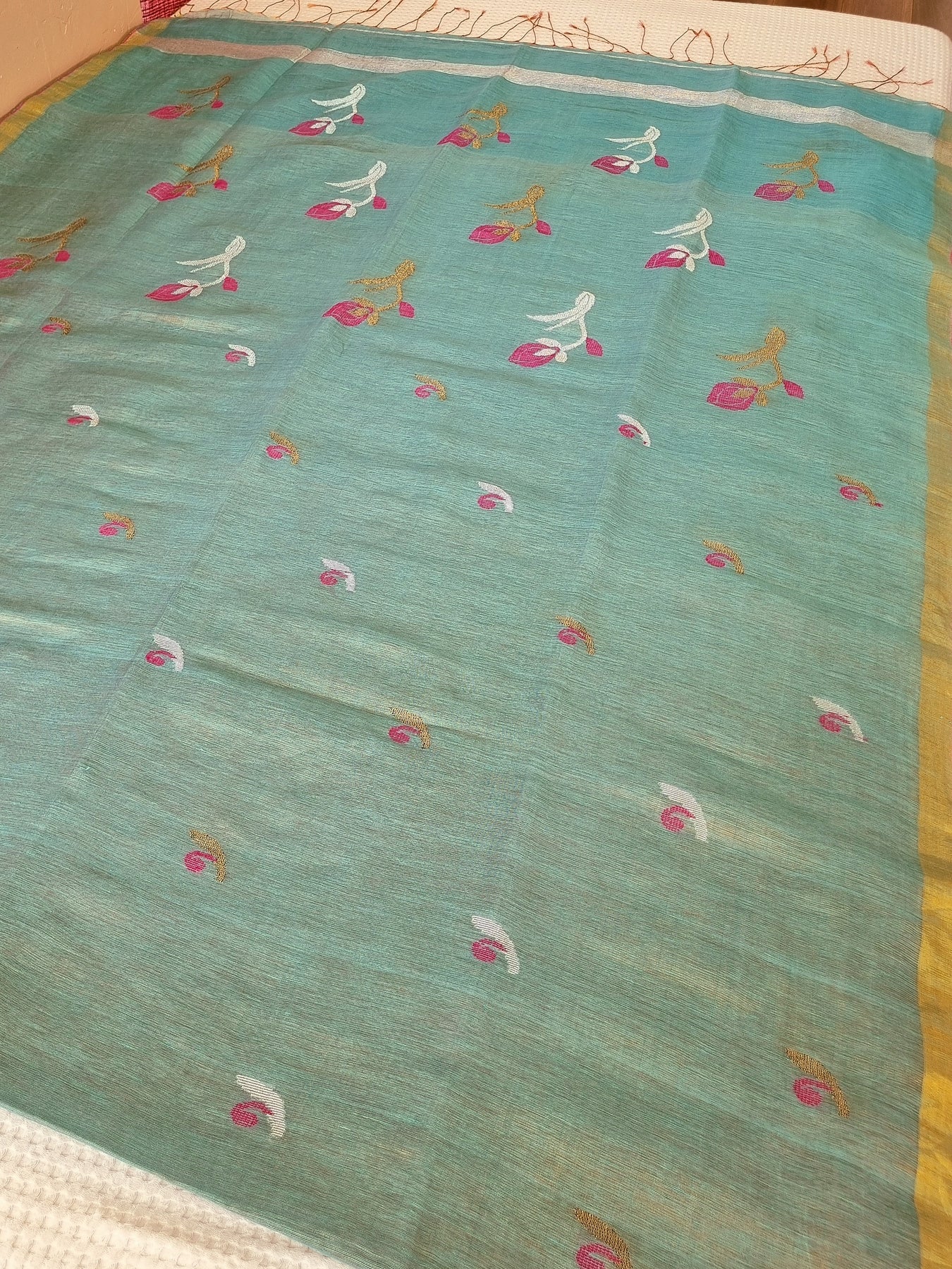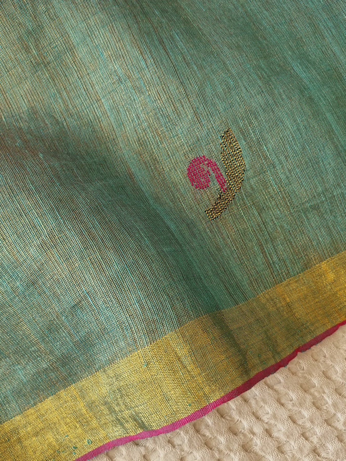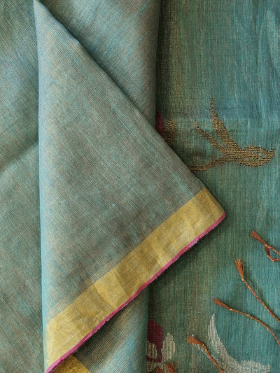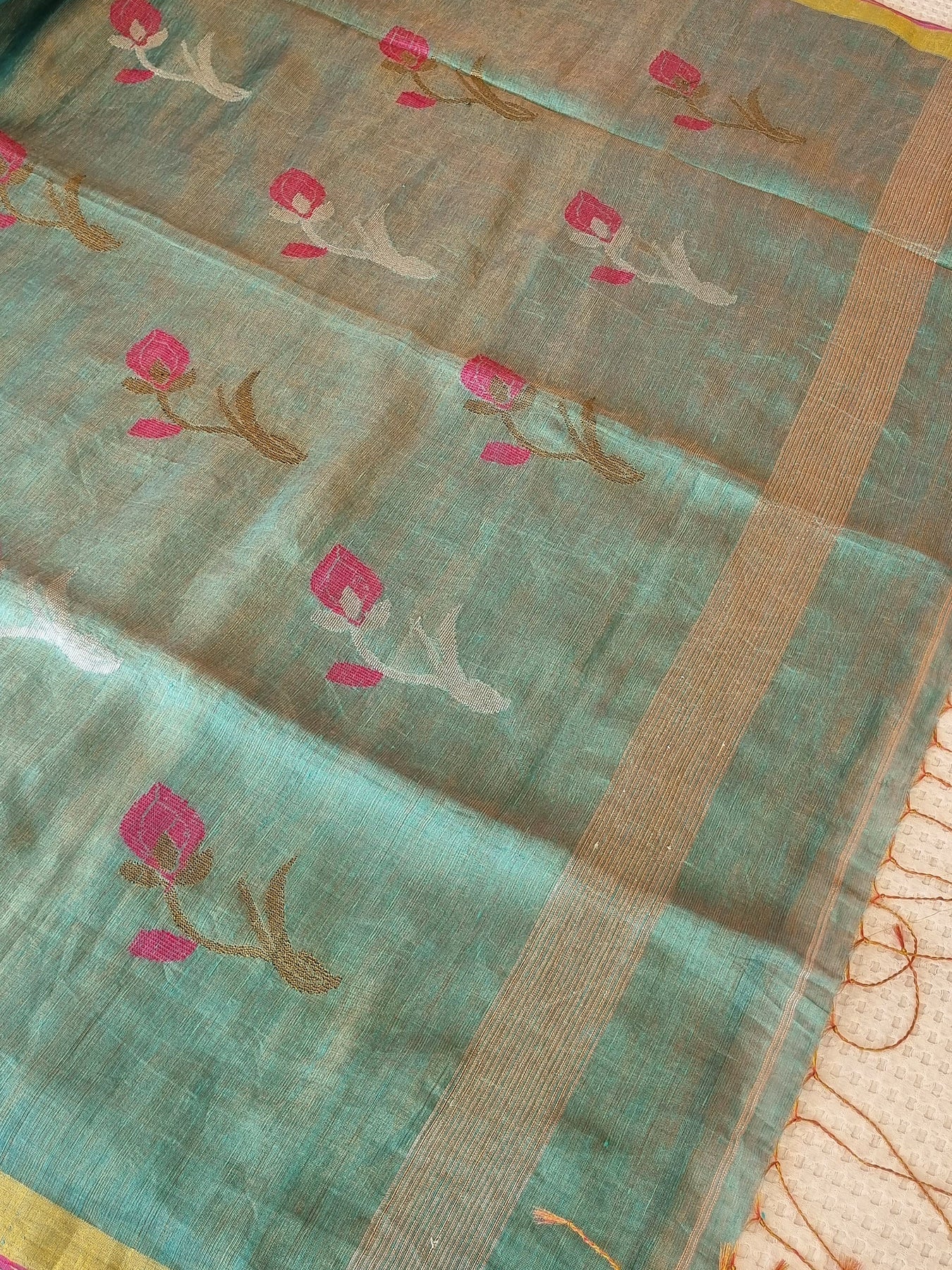 This elegant Tissue Linen Saree with Embroidery has a modern appeal