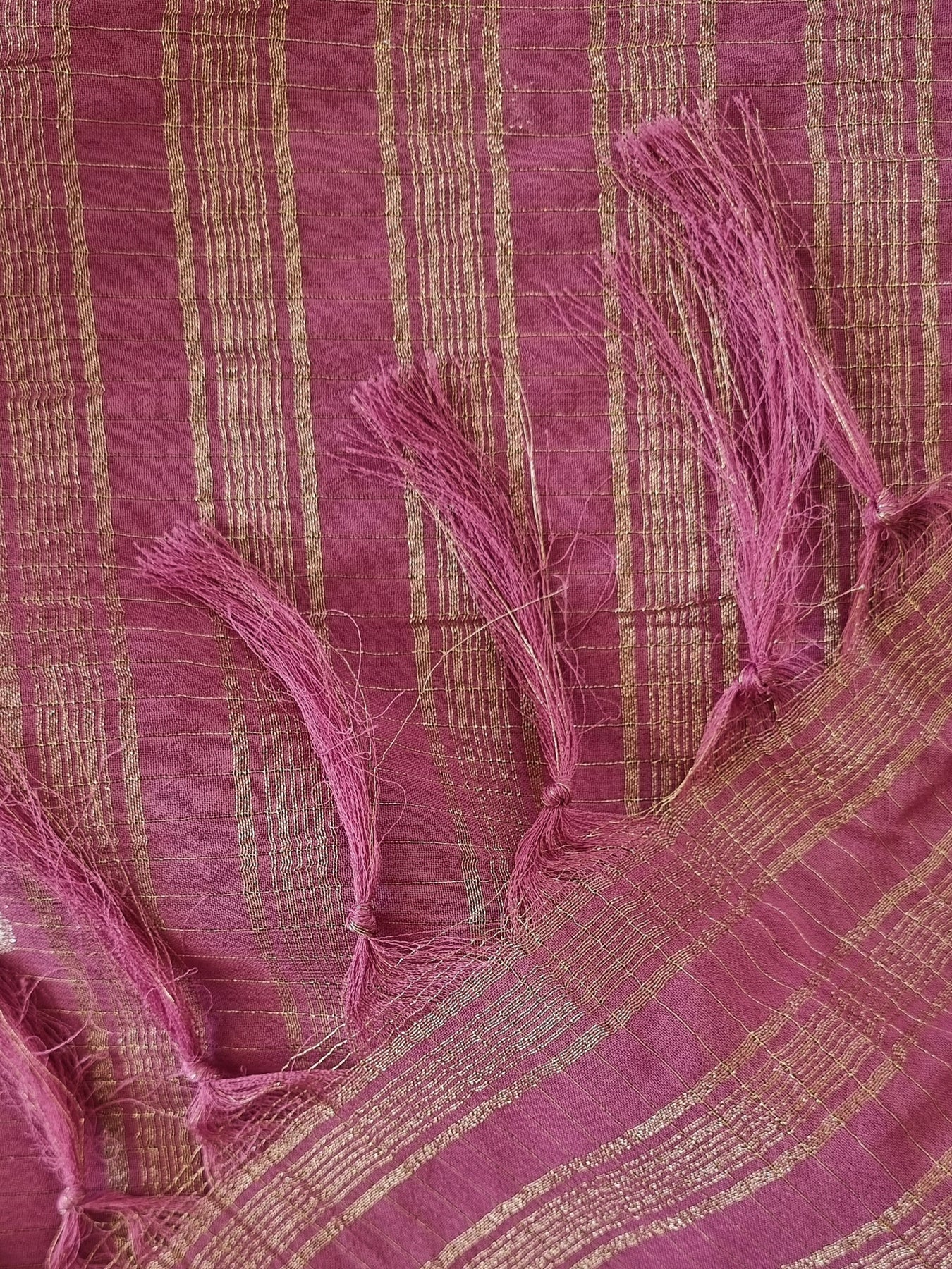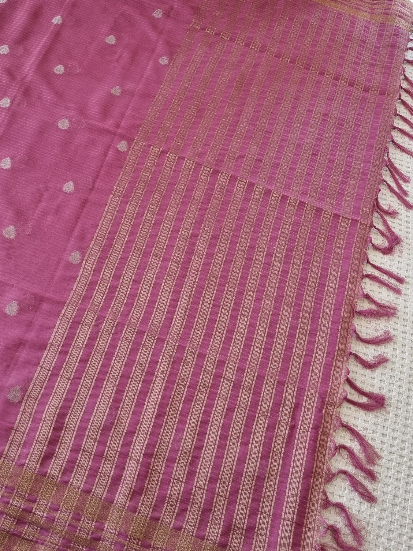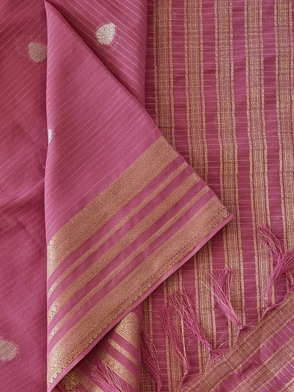 • An elegant Semi Georgette Saree with Zari strips on the body and a contrast blouse, beautifully finished with tassels