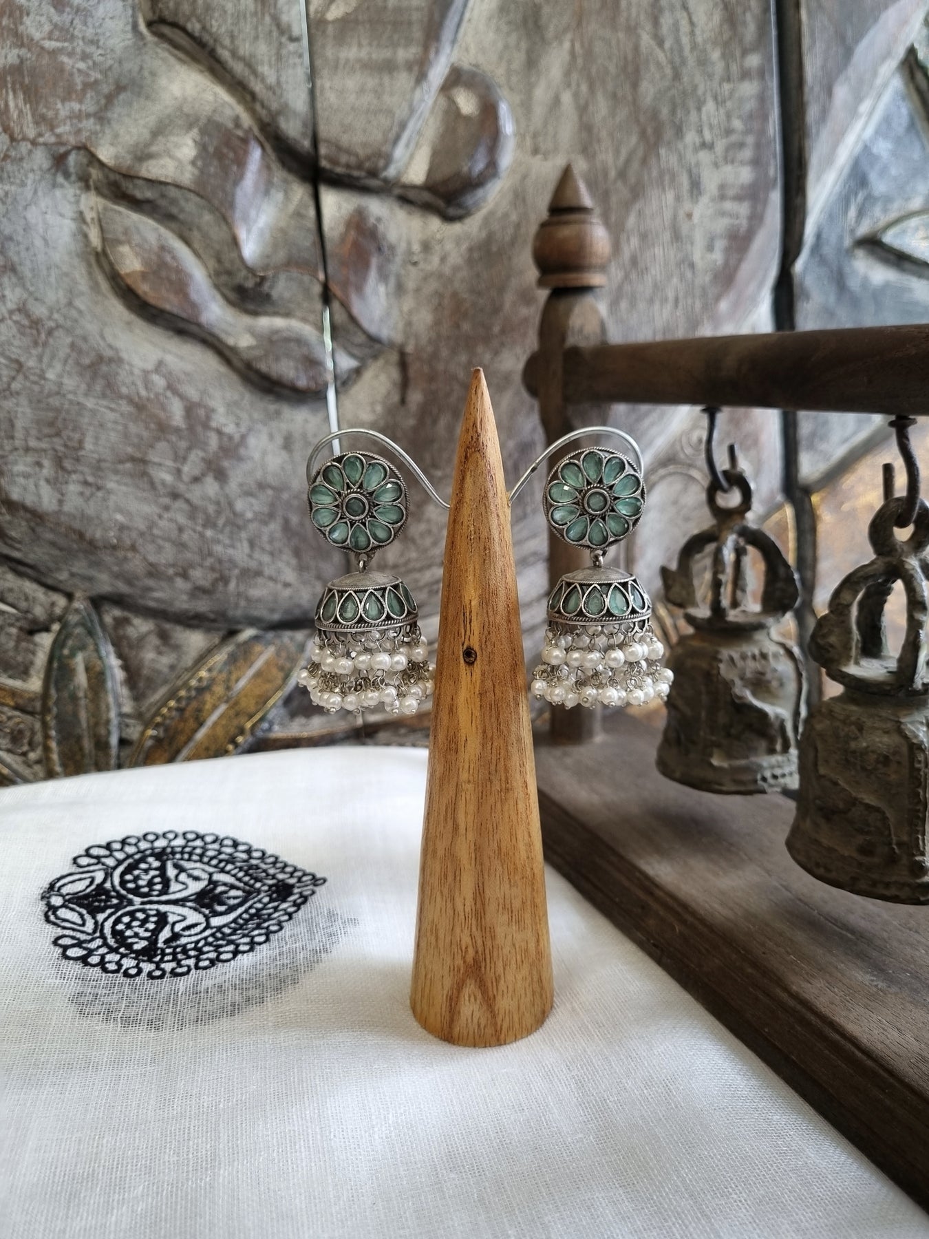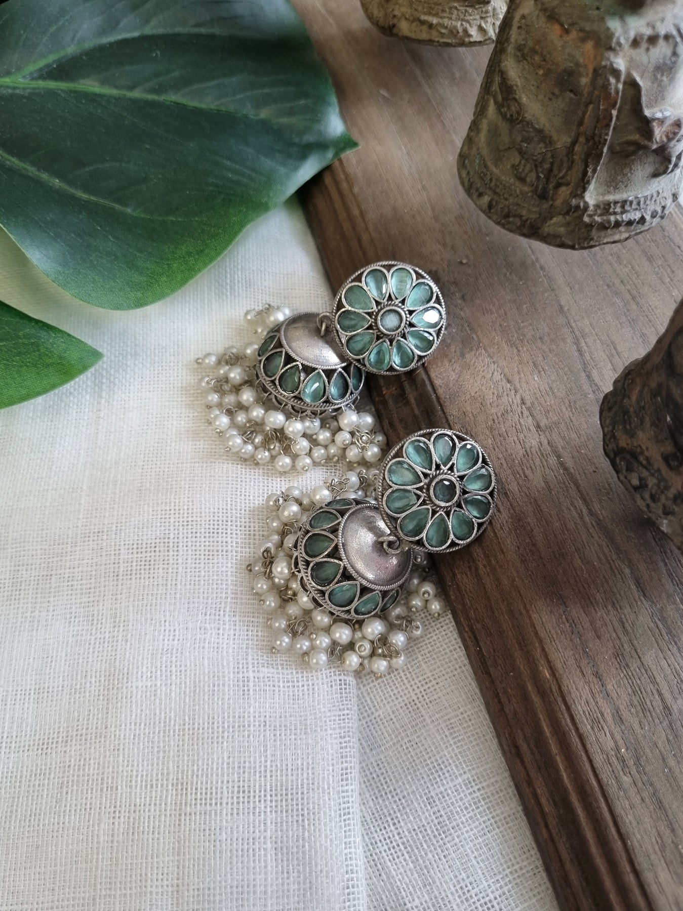 Premium Quality German Silver Jhumkas ornated with Blue stones and Pearls